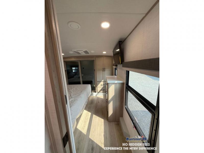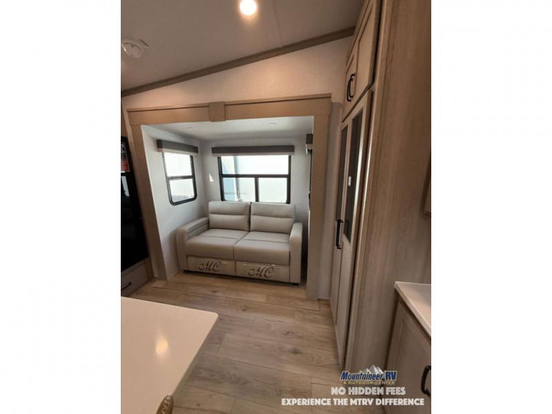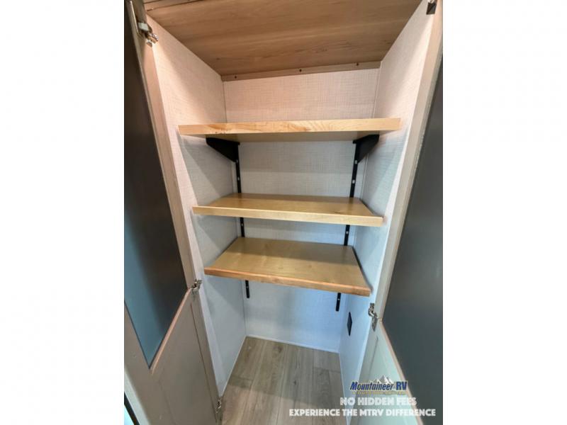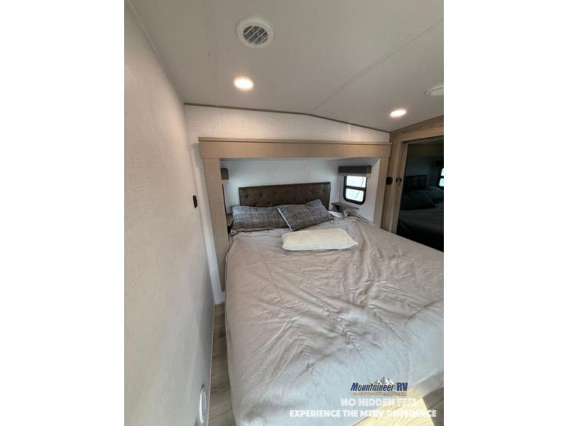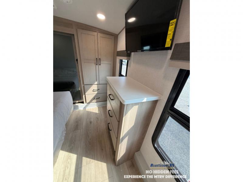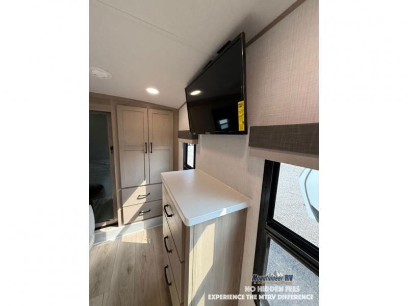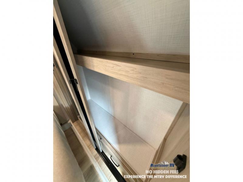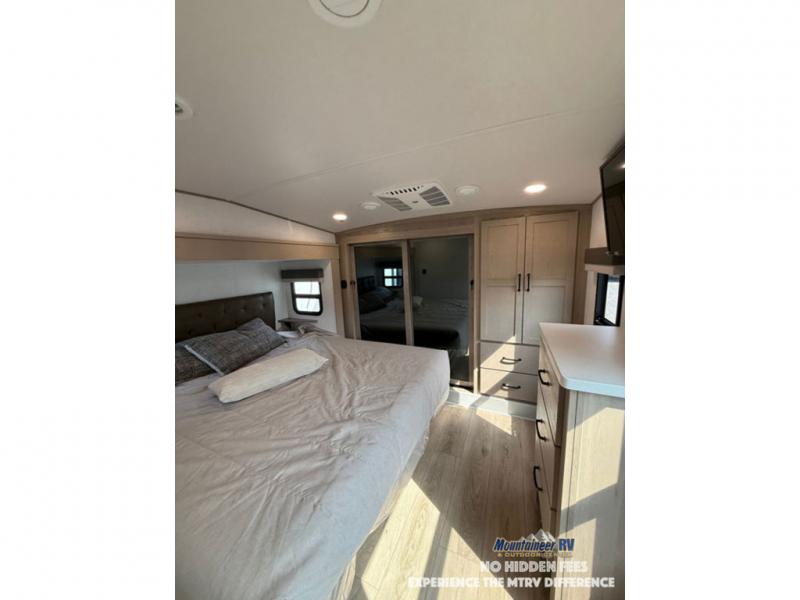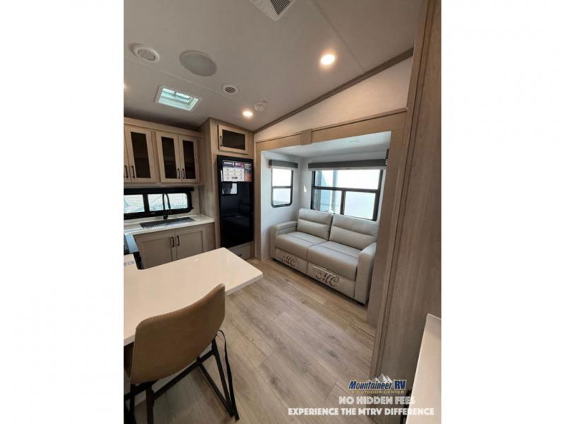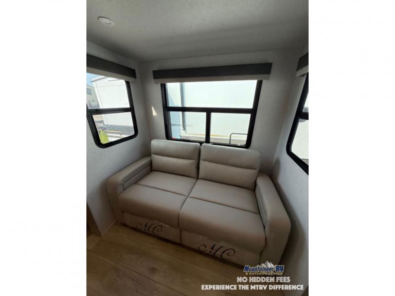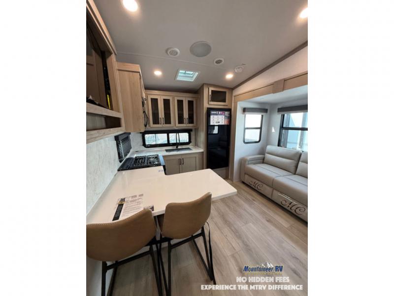 Looking for a spacious bedroom and bathroom for the perfect couple's RV with extra sleeping space for guests? This model provides a queen bed slide out for more interior floor space to get to the front wardrobe with shelves, and the dresser with a window above for great views of your campsite. The bathroom offers a shower with a seat, linen storage, and counter space for your toiletries. The main living and kitchen combined area has a hide-a-bed sofa slide that allows two guests to stay the night or you can choose the optional theater seat. There is also a breakfast bar with stools to dine at, and a U-shaped counter including appliances to make meals and store leftovers. And you will find exterior storage to bring along camping chairs and extra gear.