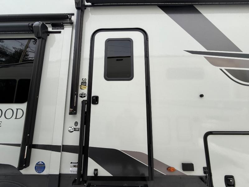With any Rockwood Signature fifth wheel or travel trailer by Forest River RV, you will enjoy superior construction that includes laminated white fiberglass sidewalls, a radius roof with vaulted interior ceilings, plus radiant foil insulation and an enclosed underbelly for use in all types of weather. Some convenient exterior features include Keyed Alike locks, a rear ladder, a 200W solar panel, and a tire pressure monitor system with a monitor for added safety. The interior offers a One Touch OneControl panel with WeRV app control, for lights, awning, slides, water heater and more, and the Air 360+ omnidirectional antenna with WiFi prep lets you work while away from home if needed. You will also appreciate the interior vaulted ceilings, residential soft close doors and drawers, solid surface kitchen countertops, The 2025 Forest River Rockwood Signature 331RL is a luxurious and spacious travel trailer designed for both comfort and adventure. It's a perfect fit for those who want to enjoy the great outdoors without sacrificing the comforts of home. Here's an overview of its key features: