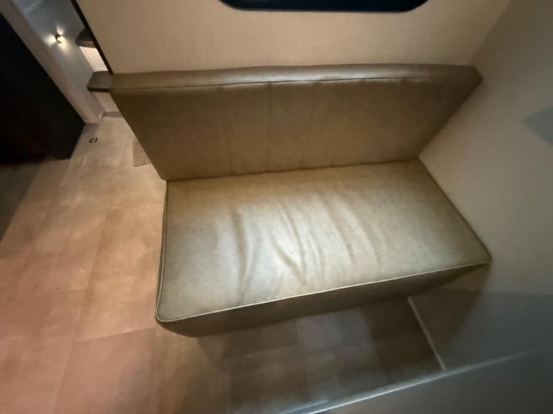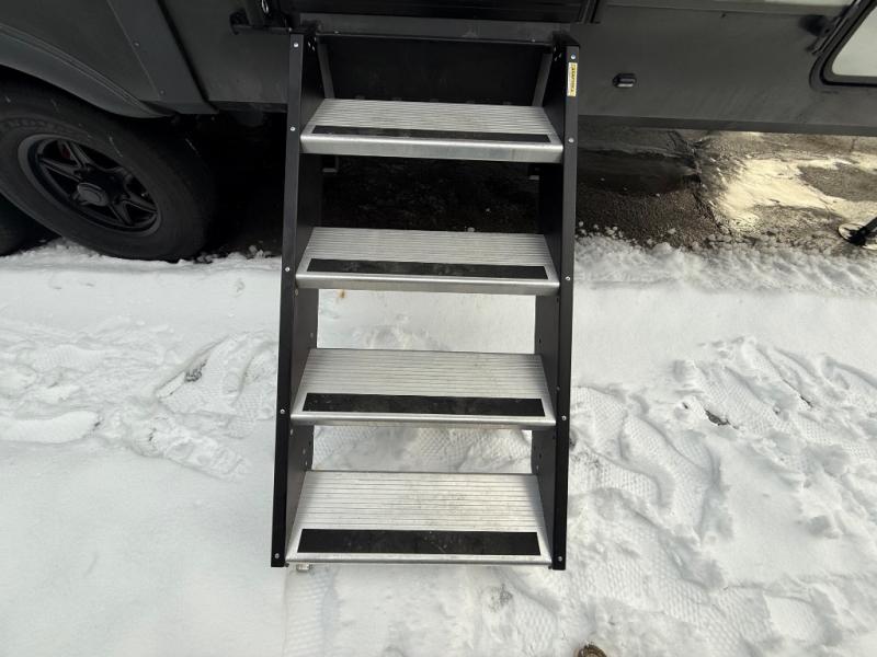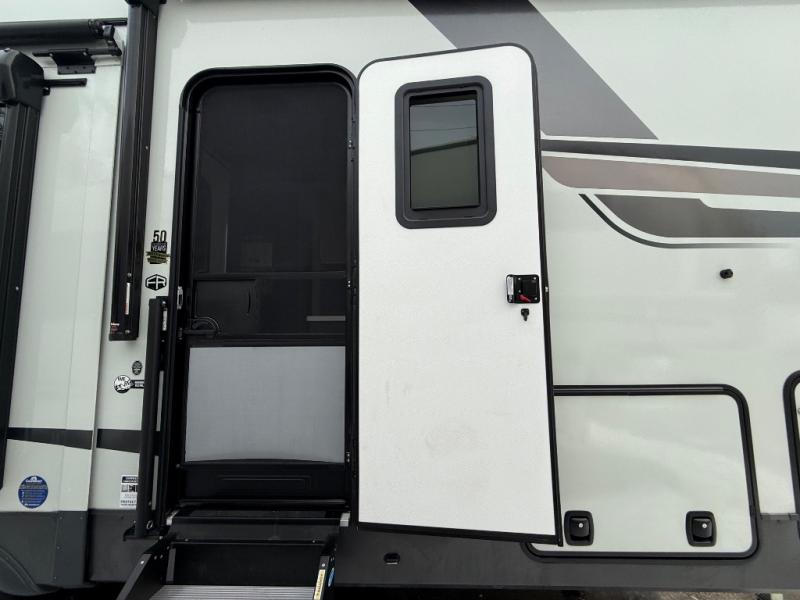 Outdoor Living: The RV includes an outdoor kitchen with a fridge, sink, and cooktop, making it easy to cook while enjoying the outdoors. The large awning offers plenty of shade, and the solid step entry provides a stable entry point.