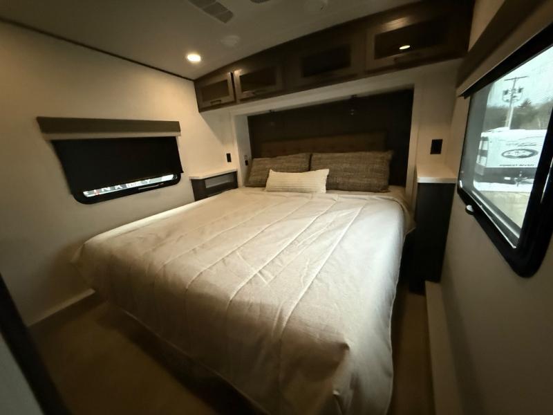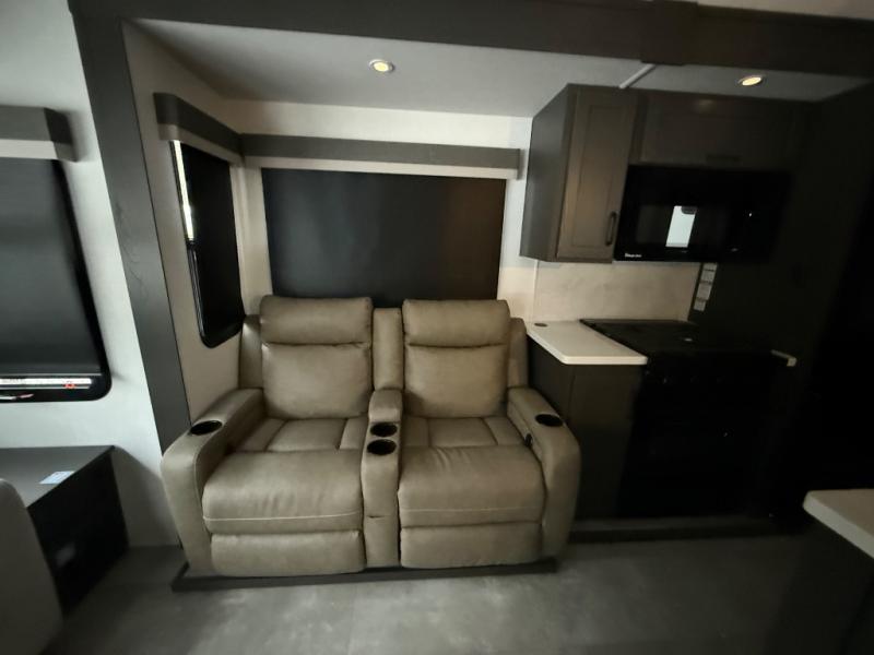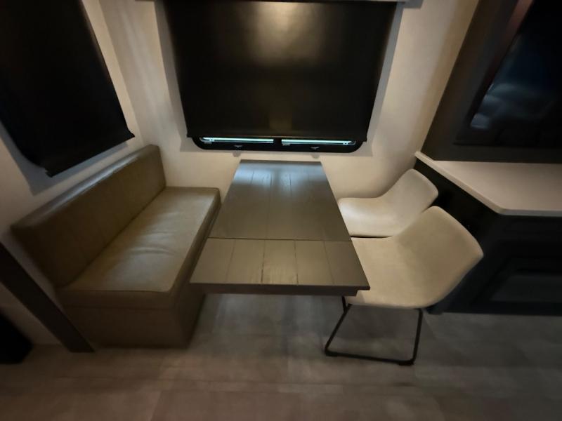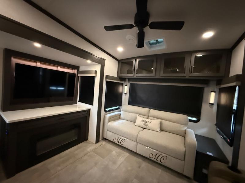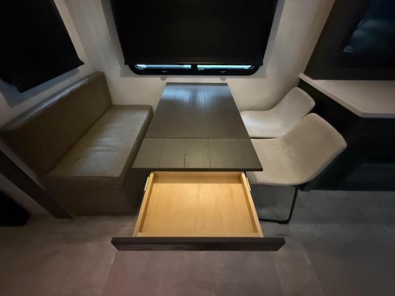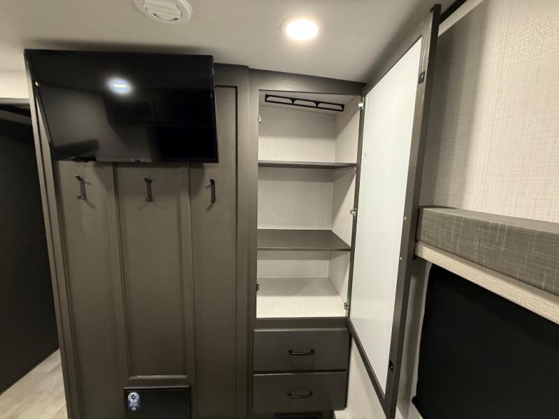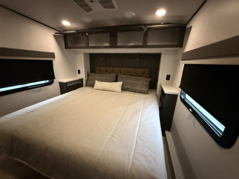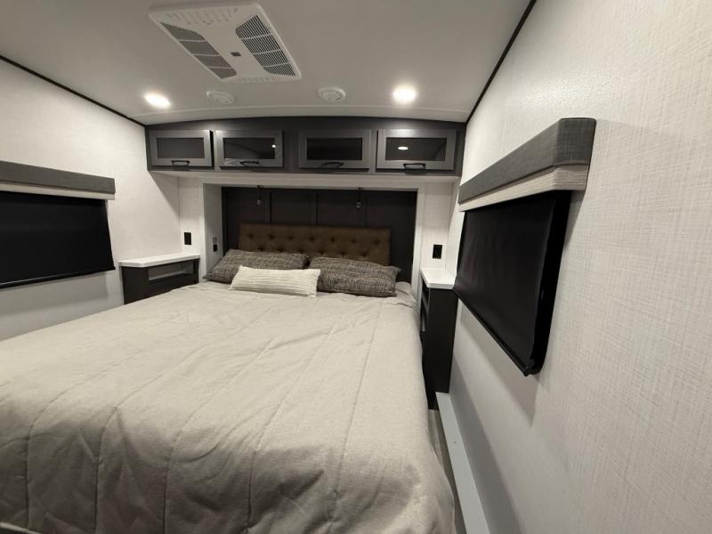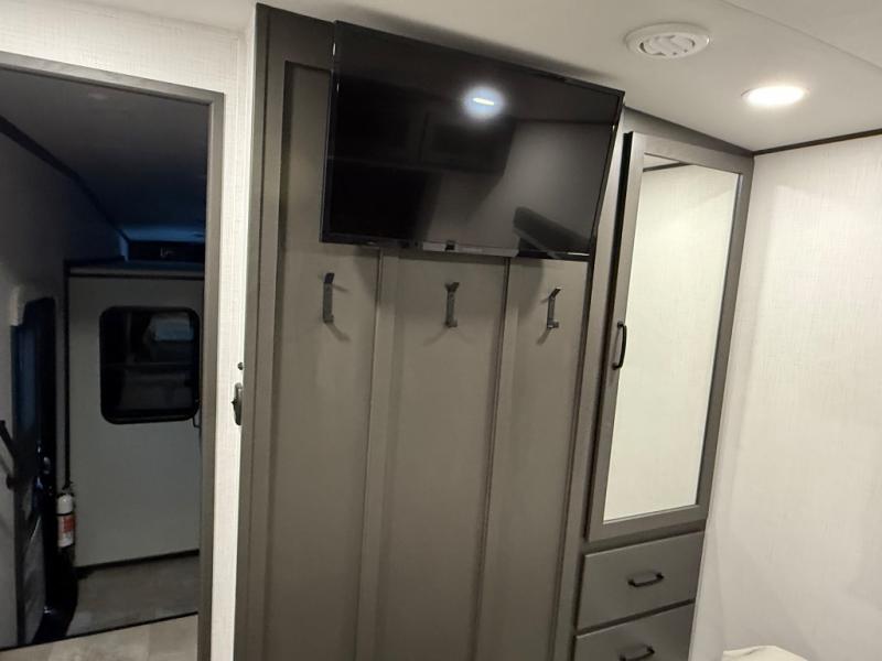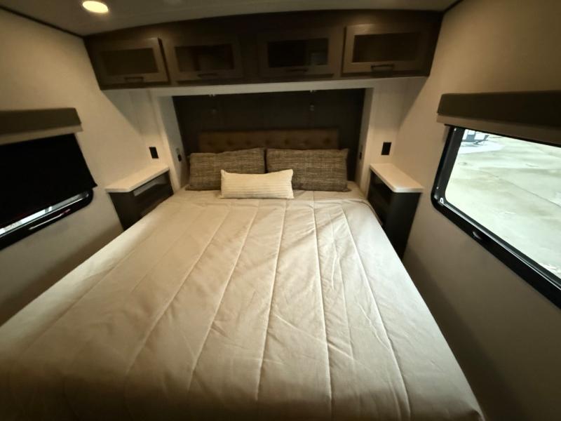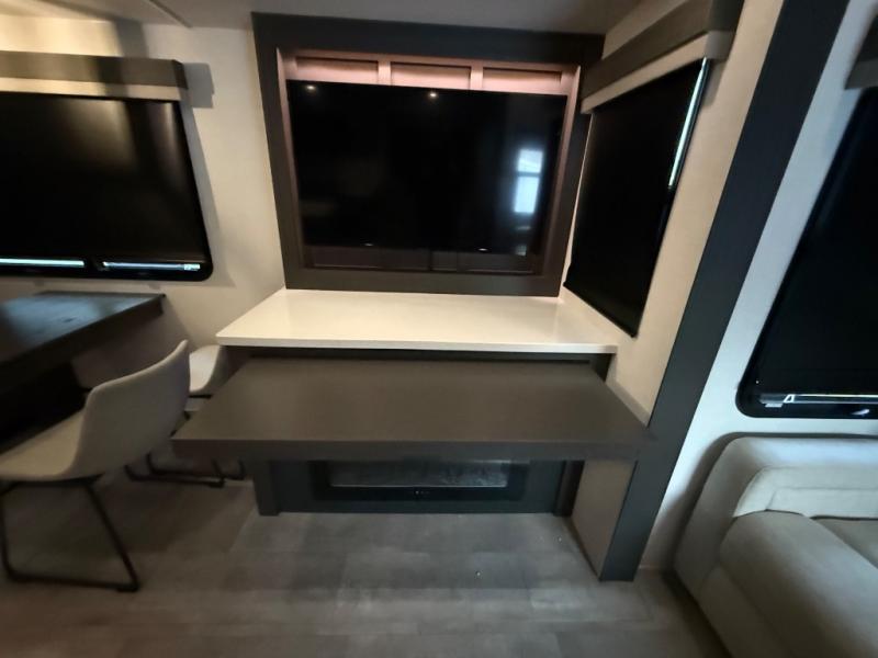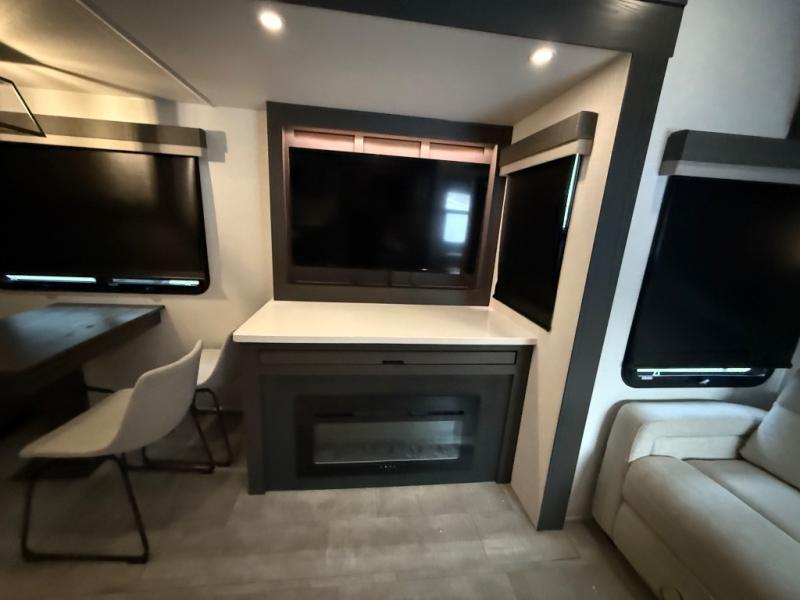 You can enjoy views from inside or outside each day once this RV is set up at the campgrounds! The large windows in the furniture slide and the windows throughout allow you to take in the scenery, and the dual opposing slides give you a spacious main living and kitchen area. You will find lots of seating for guests on the hide-a-bed sofa in the rear, and on the theater seats and table in the slide. The cook will love the 12V refrigerator and large pantry to store food, and everyone can enjoy the Smart TV and fireplace when visiting and relaxing. This unit also includes a pull-out desk which will be perfect if you plan to telecommute. And don't overlook the front private bedroom with its queen bed, wardrobe, and TV option!