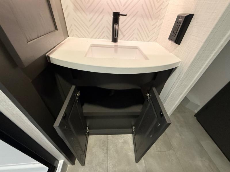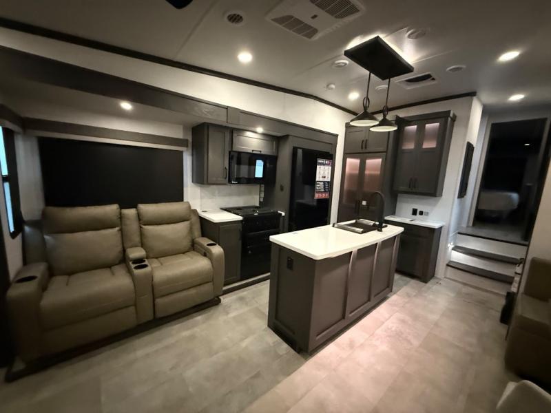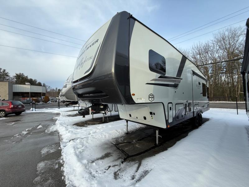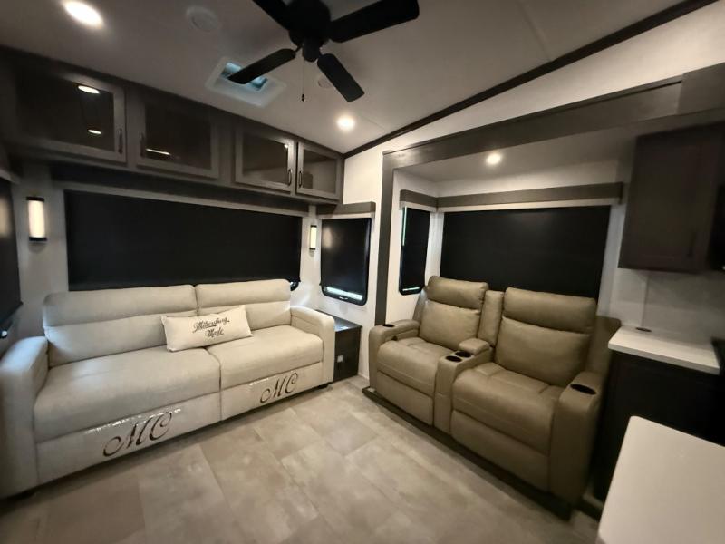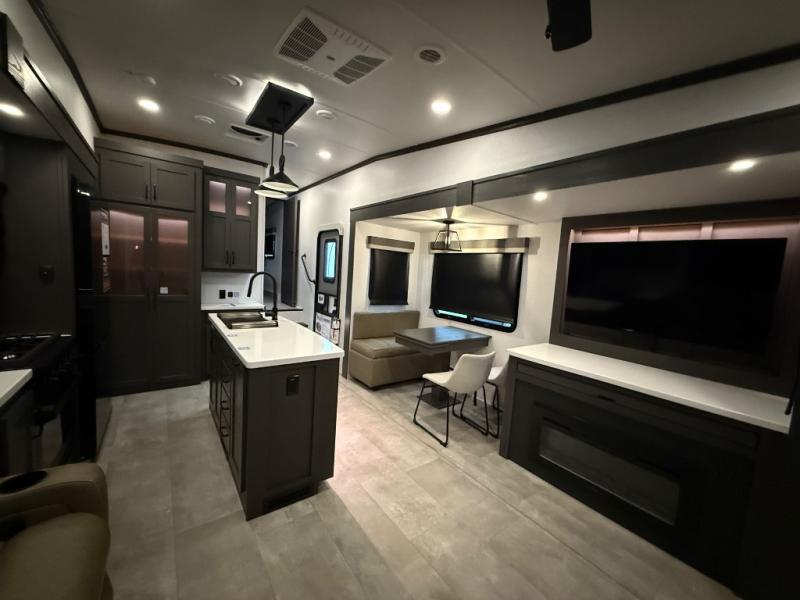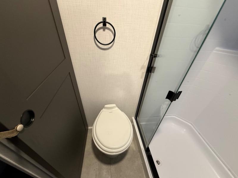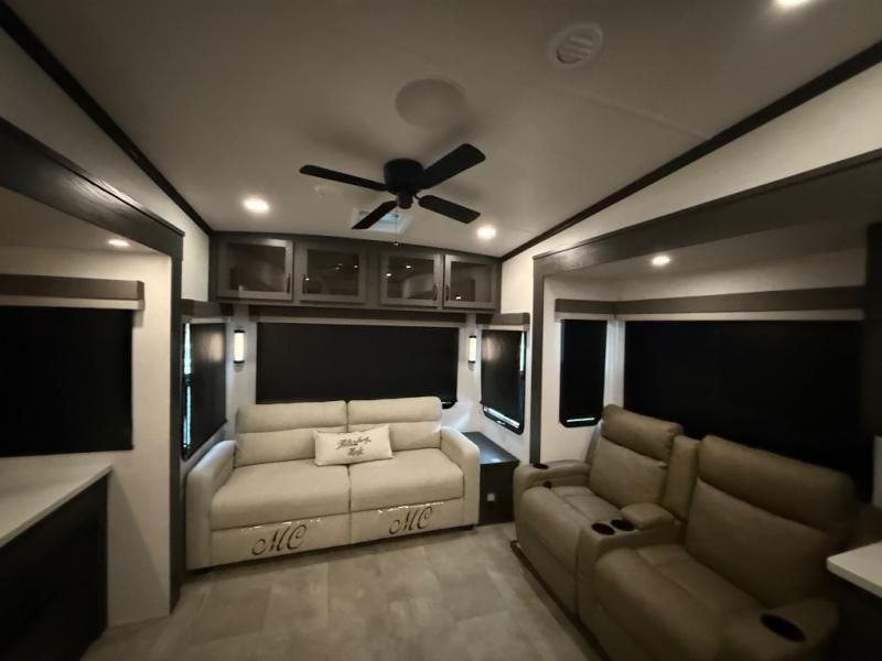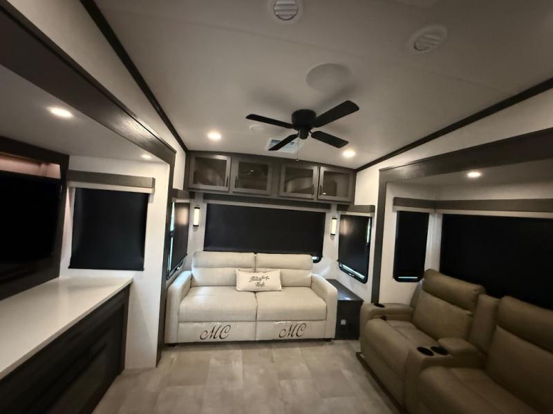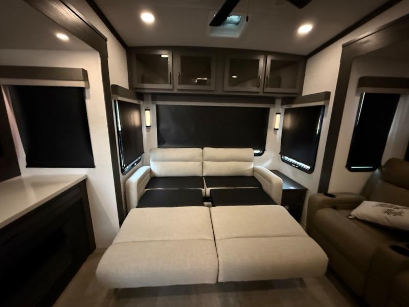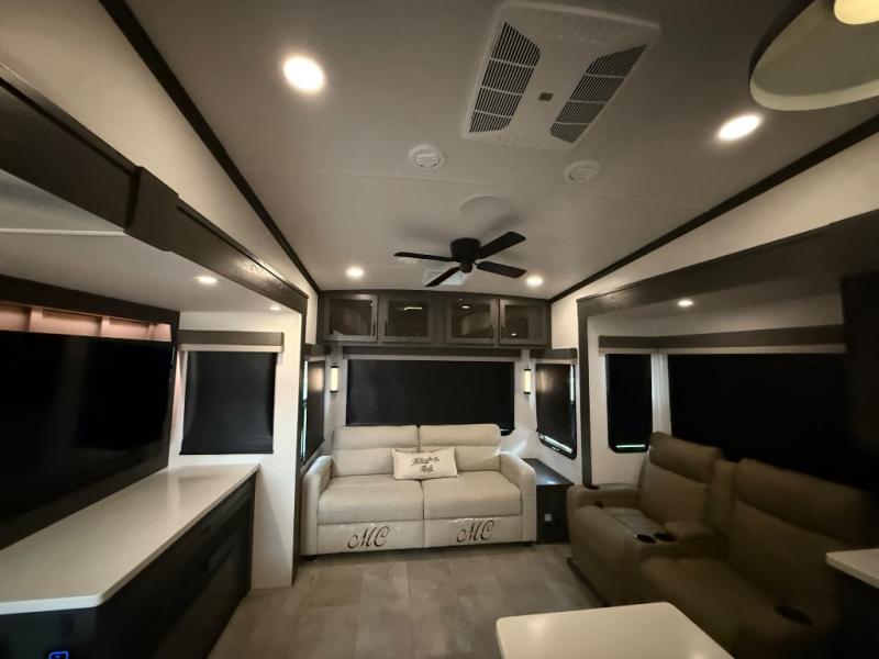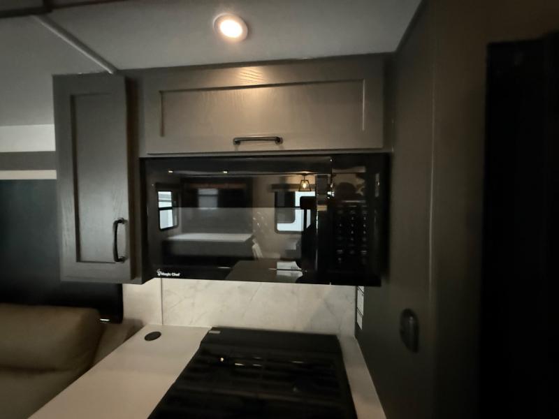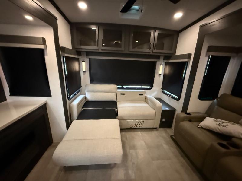 You can enjoy views from inside or outside each day once this RV is set up at the campgrounds! The large windows in the furniture slide and the windows throughout allow you to take in the scenery, and the dual opposing slides give you a spacious main living and kitchen area. You will find lots of seating for guests on the hide-a-bed sofa in the rear, and on the theater seats and table in the slide. The cook will love the 12V refrigerator and large pantry to store food, and everyone can enjoy the Smart TV and fireplace when visiting and relaxing. This unit also includes a pull-out desk which will be perfect if you plan to telecommute. And don't overlook the front private bedroom with its queen bed, wardrobe, and TV option!