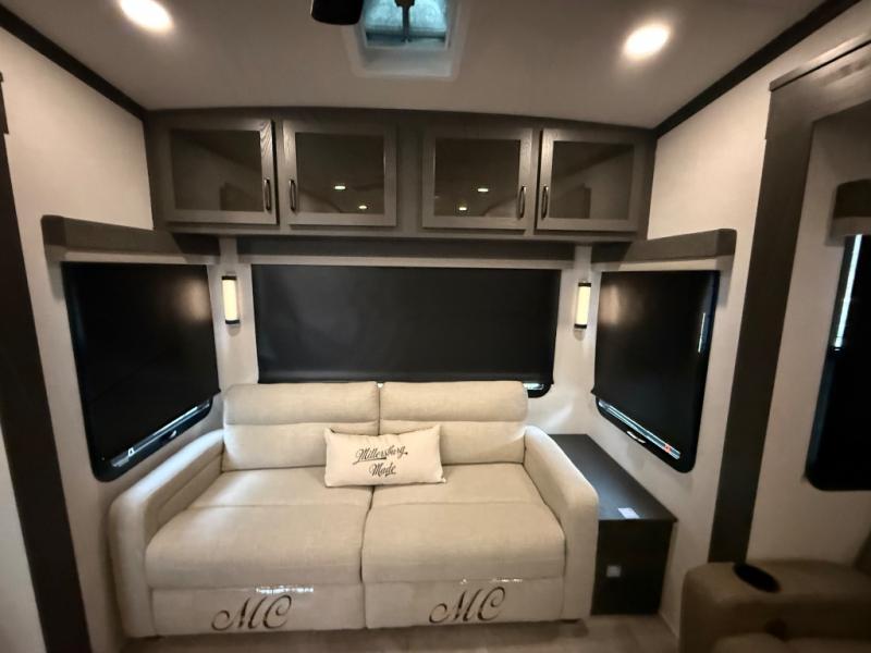 Spacious Layout: The 331RL offers a rear living area with large windows, making it feel bright and airy. The living space includes cozy reclining chairs, a sofa, and a fireplace, perfect for relaxing after a day of outdoor activities.