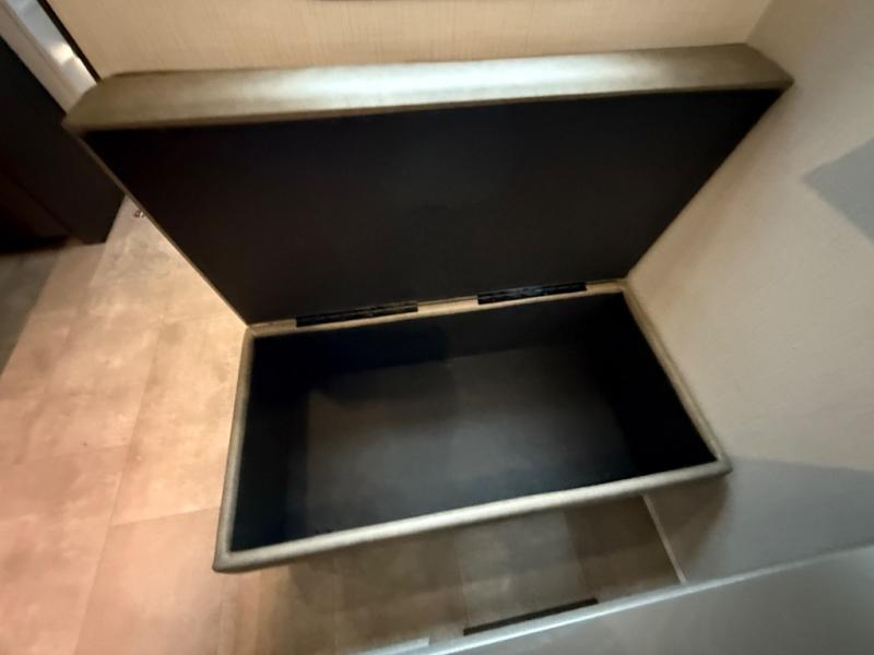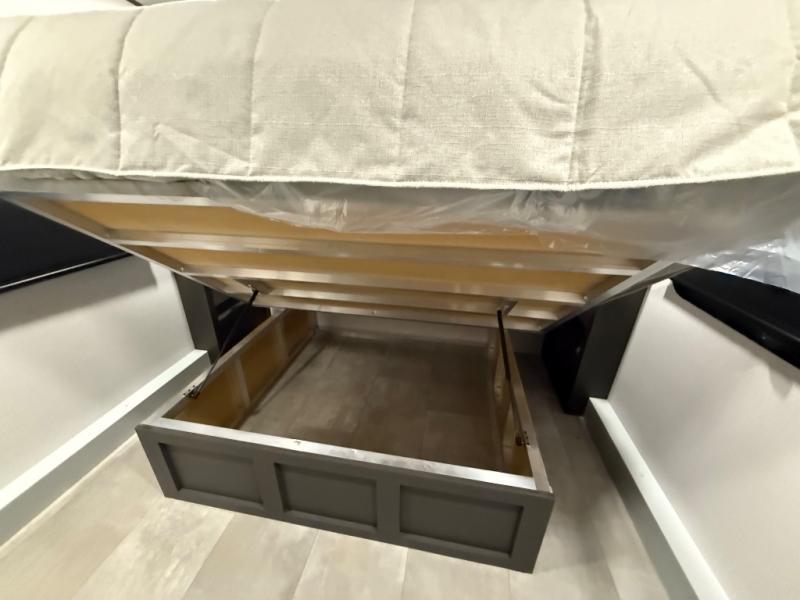 Comfortable Bedroom: The front bedroom has a king-sized bed (or optional queen) with a comfortable mattress, storage space under the bed, and a large closet. The space also features an entertainment center and ample cabinetry.