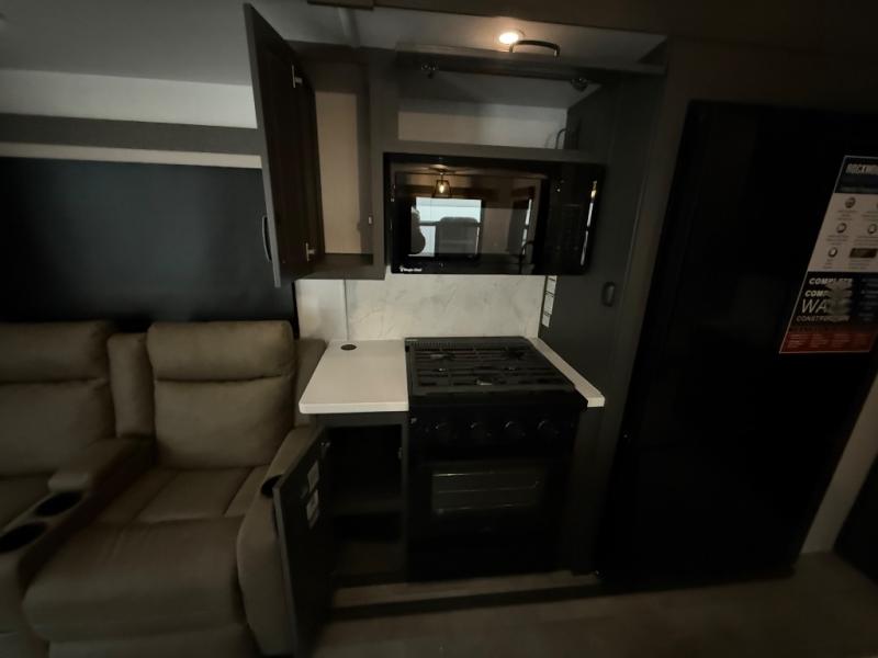 Luxury Amenities: The Rockwood Signature 331RL is equipped with residential-style finishes, including heated and massaging theater seating, high-end cabinetry, and elegant LED lighting throughout. The inclusion of a large outdoor kitchen, a power awning, and Bluetooth sound system for outdoor entertainment adds to the luxury.