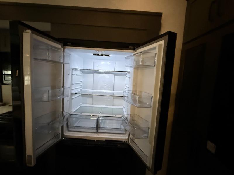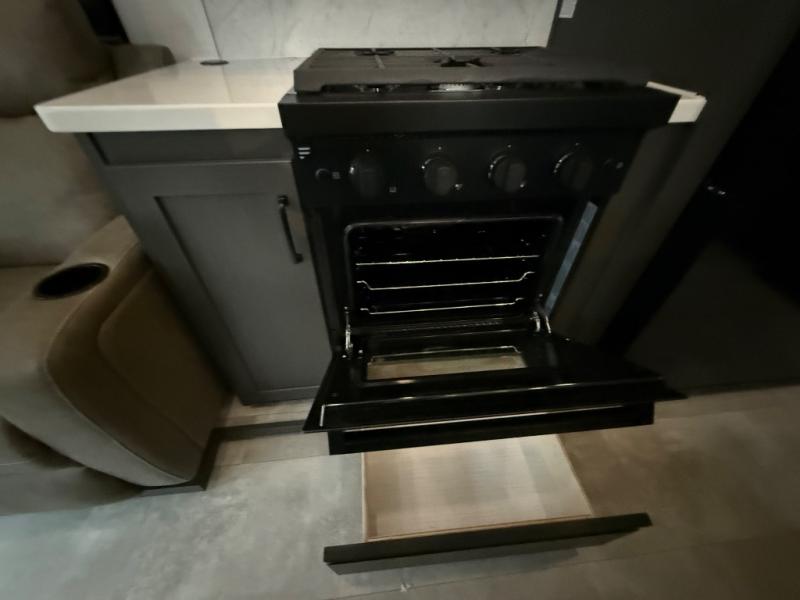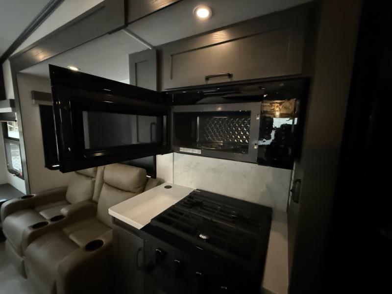 Gourmet Kitchen: This RV comes with a fully equipped kitchen, including a 3-burner stove, a convection microwave, a large double-door fridge, and solid-surface countertops. There's plenty of storage space for your cookware and food.