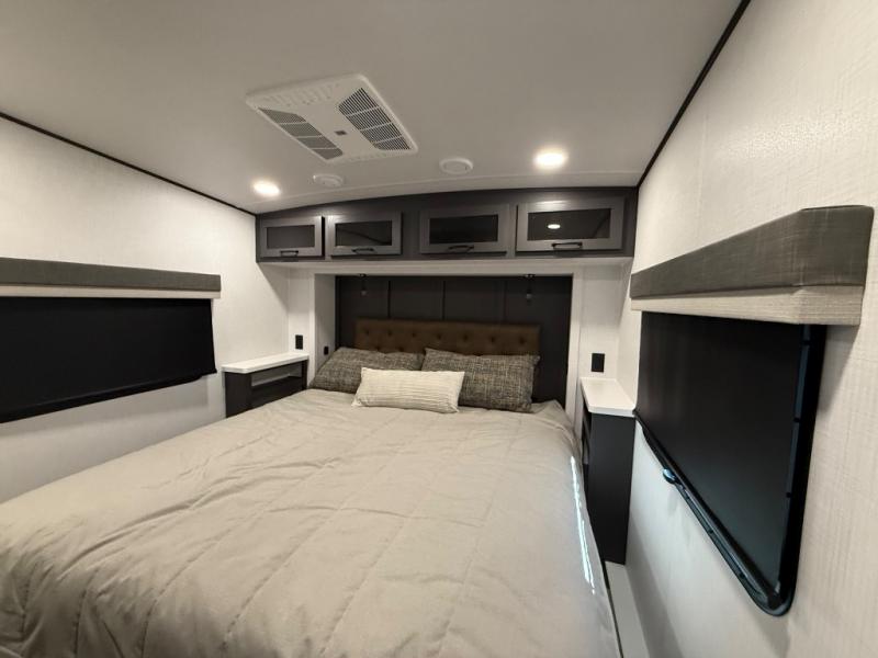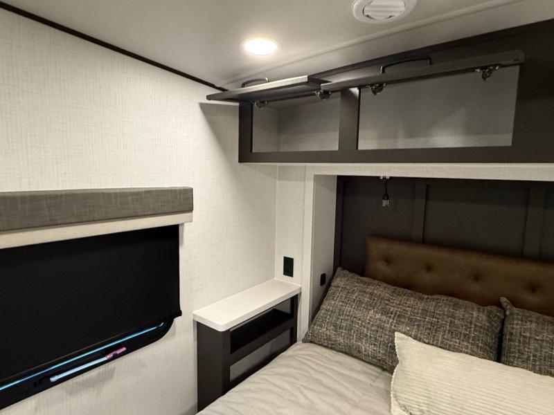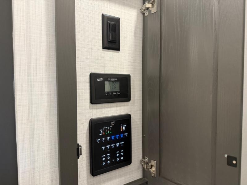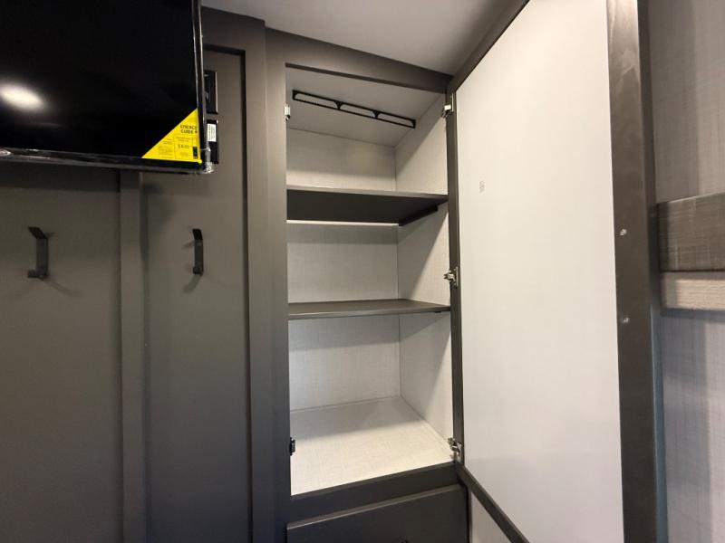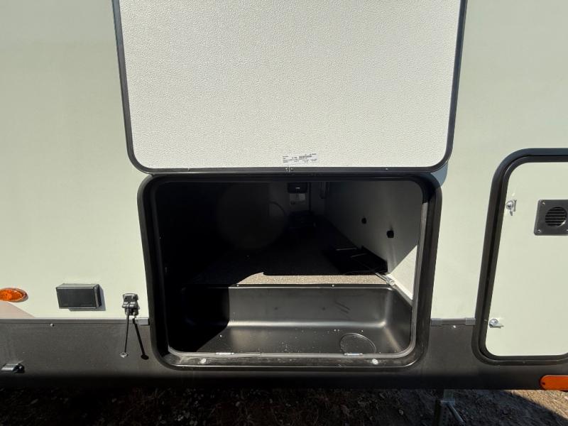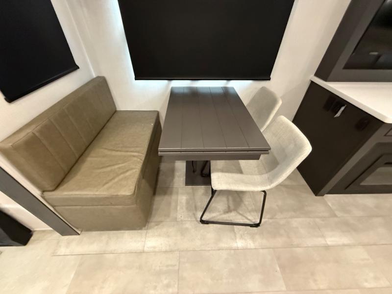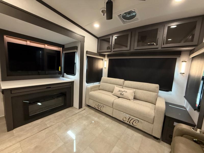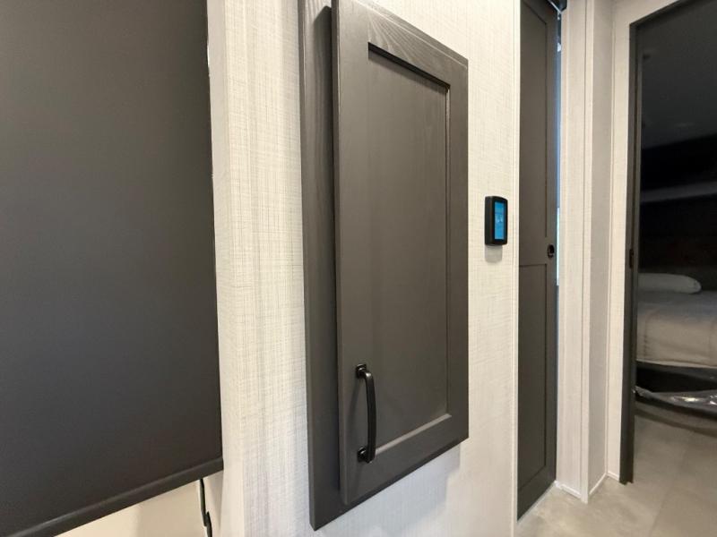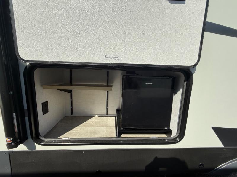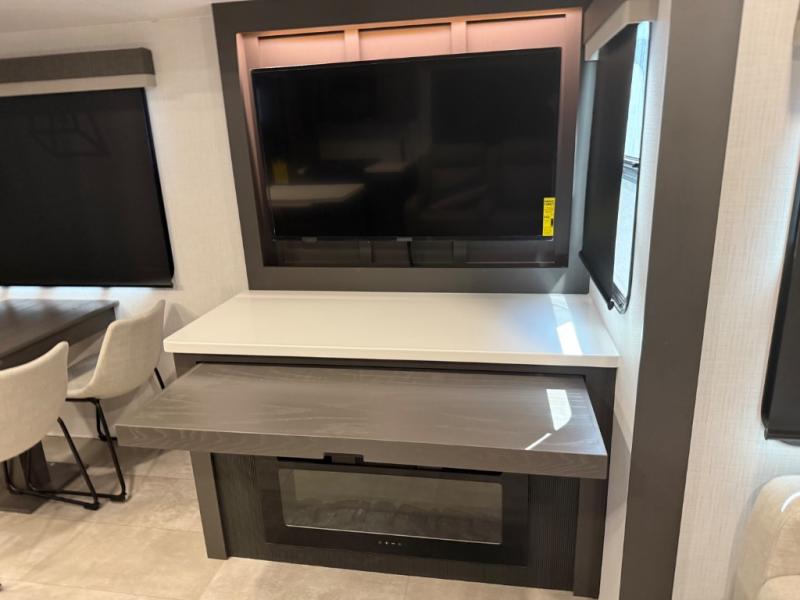 You can enjoy views from inside or outside each day once this RV is set up at the campgrounds! The large windows in the furniture slide and the windows throughout allow you to take in the scenery, and the dual opposing slides give you a spacious main living and kitchen area. You will find lots of seating for guests on the hide-a-bed sofa in the rear, and on the theater seats and table in the slide. The cook will love the 12V refrigerator and large pantry to store food, and everyone can enjoy the Smart TV and fireplace when visiting and relaxing. This unit also includes a pull-out desk which will be perfect if you plan to telecommute. And don't overlook the front private bedroom with its queen bed, wardrobe, and TV option!