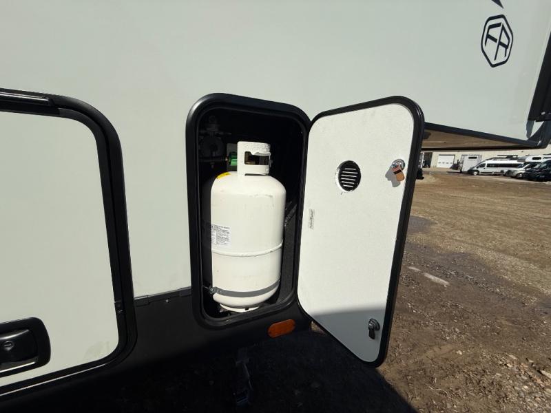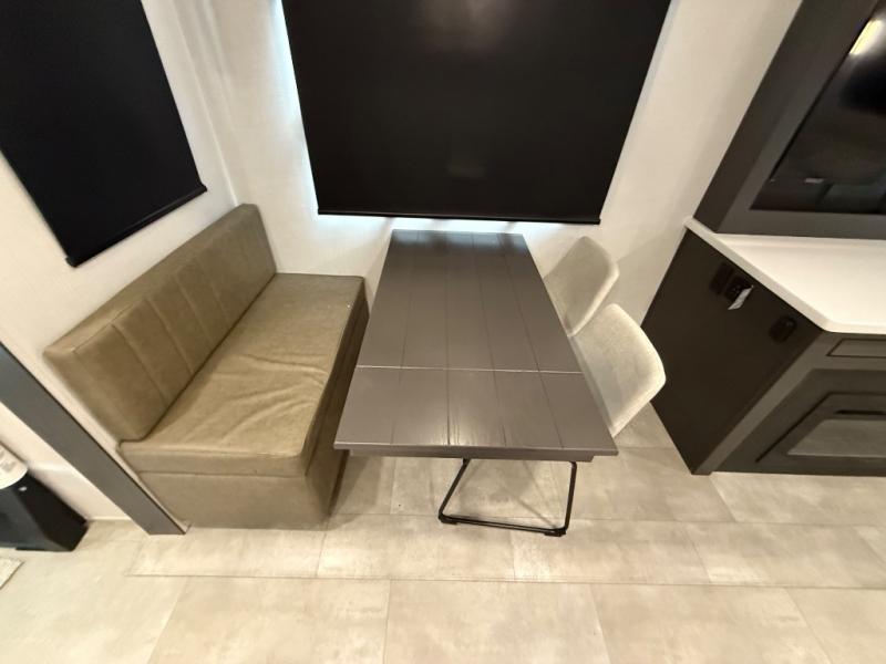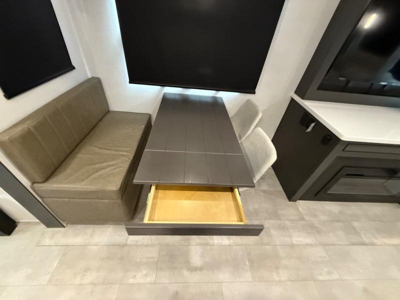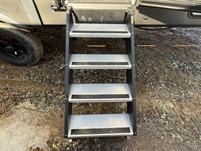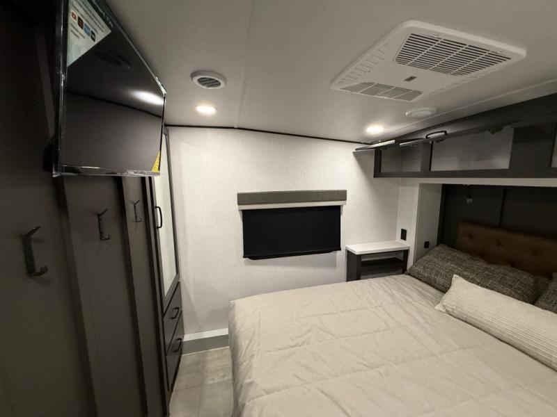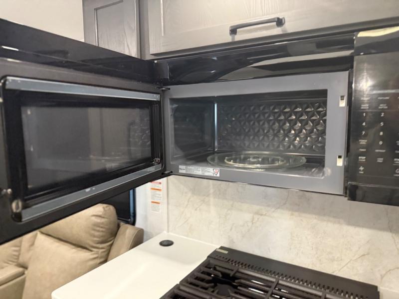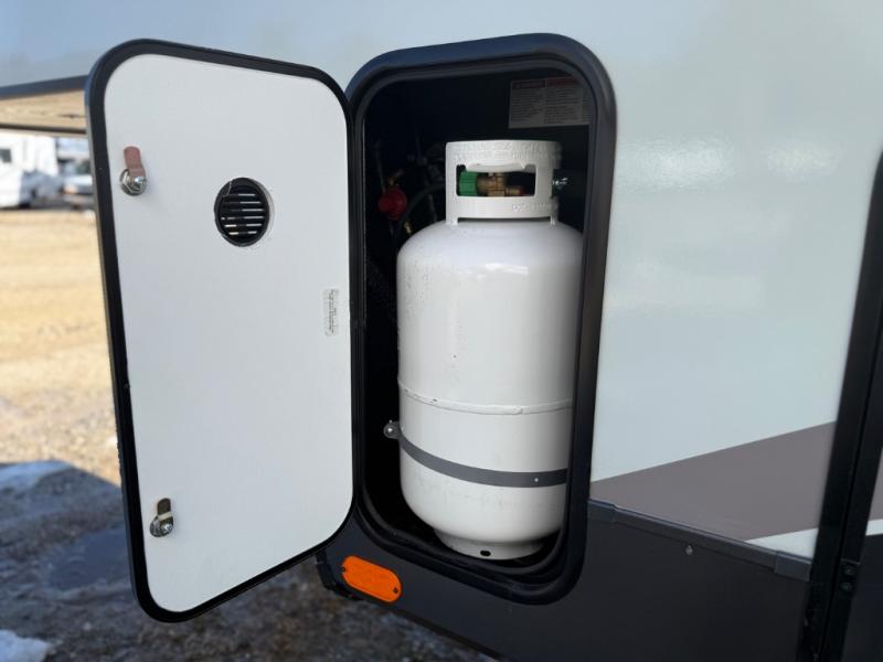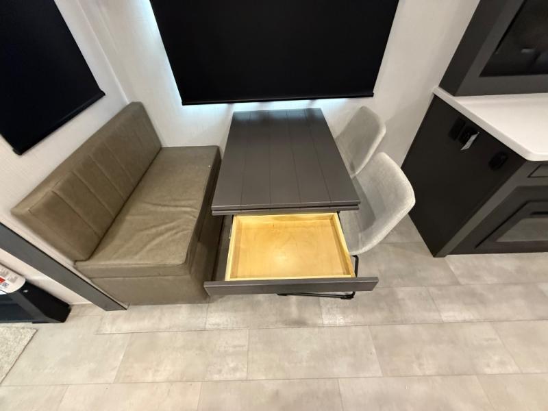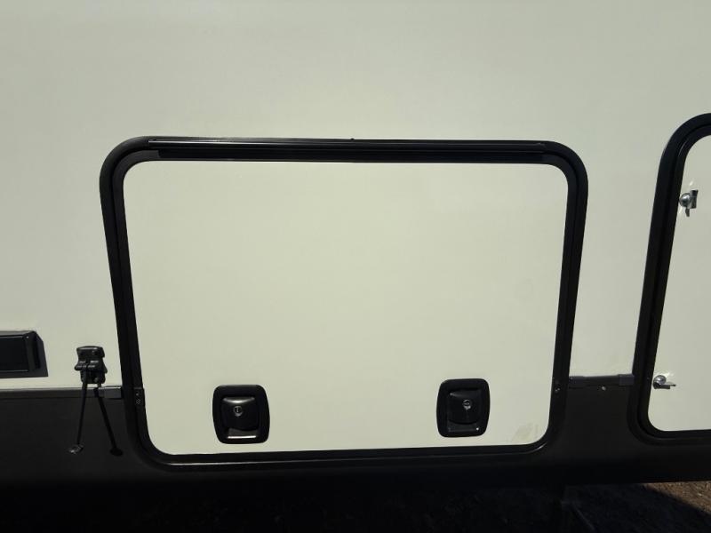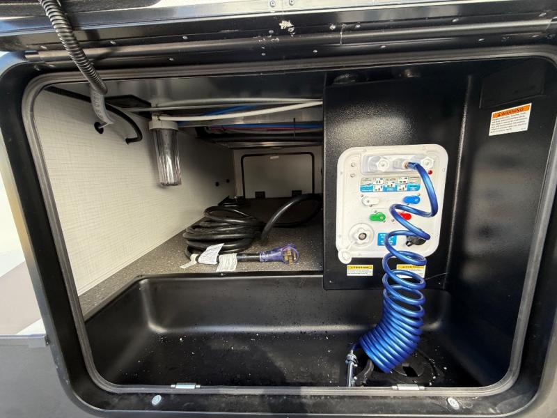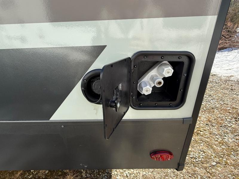You can enjoy views from inside or outside each day once this RV is set up at the campgrounds! The large windows in the furniture slide and the windows throughout allow you to take in the scenery, and the dual opposing slides give you a spacious main living and kitchen area. You will find lots of seating for guests on the hide-a-bed sofa in the rear, and on the theater seats and table in the slide. The cook will love the 12V refrigerator and large pantry to store food, and everyone can enjoy the Smart TV and fireplace when visiting and relaxing. This unit also includes a pull-out desk which will be perfect if you plan to telecommute. And don't overlook the front private bedroom with its queen bed, wardrobe, and TV option!
