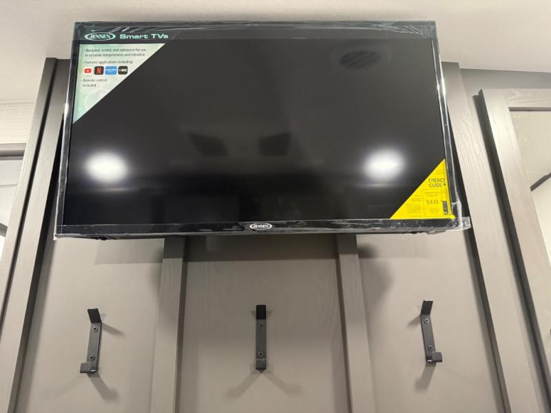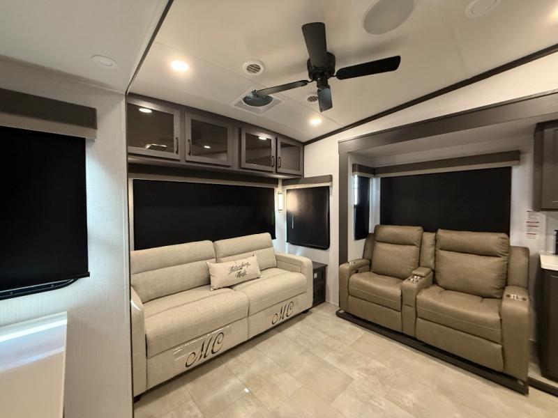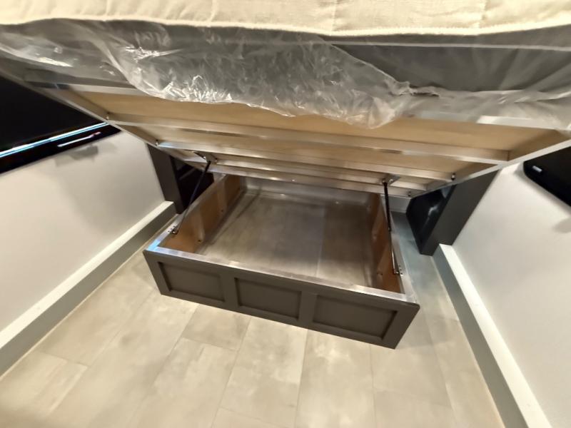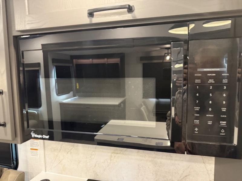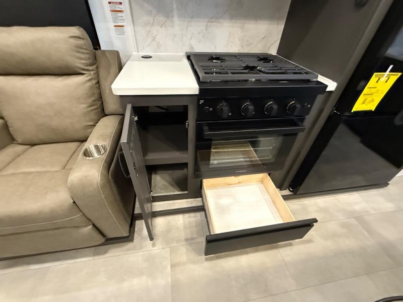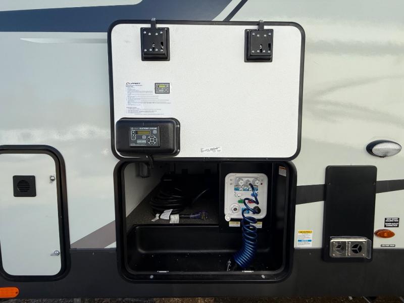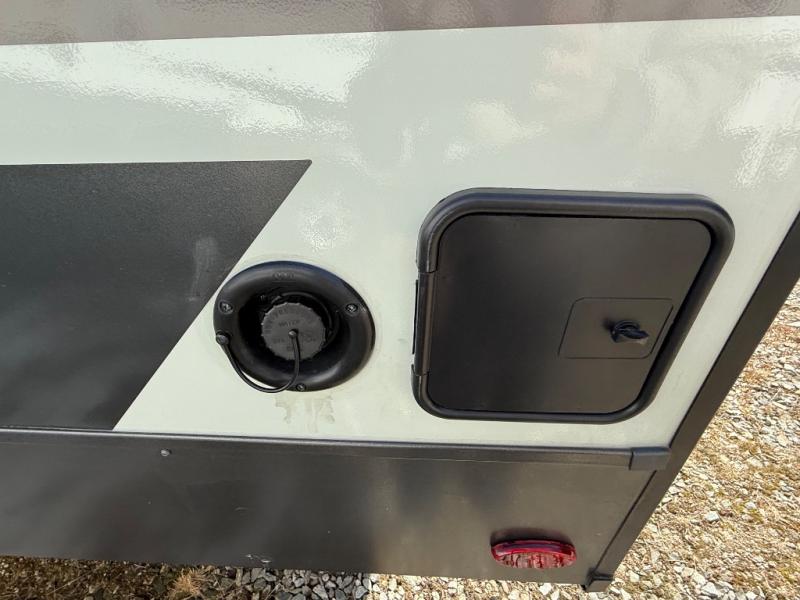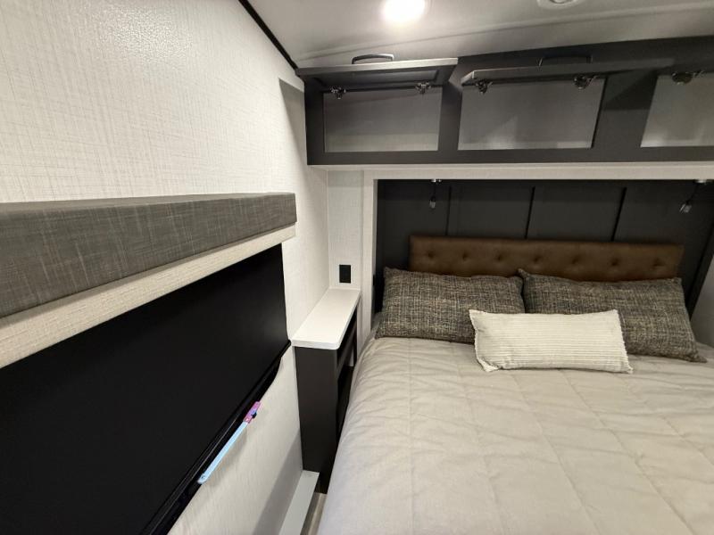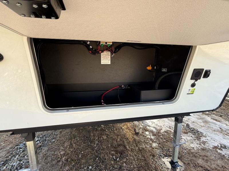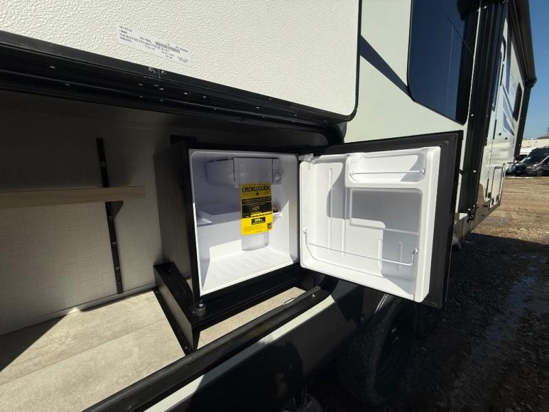 You can enjoy views from inside or outside each day once this RV is set up at the campgrounds! The large windows in the furniture slide and the windows throughout allow you to take in the scenery, and the dual opposing slides give you a spacious main living and kitchen area. You will find lots of seating for guests on the hide-a-bed sofa in the rear, and on the theater seats and table in the slide. The cook will love the 12V refrigerator and large pantry to store food, and everyone can enjoy the Smart TV and fireplace when visiting and relaxing. This unit also includes a pull-out desk which will be perfect if you plan to telecommute. And don't overlook the front private bedroom with its queen bed, wardrobe, and TV option!