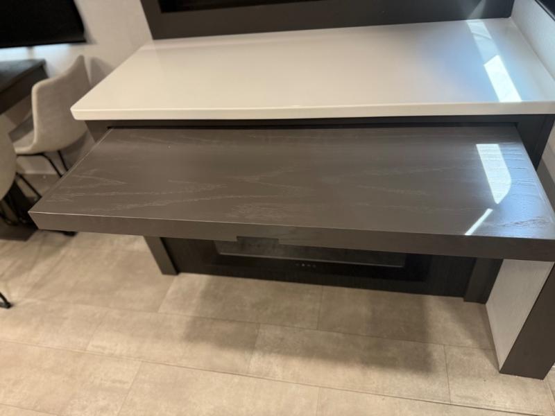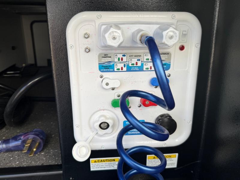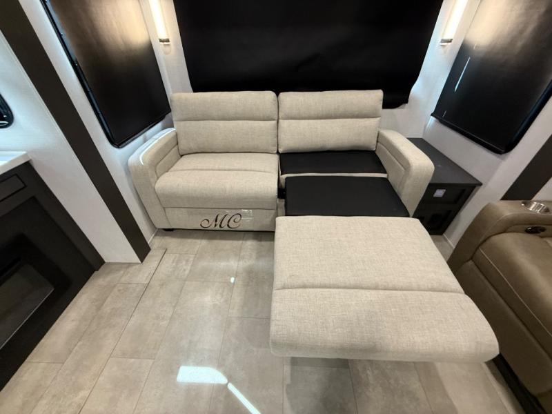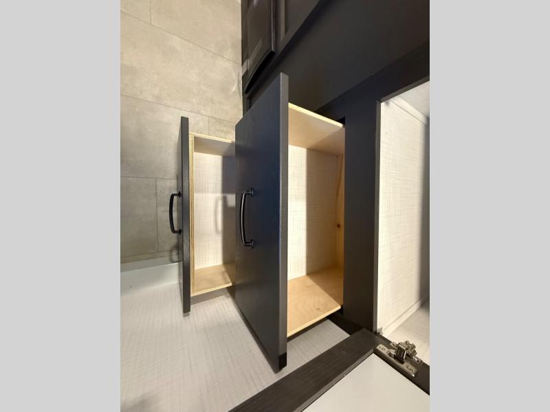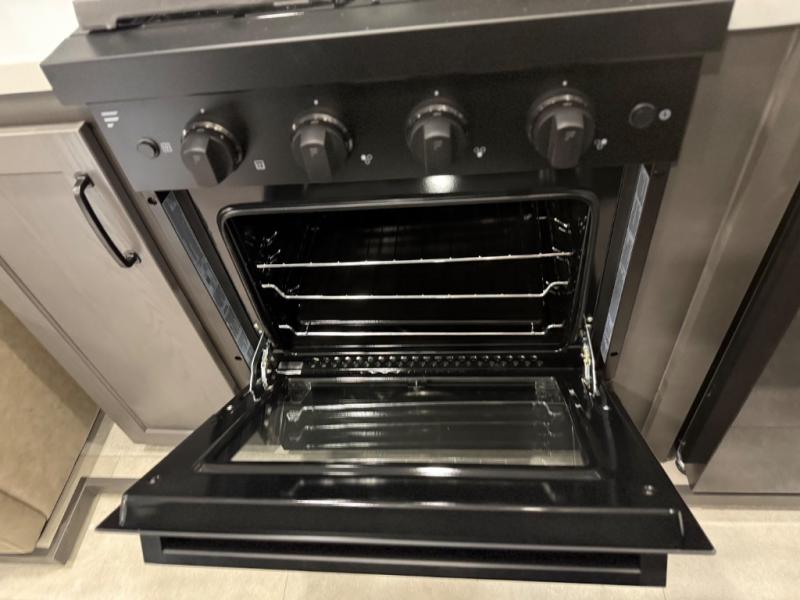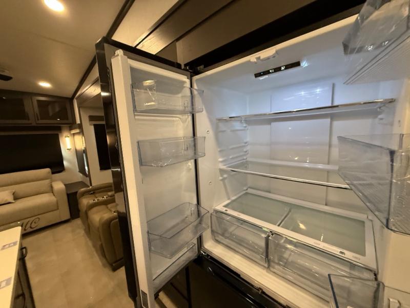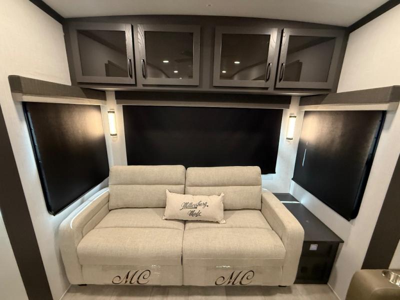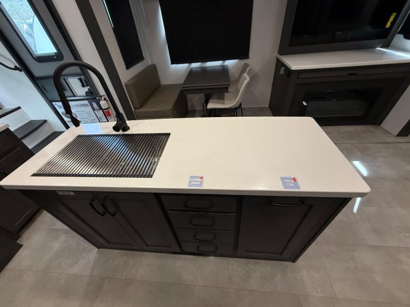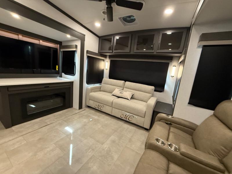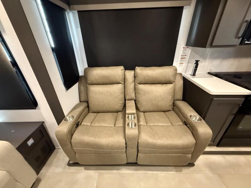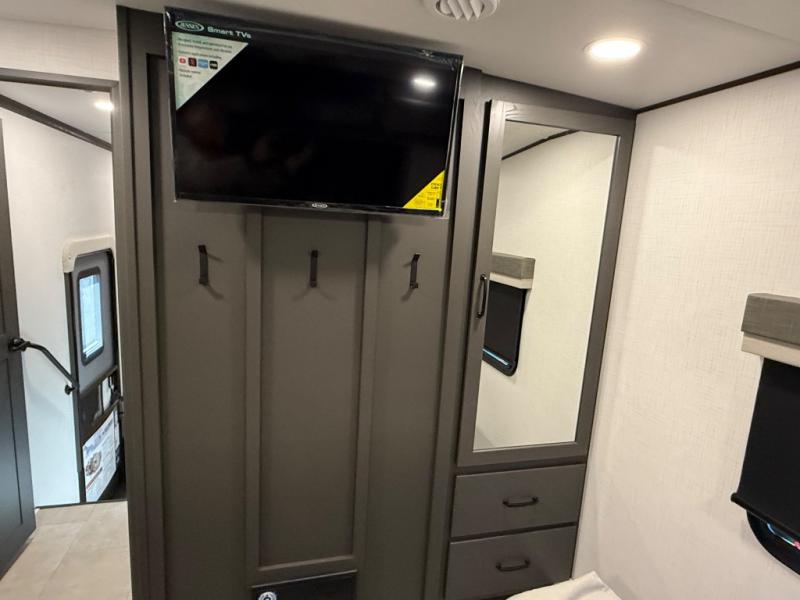 You can enjoy views from inside or outside each day once this RV is set up at the campgrounds! The large windows in the furniture slide and the windows throughout allow you to take in the scenery, and the dual opposing slides give you a spacious main living and kitchen area. You will find lots of seating for guests on the hide-a-bed sofa in the rear, and on the theater seats and table in the slide. The cook will love the 12V refrigerator and large pantry to store food, and everyone can enjoy the Smart TV and fireplace when visiting and relaxing. This unit also includes a pull-out desk which will be perfect if you plan to telecommute. And don't overlook the front private bedroom with its queen bed, wardrobe, and TV option!