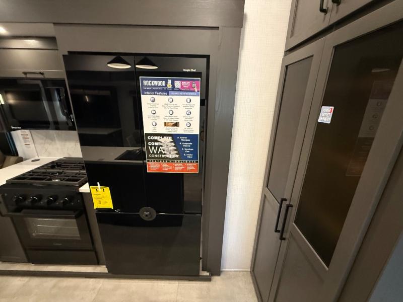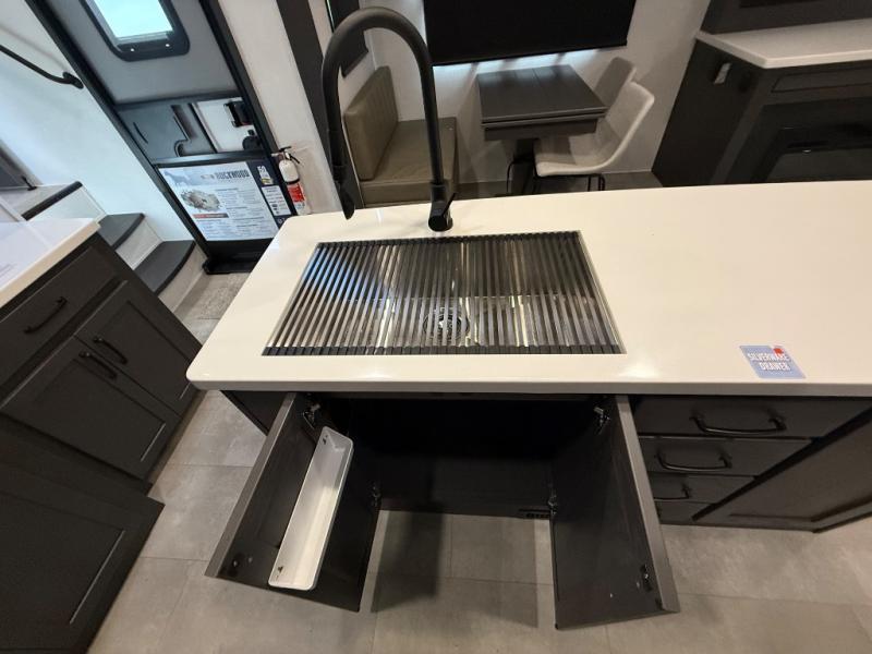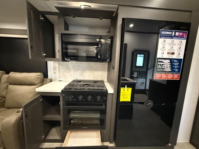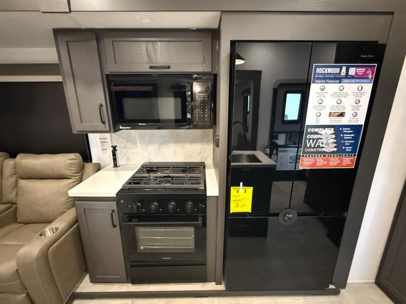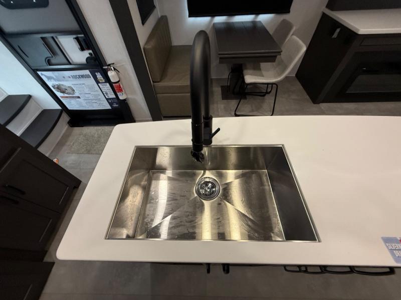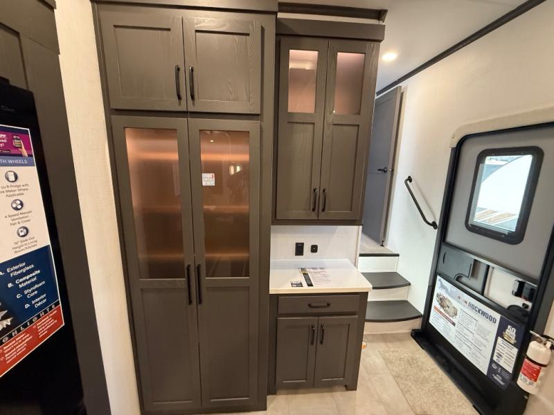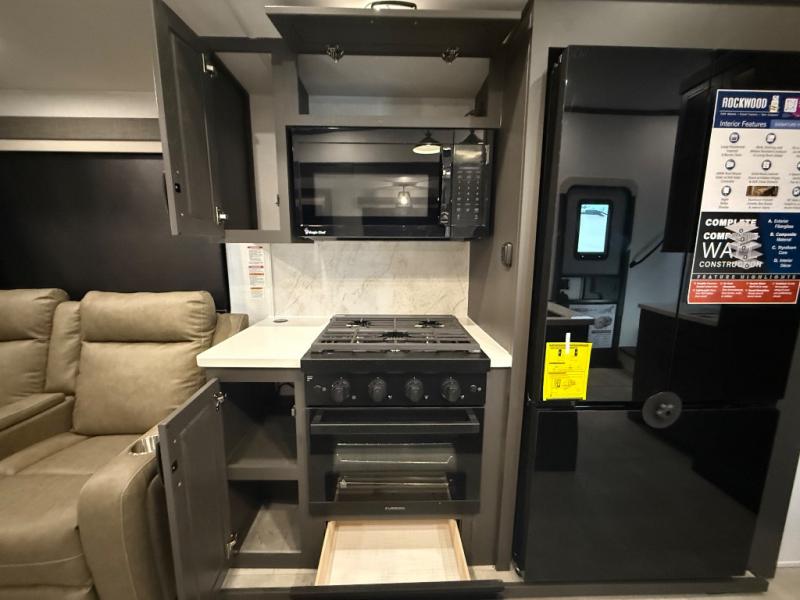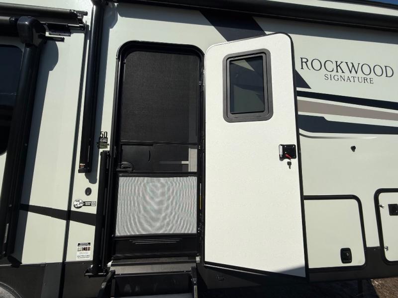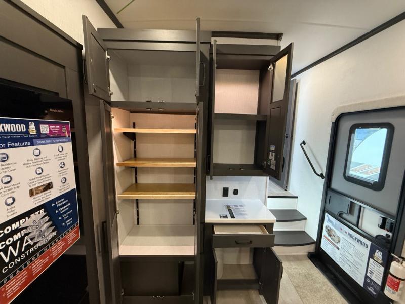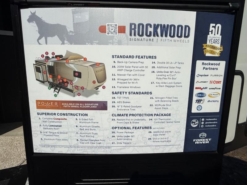 With any Rockwood Signature fifth wheel or travel trailer by Forest River RV, you will enjoy superior construction that includes laminated white fiberglass sidewalls, a radius roof with vaulted interior ceilings, plus radiant foil insulation and an enclosed underbelly for use in all types of weather. Some convenient exterior features include Keyed Alike locks, a rear ladder, a 200W solar panel, and a tire pressure monitor system with a monitor for added safety. The interior offers a One Touch OneControl panel with WeRV app control, for lights, awning, slides, water heater and more, and the Air 360+ omnidirectional antenna with WiFi prep lets you work while away from home if needed. You will also appreciate the interior vaulted ceilings, residential soft close doors and drawers, solid surface kitchen countertops, and designer kitchen backsplash!