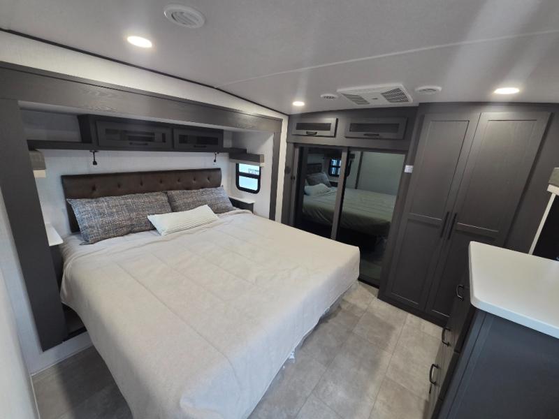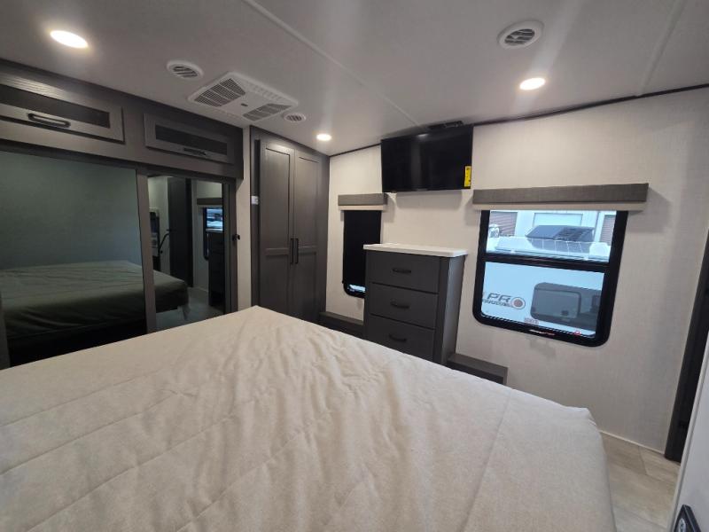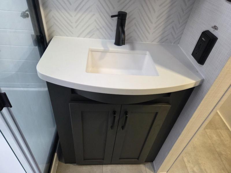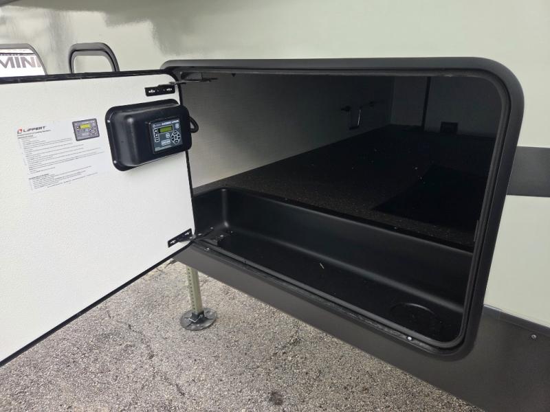 Built for year-round use with laminated fiberglass sidewalls, radiant foil insulation, enclosed underbelly, and vaulted roof. Tech features include OneControl with WeRV app, Air 360+ WiFi prep, 200W solar panel, tire pressure monitoring system, and keyed-alike locks.