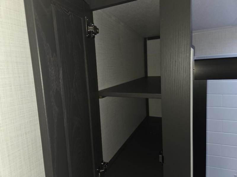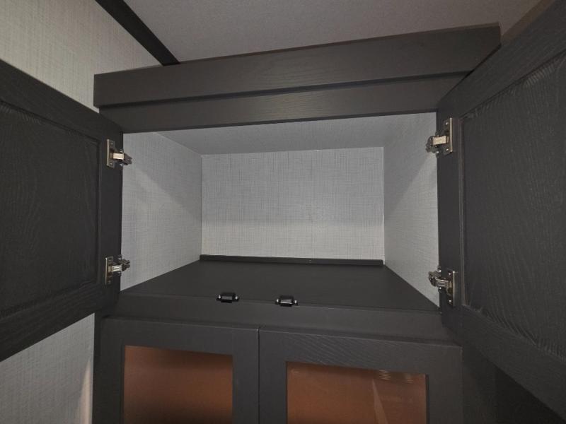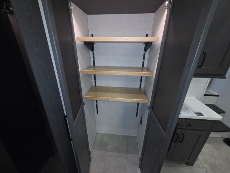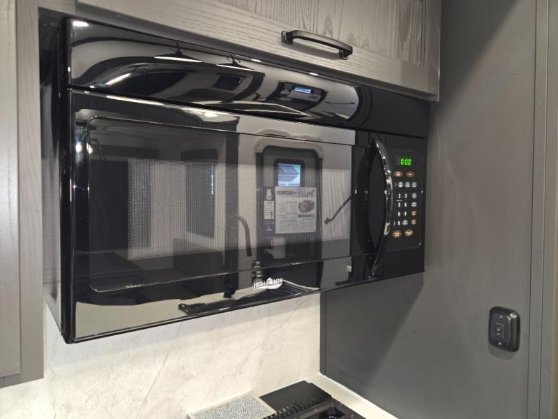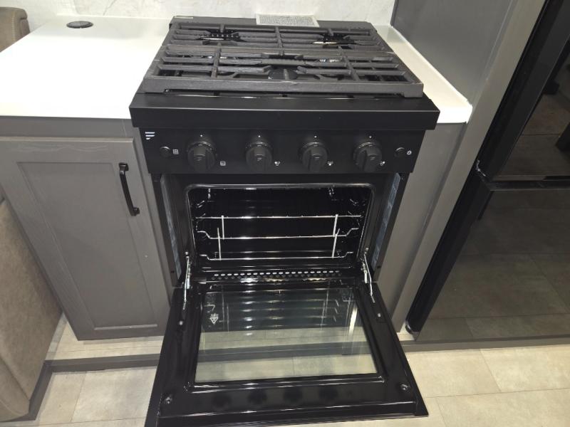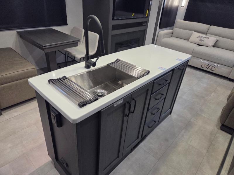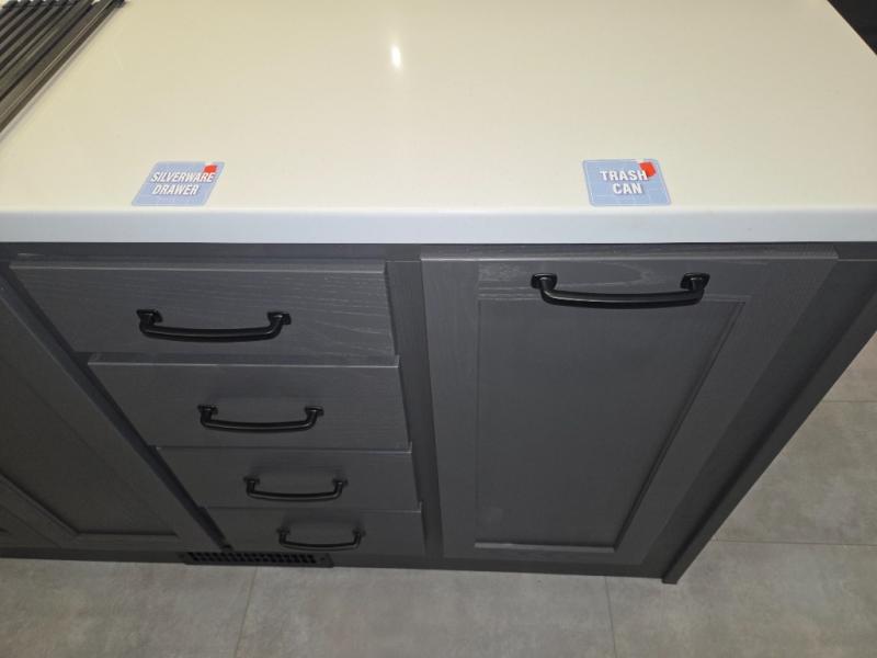 The modern kitchen offers a center island for added prep space, solid surface countertops, designer backsplash, soft-close cabinetry, and a 12V refrigerator. The outdoor kitchen adds convenience for meals outside.