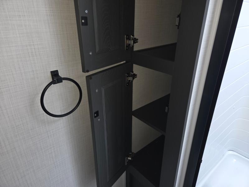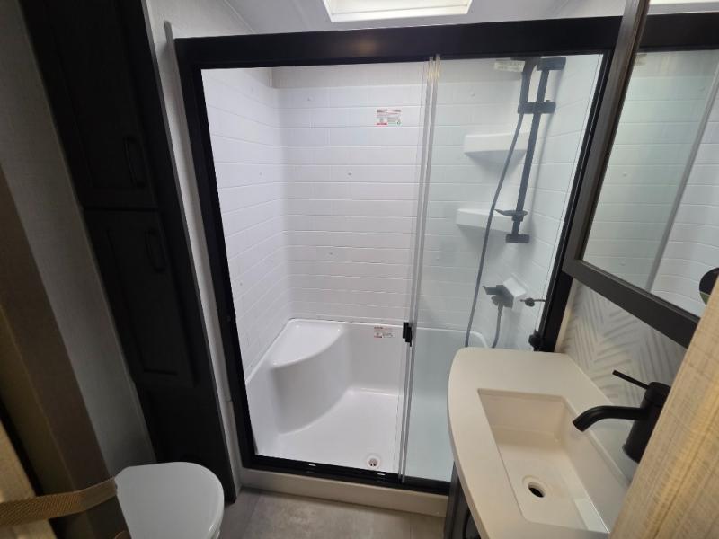 Relax in the front bedroom featuring a king bed slide, wardrobe storage, dresser, and vaulted ceilings. The full bath includes a seated shower, skylight, and Maxxair ventilation fan.