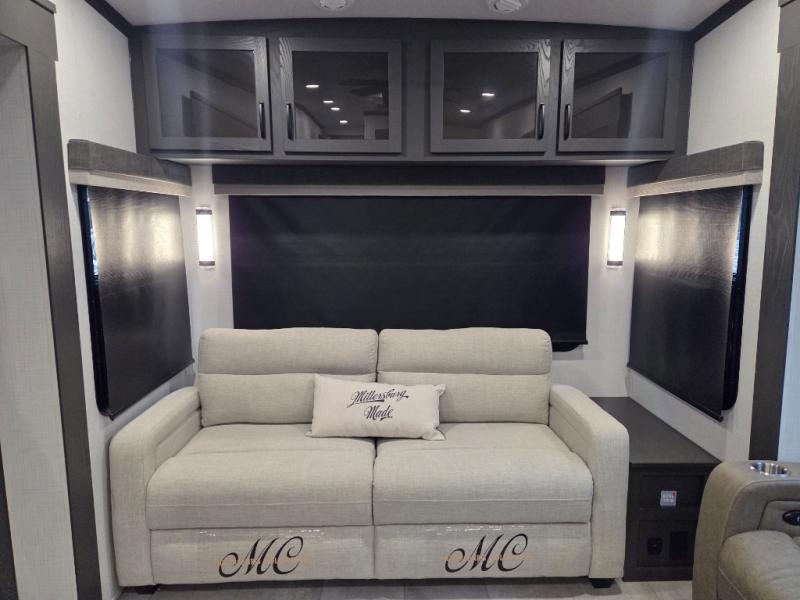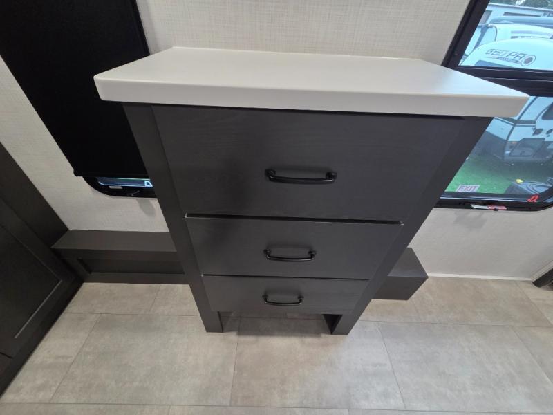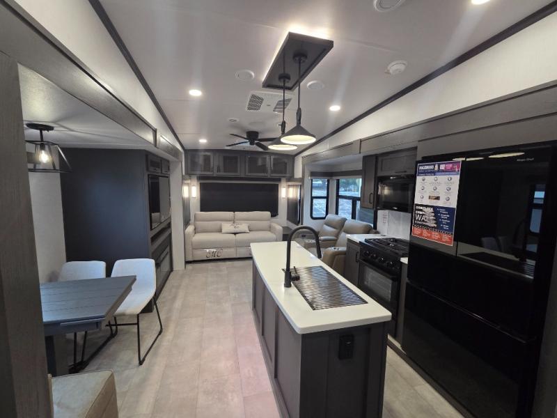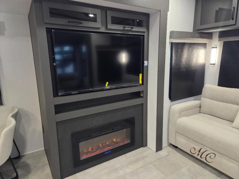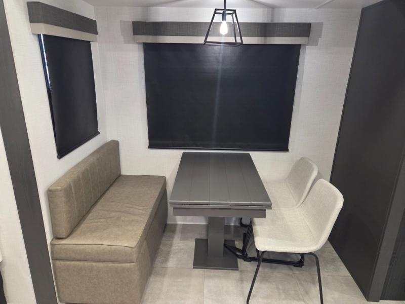 Dual opposing slides create a wide-open main living area. Enjoy movie nights in the theater seating across from the entertainment center and fireplace, or entertain guests with the hide-a-bed sofa and dinette with chairs and bench seating.