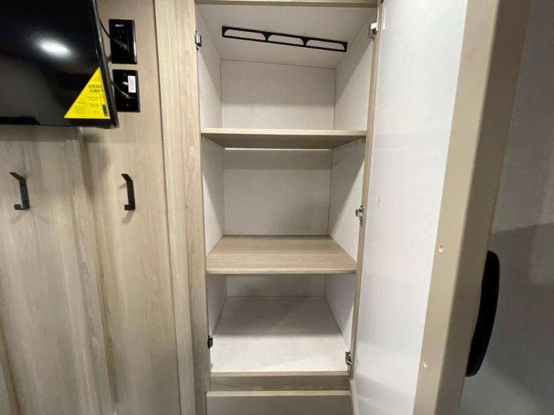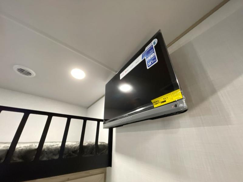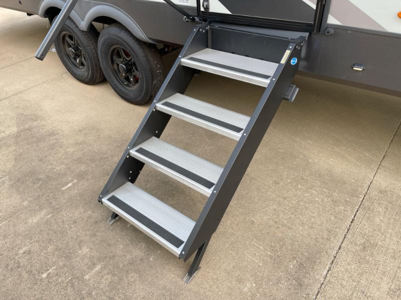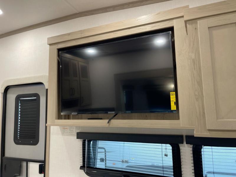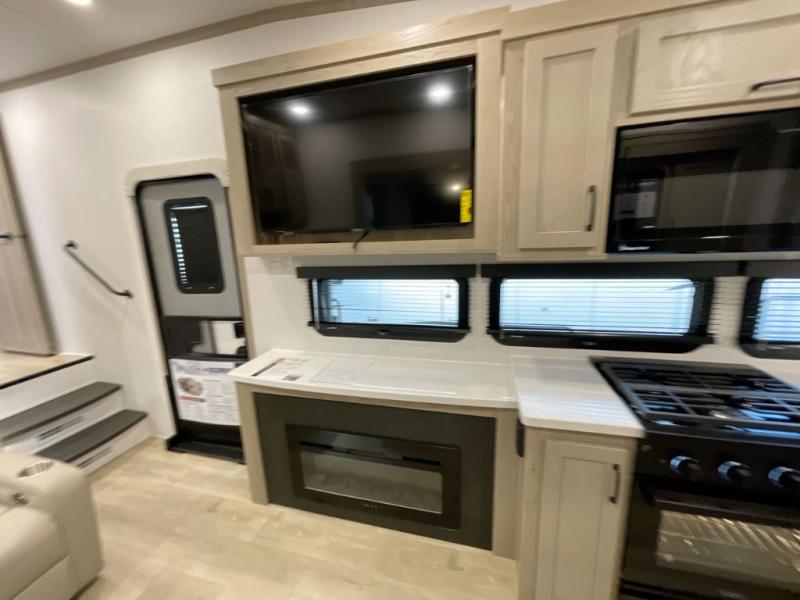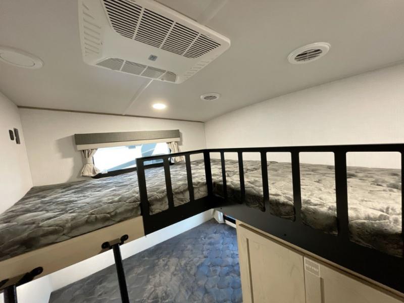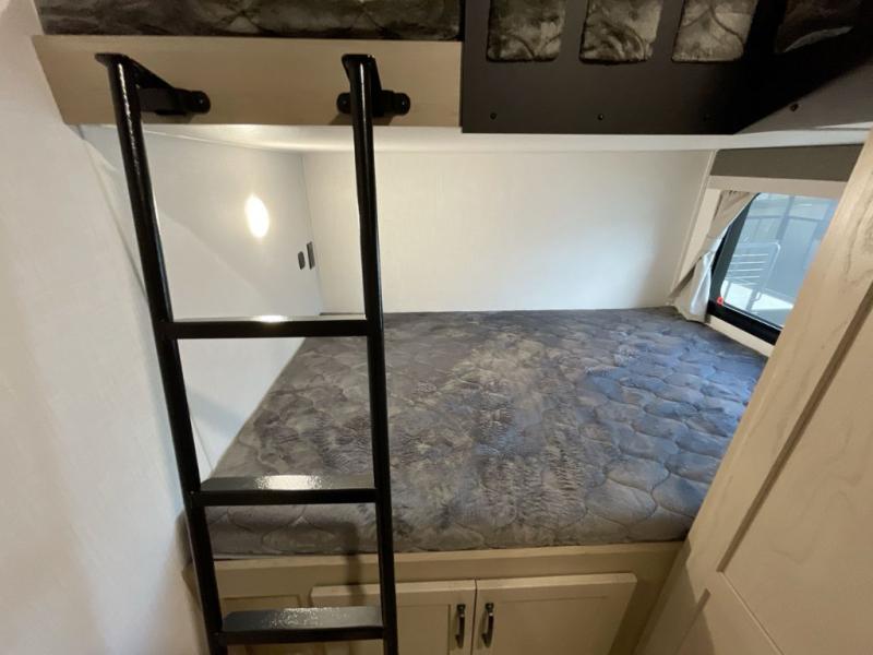 Looking to travel with your family and friends and need lots of space for everyone? This fifth wheel offers a front private bedroom with a queen bed, a spacious wardrobe, and a TV option for shows in bed. On the opposite side of the unit there is a private bunkhouse with triple bunks, plus washer and dryer prep. The main living and kitchen area includes a slide out which offers a king U-shaped dinette to dine at, play games with friends, and provides sleeping if needed, plus a 12V refrigerator and a pantry. There is also a 55" theater seat here for more comfort. The cook will have full amenities indoors plus an outside kitchen when the weather is nice. There are also two power awnings, Solid Entry steps, a rear 2" towing hitch, and more exterior conveniences!