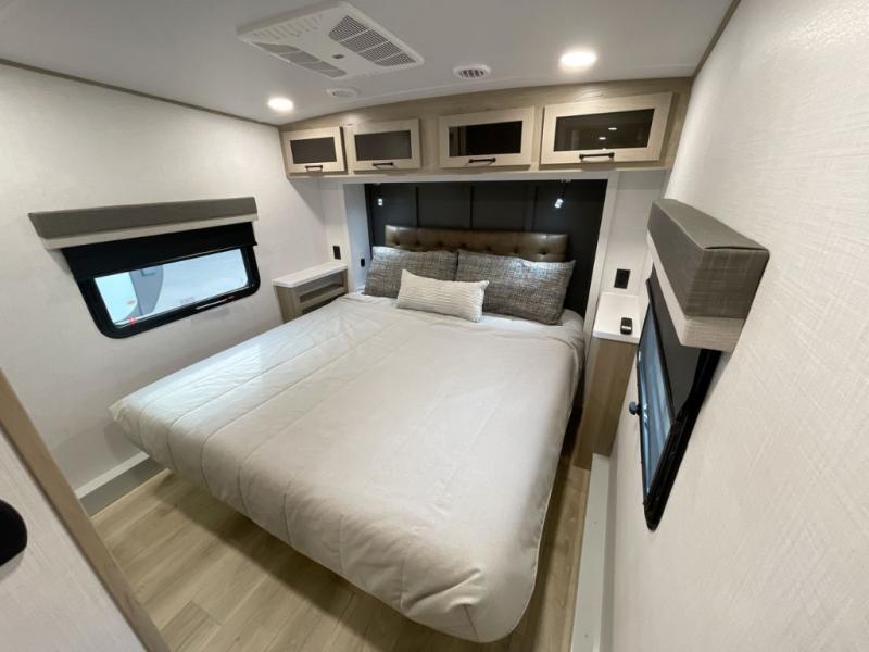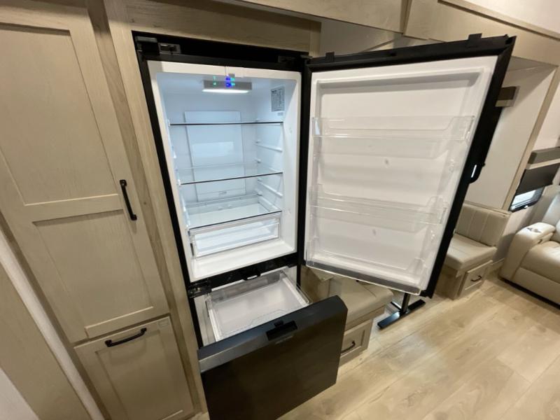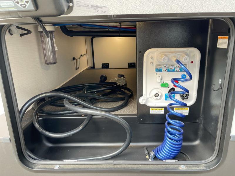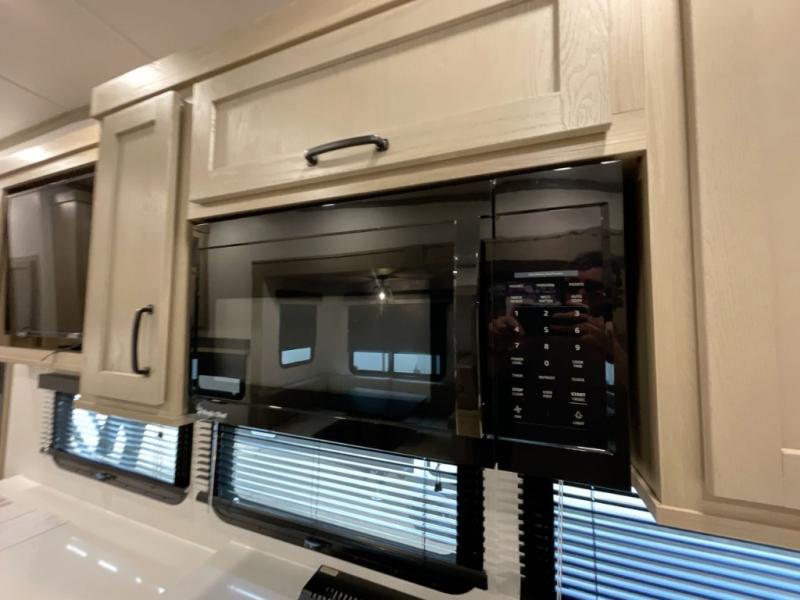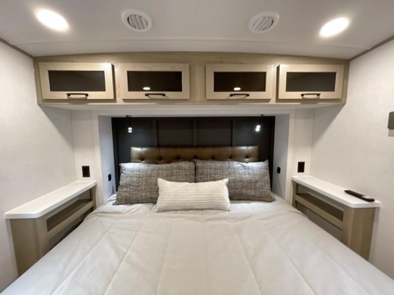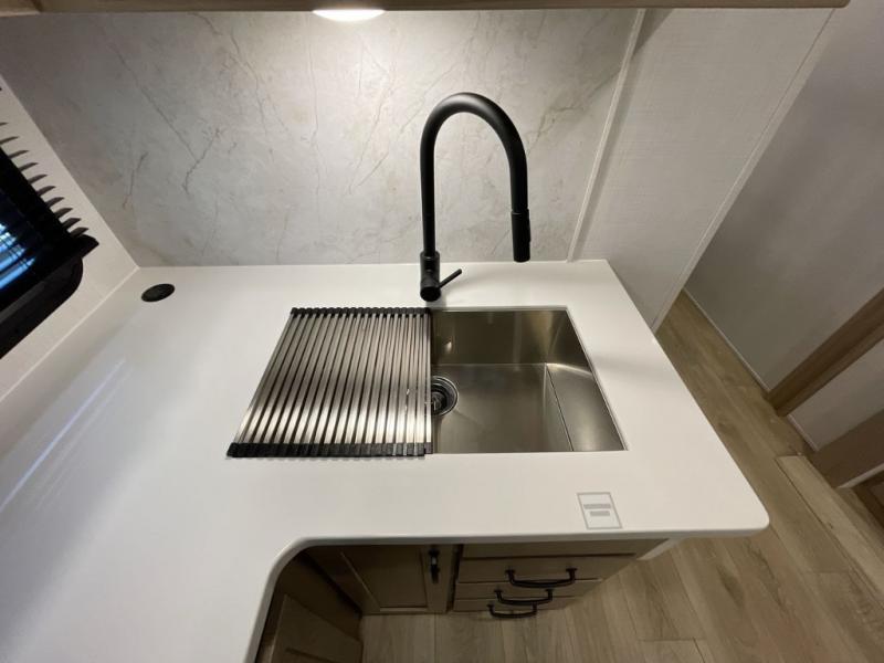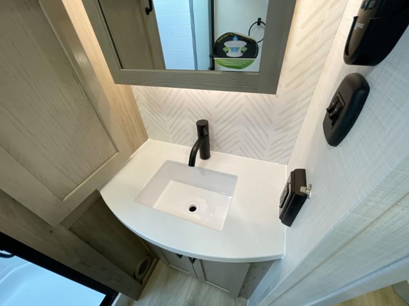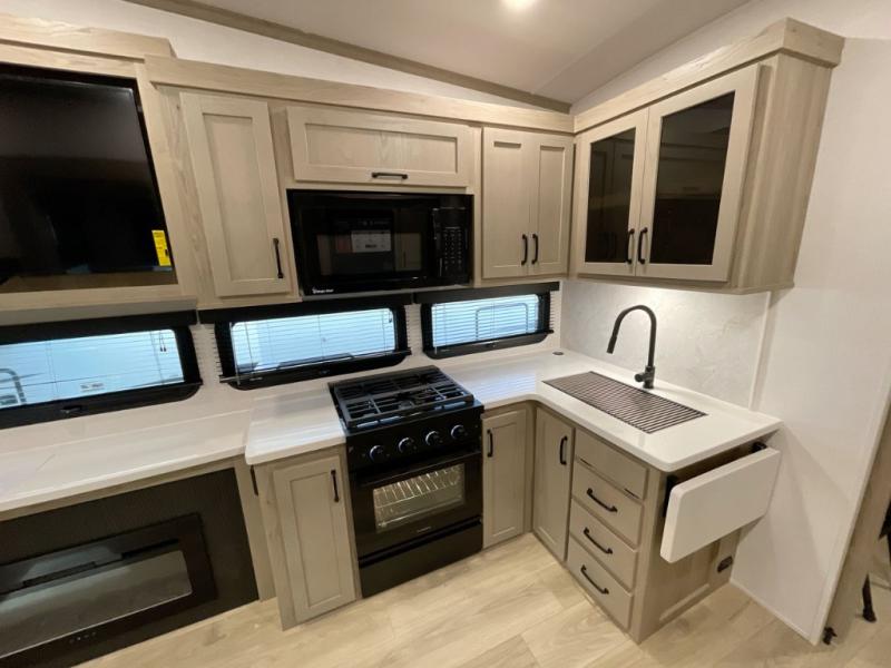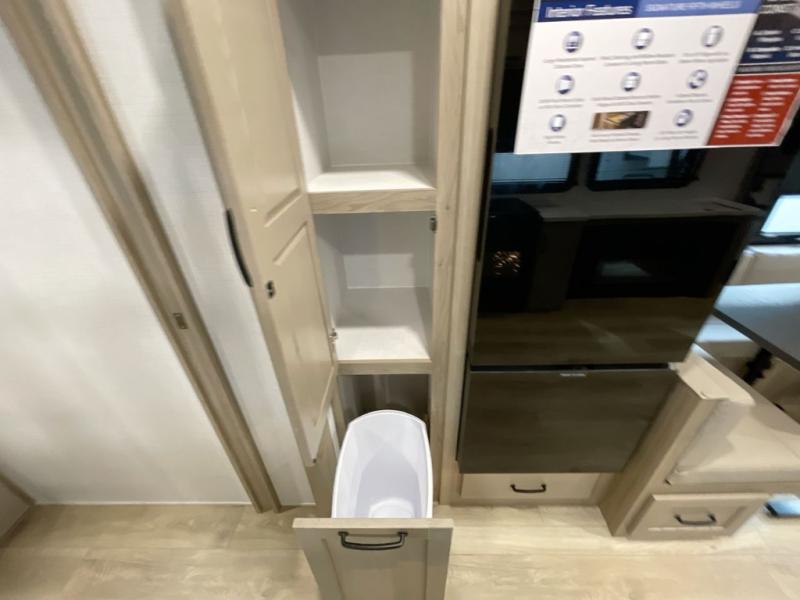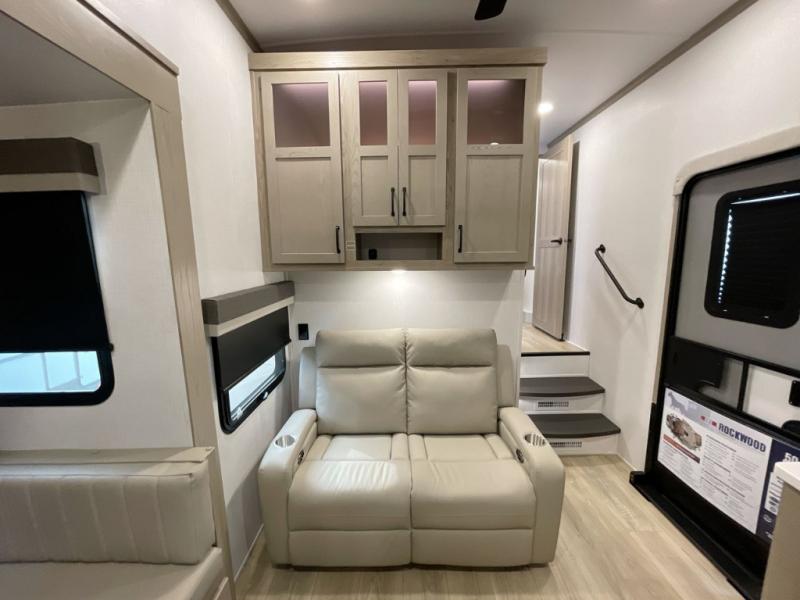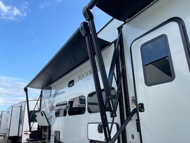 With any Rockwood Signature fifth wheel or travel trailer by Forest River RV, you will enjoy superior construction that includes laminated white fiberglass sidewalls, a radius roof with vaulted interior ceilings, plus radiant foil insulation and an enclosed underbelly for use in all types of weather. Some convenient exterior features include Keyed Alike locks, a rear ladder, a 200W solar panel, and a tire pressure monitor system with a monitor for added safety. The interior offers a One Touch OneControl panel with WeRV app control, for lights, awning, slides, water heater and more, and the Air 360+ omnidirectional antenna with WiFi prep lets you work while away from home if needed. You will also appreciate the interior vaulted ceilings, residential soft close doors and drawers, solid surface kitchen countertops, and designer kitchen backsplash!