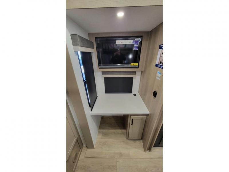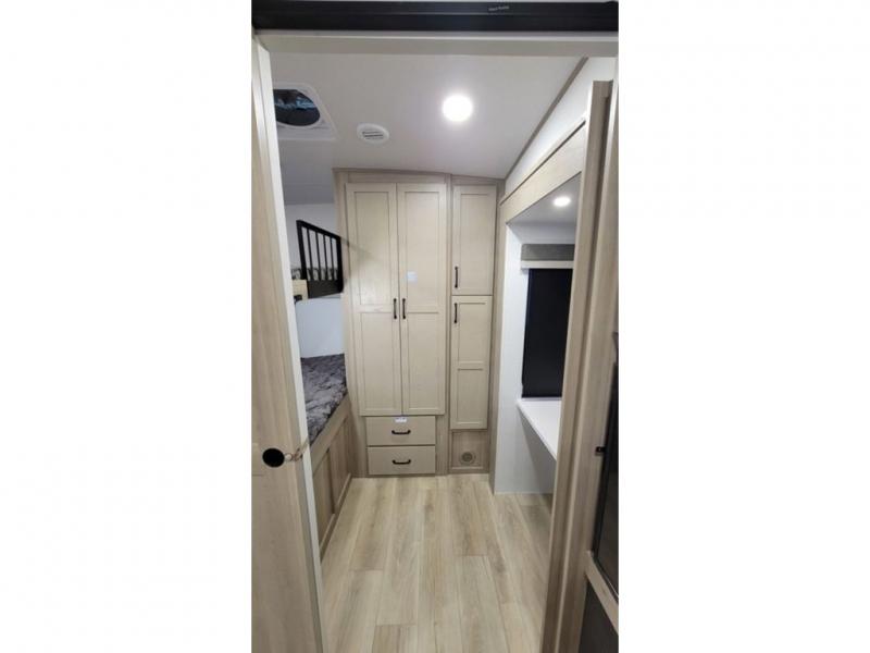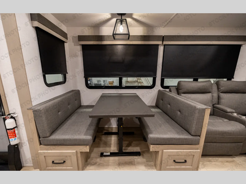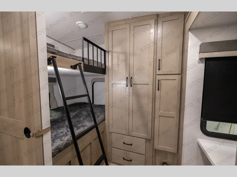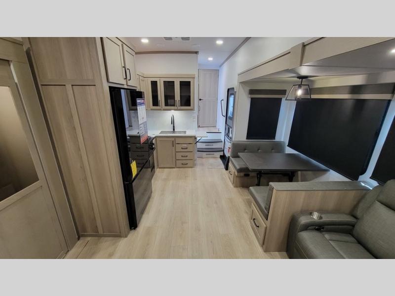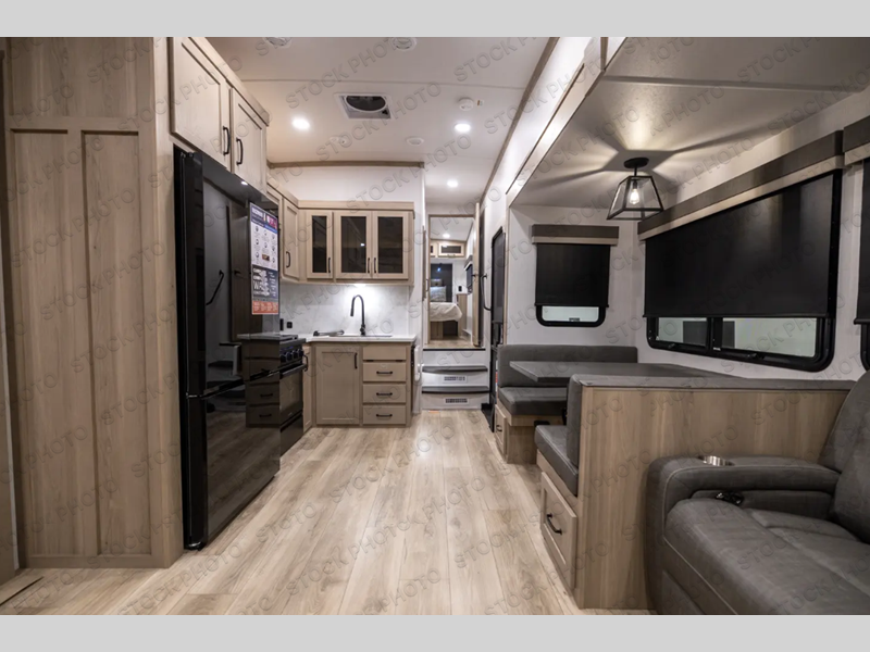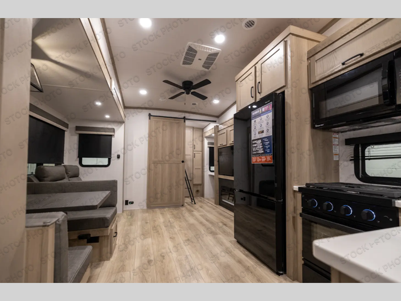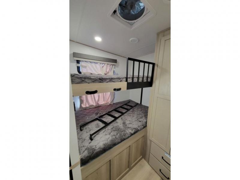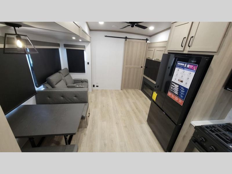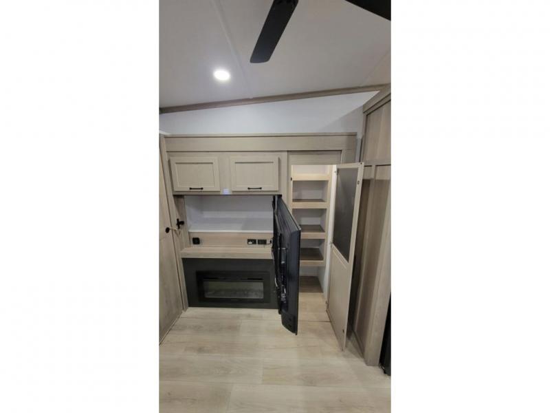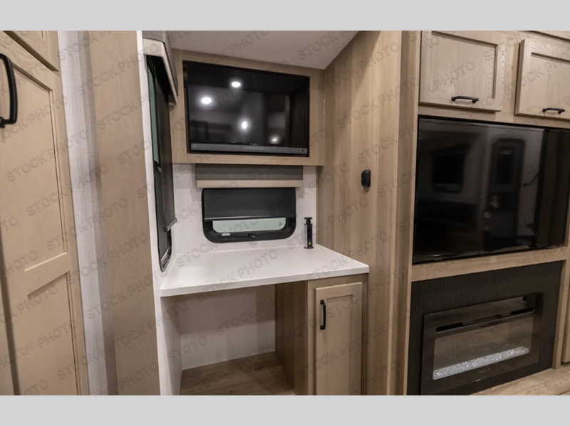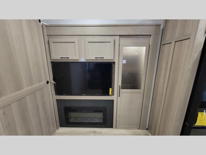 This fifth wheel is one the whole gang will love to camp in! The rear bunkhouse includes two bunk beds, a desk with a chair, plus a wardrobe with washer and dryer prep if you choose to add those appliances. The slide here extends into the main living area and also includes the Smart TV and fireplace. You can get comfortable on the theater seat or play a game at the booth dinette while the chef cooks dinner in the full kitchen. The full bath is close to the front private bedroom for convenience, and you'll sleep soundly on the queen bed!
