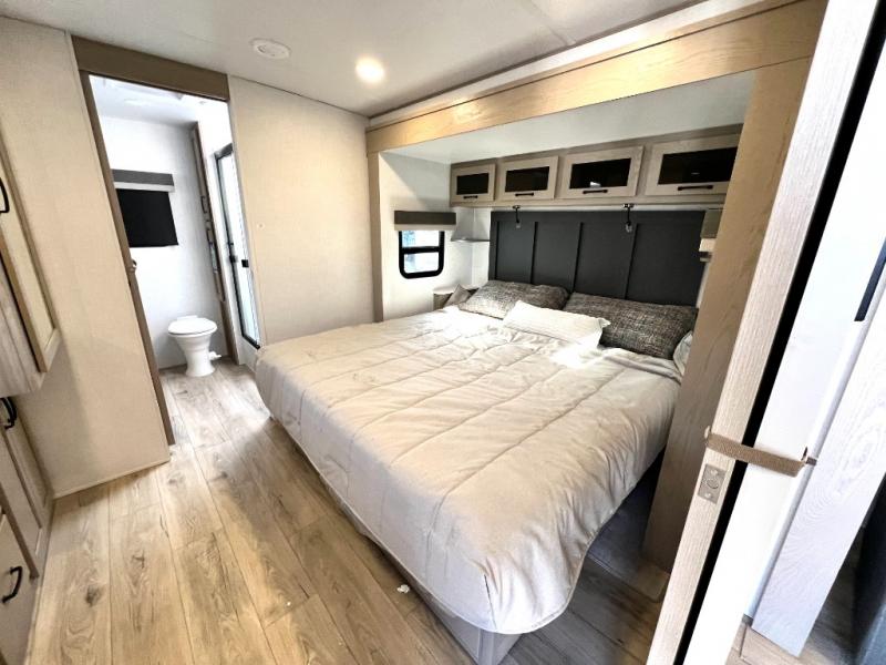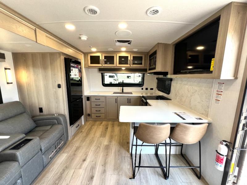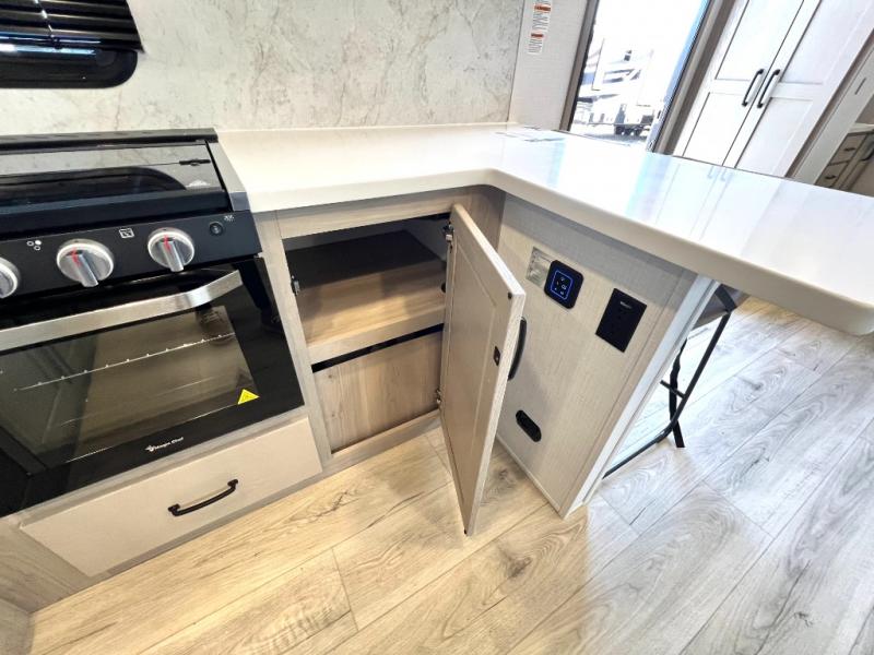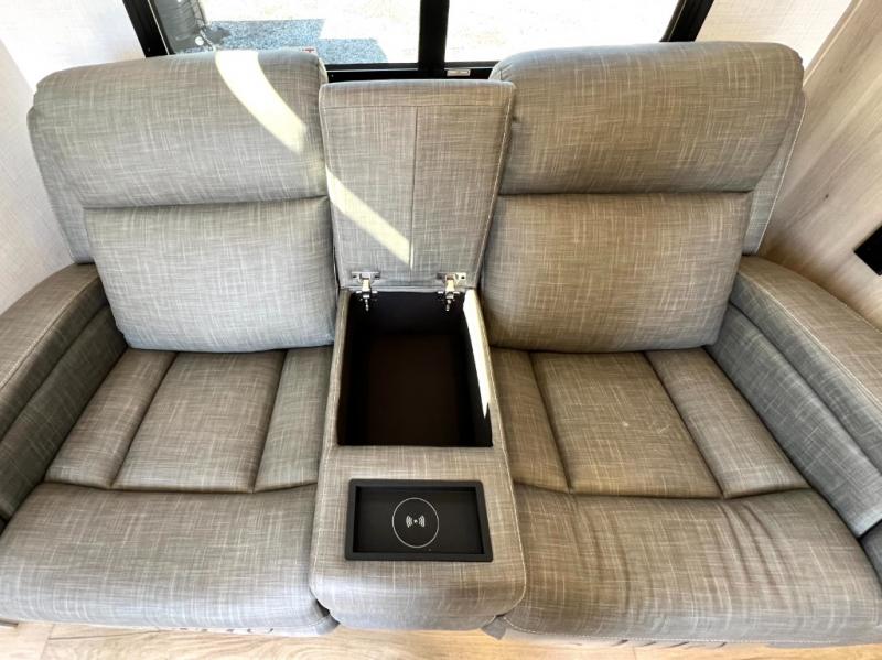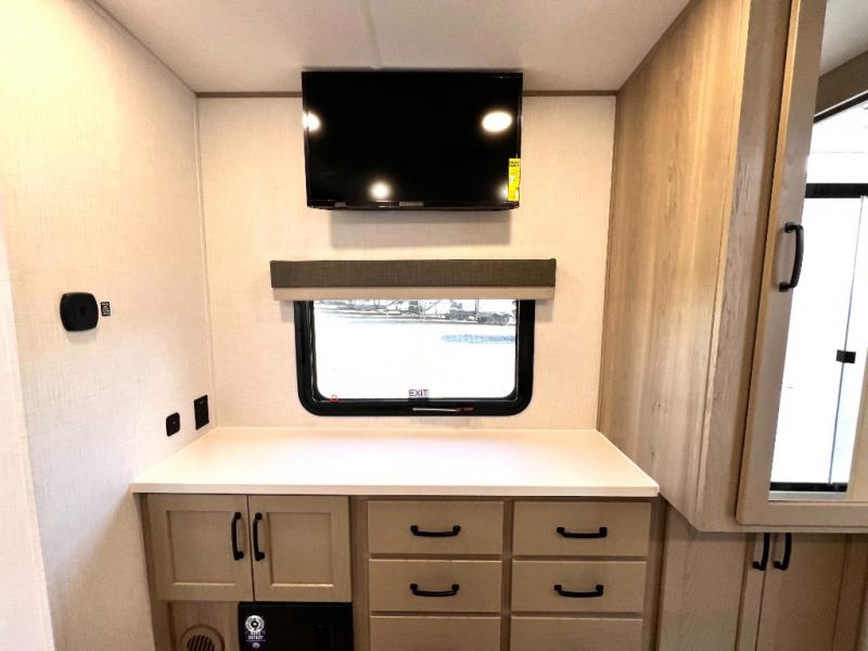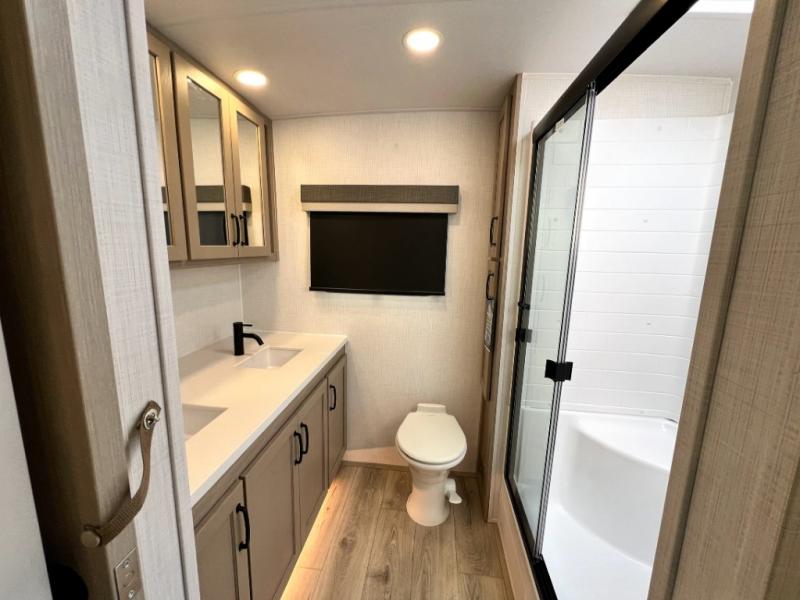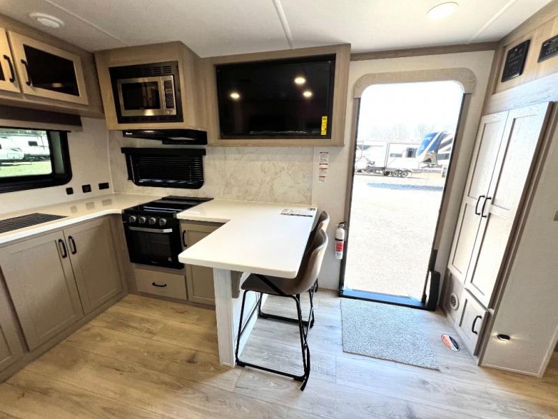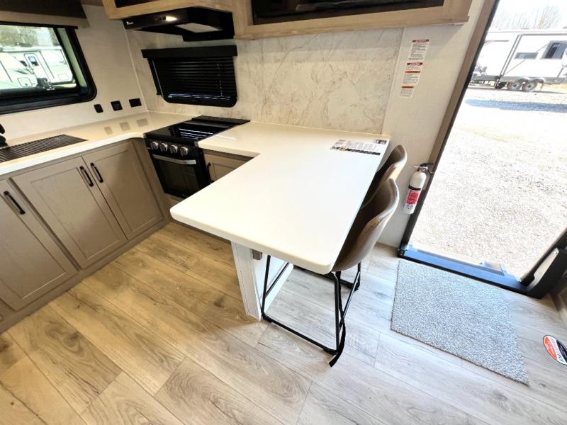This front kitchen, couple's trailer is ready for adventure when you are! Once you arrive at your destination, prepare a quick lunch on the outside griddle, and enjoy the shade provided by the 19' power awning. You can eat outside, or inside at the counter with stools. The theatre seat will make this travel trailer feel more like home, and the double slides provide more space to stretch out. Within the master bedroom you'll find a king bed, a large wardrobe and a dresser, plus an optional TV. And check out the full rear bath with dual bath sinks and a shower with a seat! Now, that's what I call comfort!