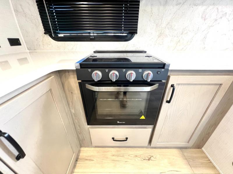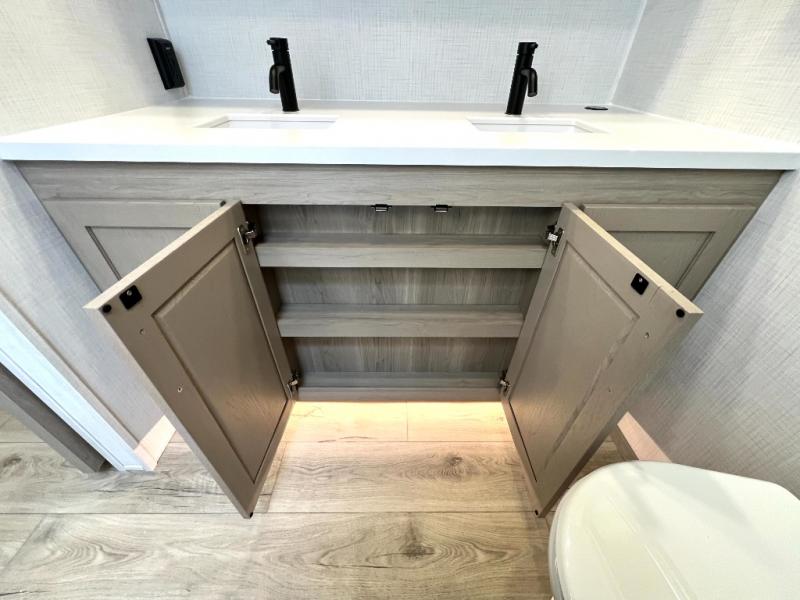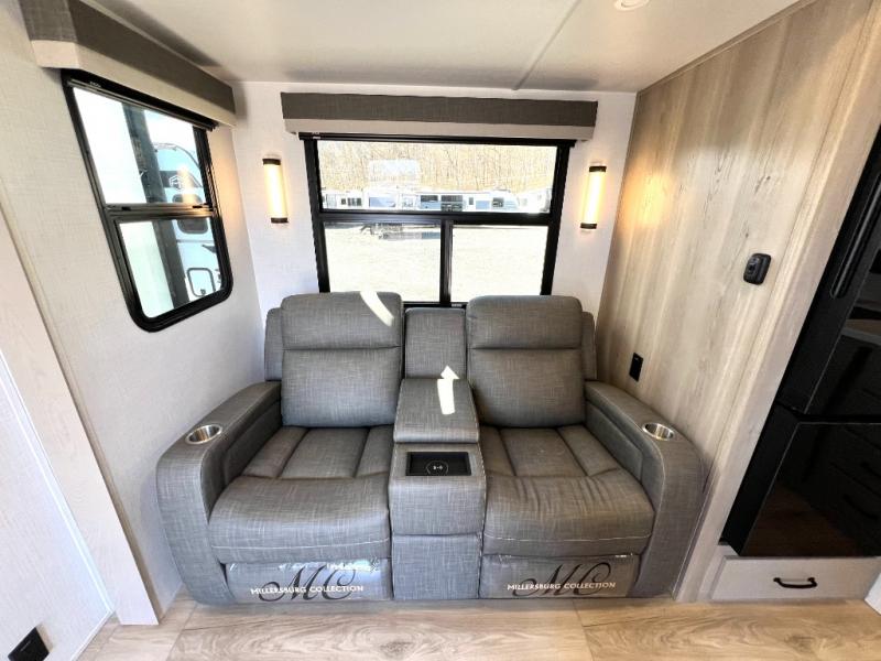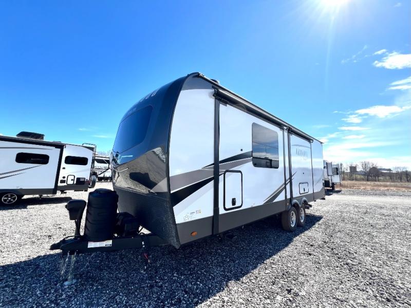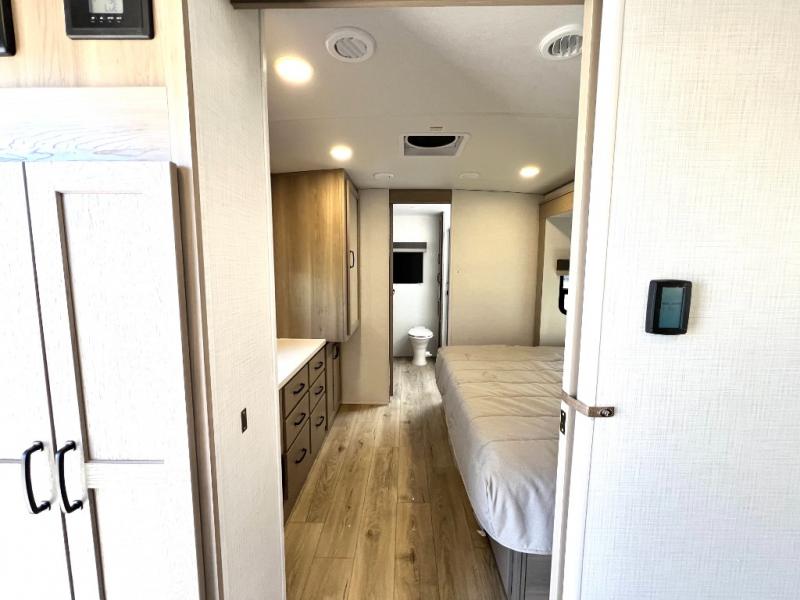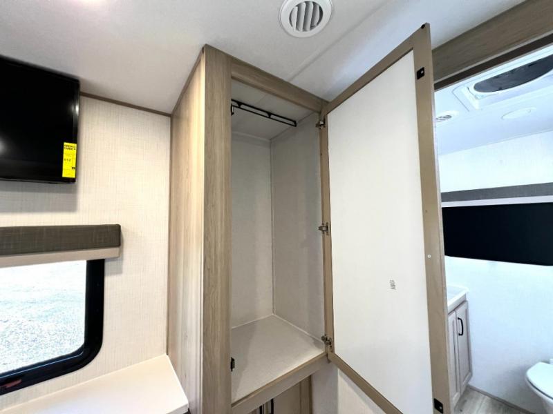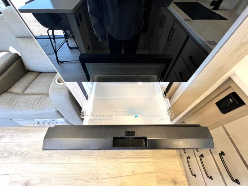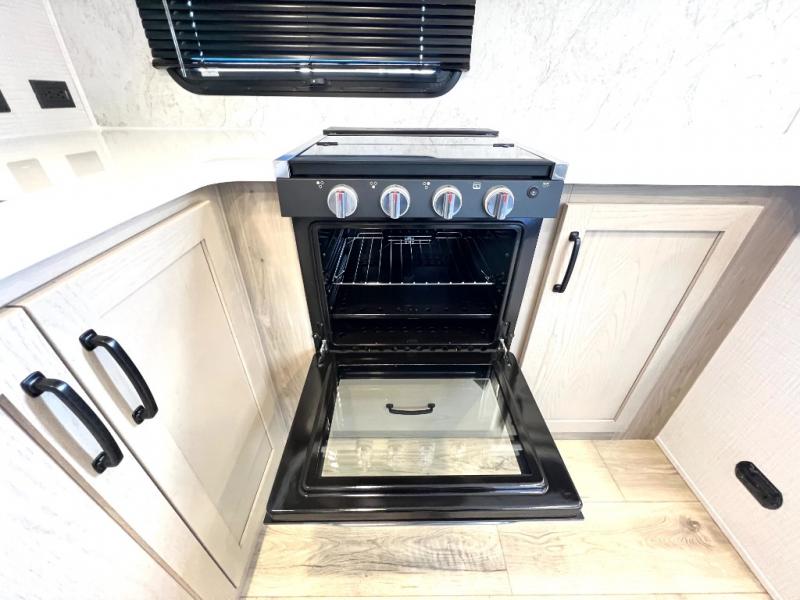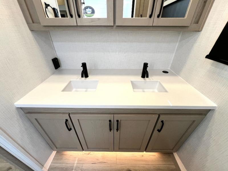 This front kitchen, couple's trailer is ready for adventure when you are! Once you arrive at your destination, prepare a quick lunch on the outside griddle, and enjoy the shade provided by the 19' power awning. You can eat outside, or inside at the counter with stools. The theatre seat will make this travel trailer feel more like home, and the double slides provide more space to stretch out. Within the master bedroom you'll find a king bed, a large wardrobe and a dresser, plus an optional TV. And check out the full rear bath with dual bath sinks and a shower with a seat! Now, that's what I call comfort!