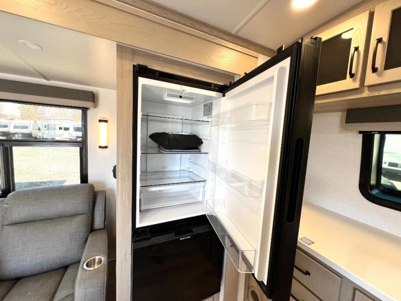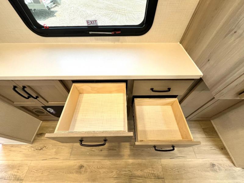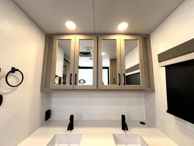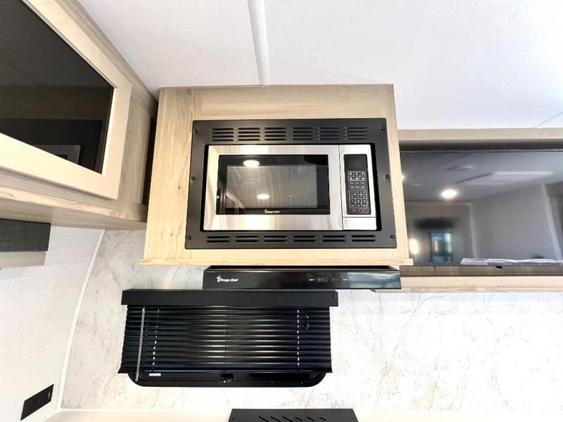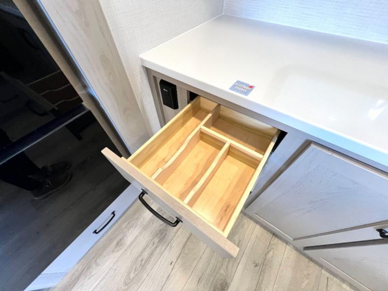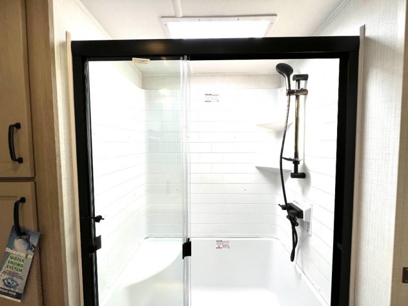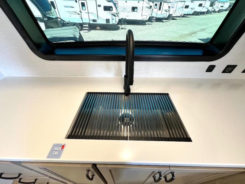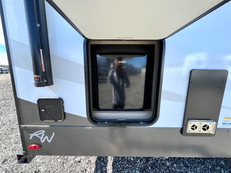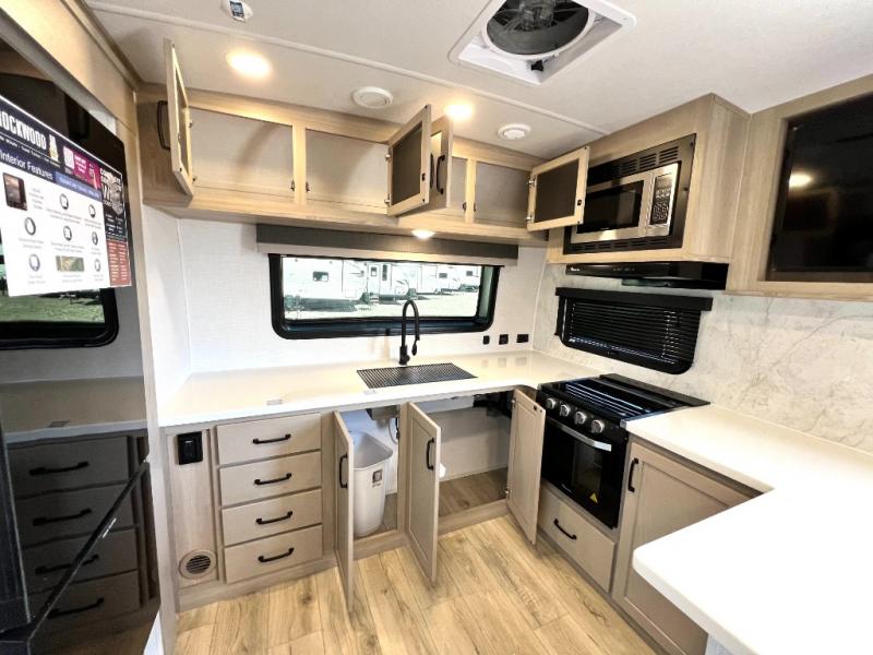 With any Rockwood Signature fifth wheel or travel trailer by Forest River RV, you will enjoy superior construction that includes laminated white fiberglass sidewalls, a radius roof with vaulted interior ceilings, plus radiant foil insulation and an enclosed underbelly for use in all types of weather. Some convenient exterior features include Keyed Alike locks, a rear ladder, a 200W solar panel, and a tire pressure monitor system with a monitor for added safety. The interior offers a One Touch OneControl panel with WeRV app control, for lights, awning, slides, water heater and more, and the Air 360+ omnidirectional antenna with WiFi prep lets you work while away from home if needed. You will also appreciate the interior vaulted ceilings, residential soft close doors and drawers, solid surface kitchen countertops, and designer kitchen backsplash!
