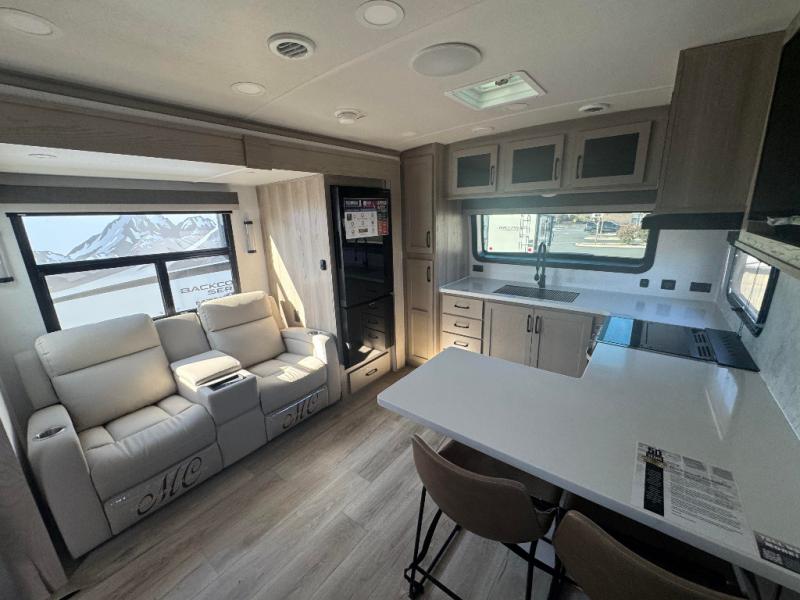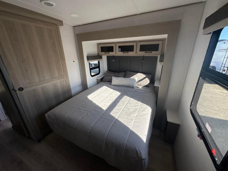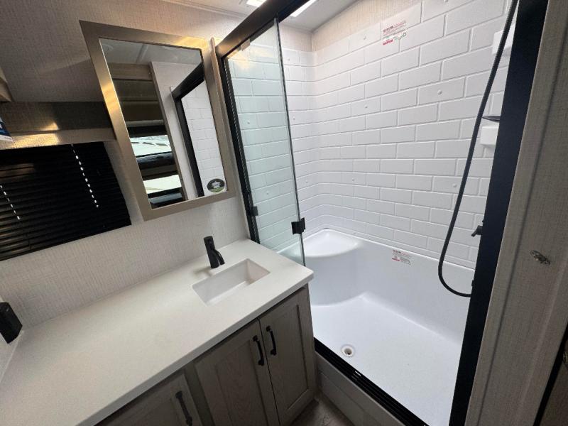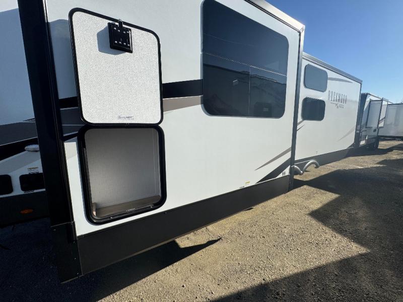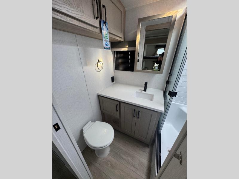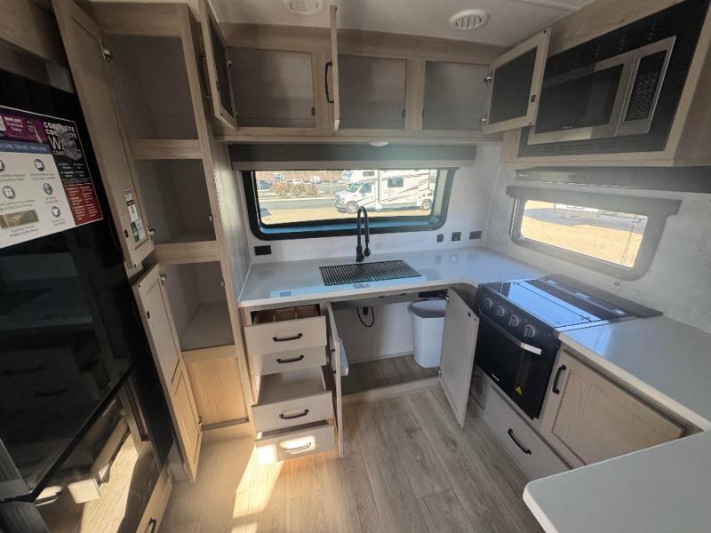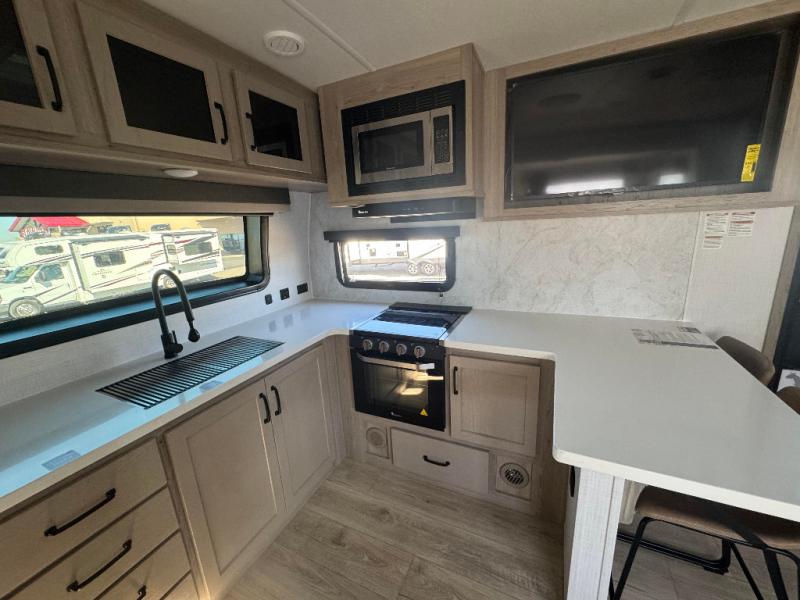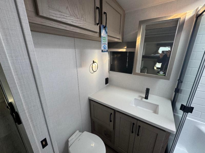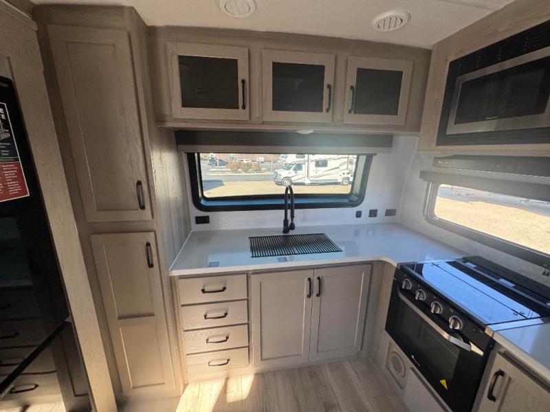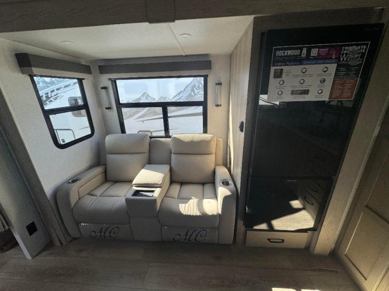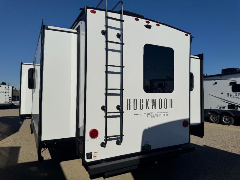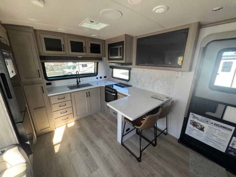 With any Rockwood Signature fifth wheel or travel trailer by Forest River RV, you will enjoy superior construction that includes laminated white fiberglass sidewalls, a radius roof with vaulted interior ceilings, plus radiant foil insulation and an enclosed underbelly for use in all types of weather. Some convenient exterior features include Keyed Alike locks, a rear ladder, a 200W solar panel, and a tire pressure monitor system with a monitor for added safety. The interior offers a One Touch OneControl panel with WeRV app control, for lights, awning, slides, water heater and more, and the Air 360+ omnidirectional antenna with WiFi prep lets you work while away from home if needed. You will also appreciate the interior vaulted ceilings, residential soft close doors and drawers, solid surface kitchen countertops, and designer kitchen backsplash!