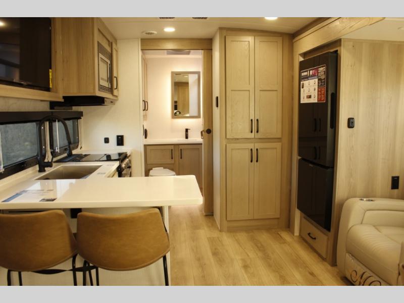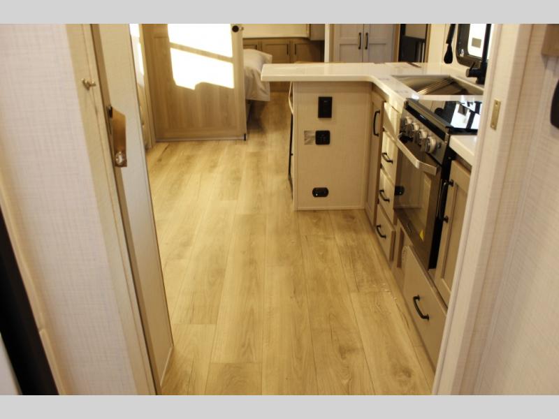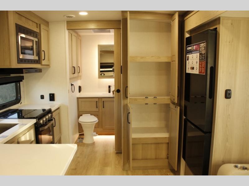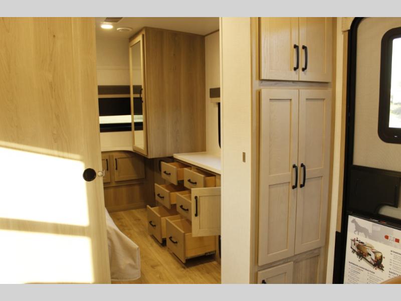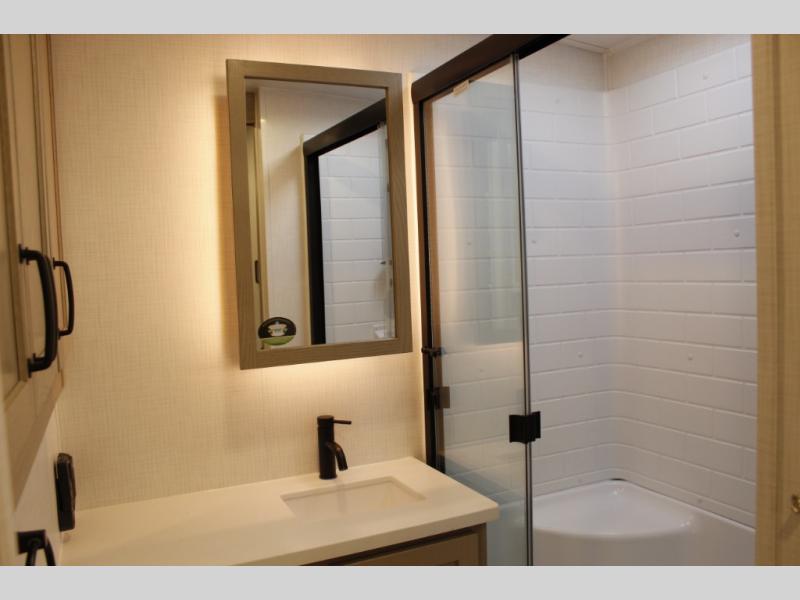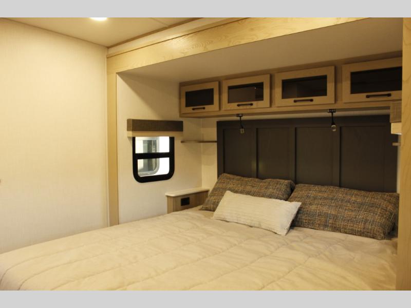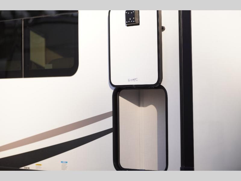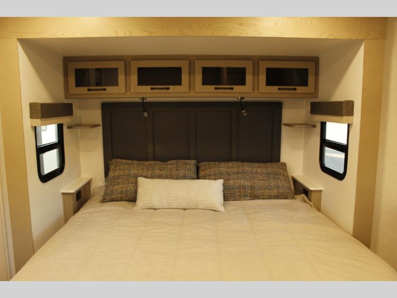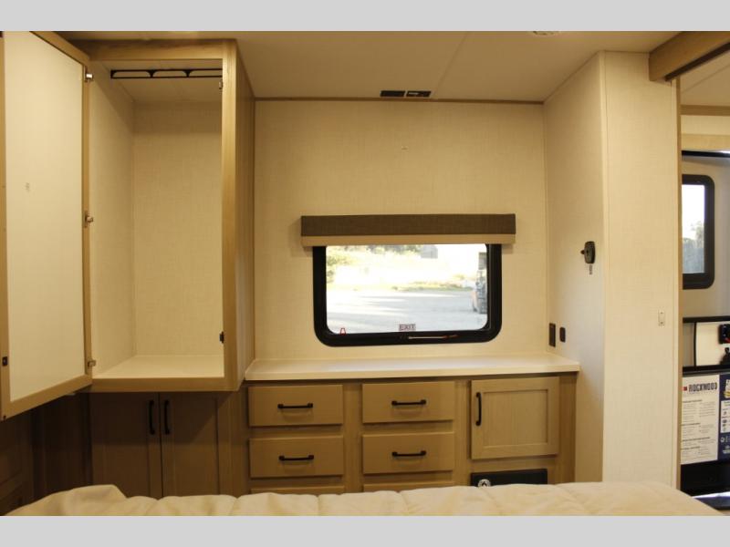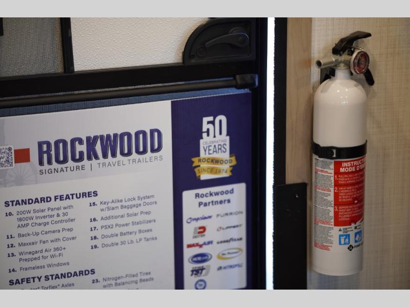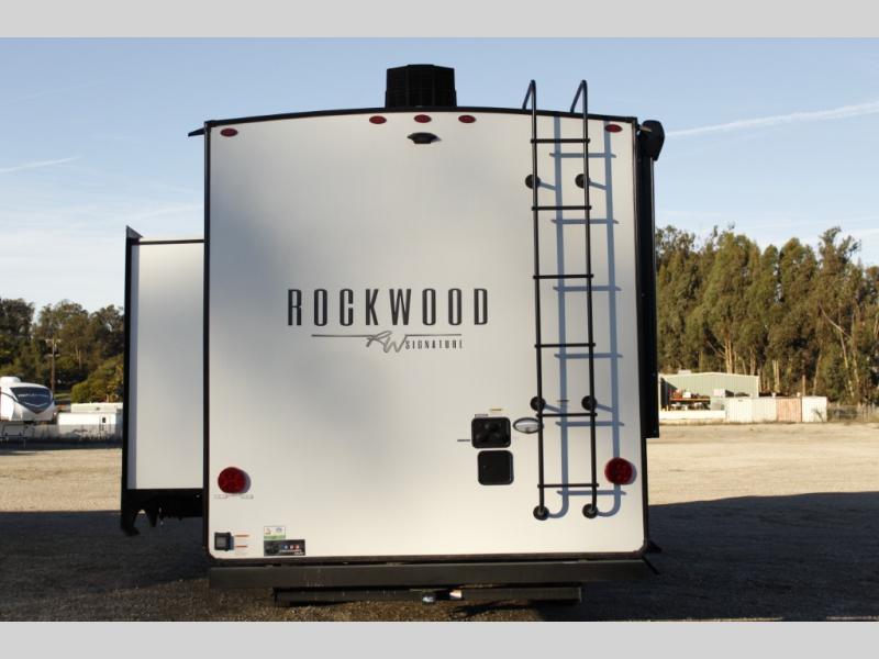 With any Rockwood Signature fifth wheel or travel trailer by Forest River RV, you will enjoy superior construction that includes laminated white fiberglass sidewalls, a radius roof with vaulted interior ceilings, plus radiant foil insulation and an enclosed underbelly for use in all types of weather. Some convenient exterior features include Keyed Alike locks, a rear ladder, a 200W solar panel, and a tire pressure monitor system with a monitor for added safety. The interior offers a One Touch OneControl panel with WeRV app control, for lights, awning, slides, water heater and more, and the Air 360+ omnidirectional antenna with WiFi prep lets you work while away from home if needed. You will also appreciate the interior vaulted ceilings, residential soft close doors and drawers, solid surface kitchen countertops, and designer kitchen backsplash!