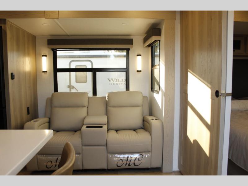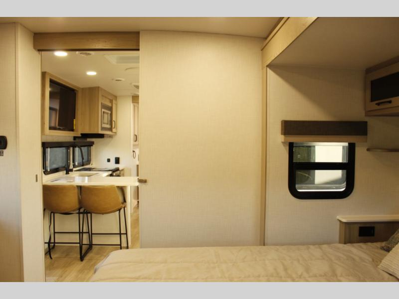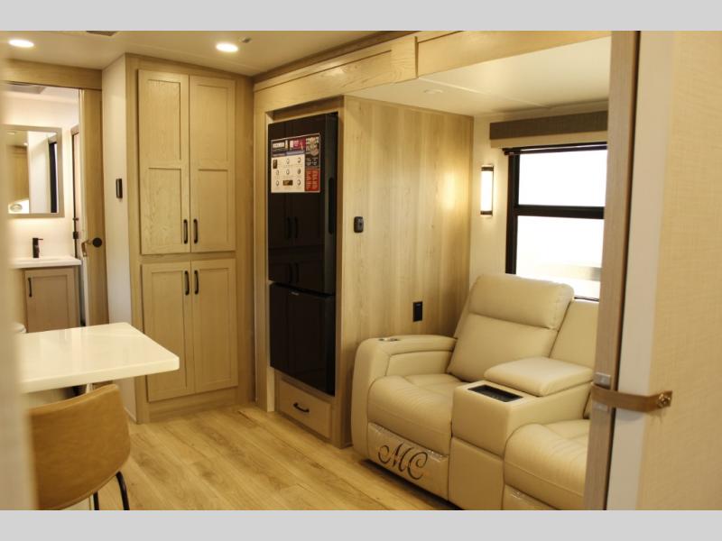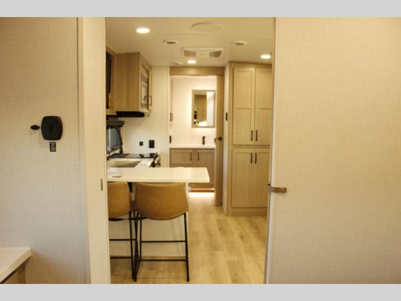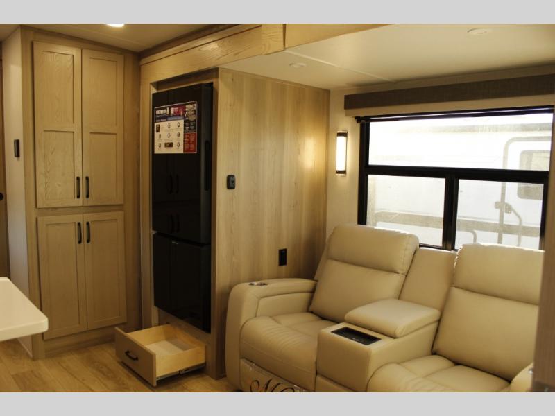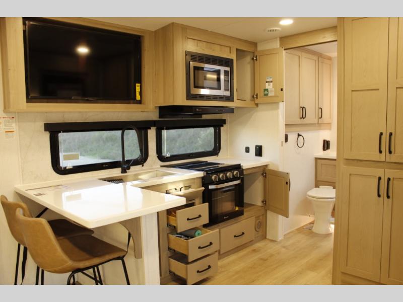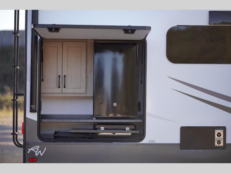 This couple's trailer is ready for adventure when you are! Once you arrive at your destination, prepare a quick lunch inside or outside with the outdoor kitchen and griddle, all while enjoying a bit of shade provided by the 22' power awning. You can eat outside, or inside at the counter with stools. The 67" theatre seat will make this travel trailer feel more like home, and the double slides provide more space to stretch out. Within the master bedroom you'll find a king bed slide, a wardrobe and a closet, plus countertop along the front wall with storage beneath, and a spot for an optional TV. Don't overlook the rear bath with linen storage, a vanity, and a shower with a seat! Now, that's what I call comfort!