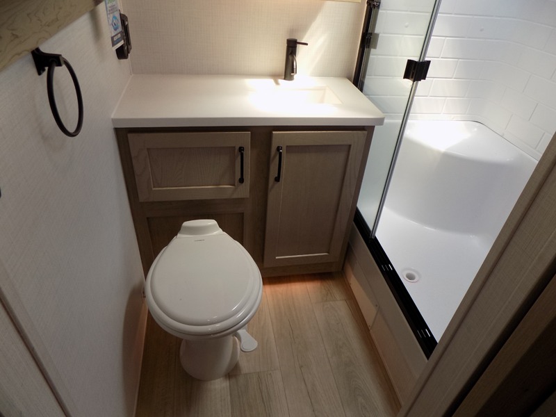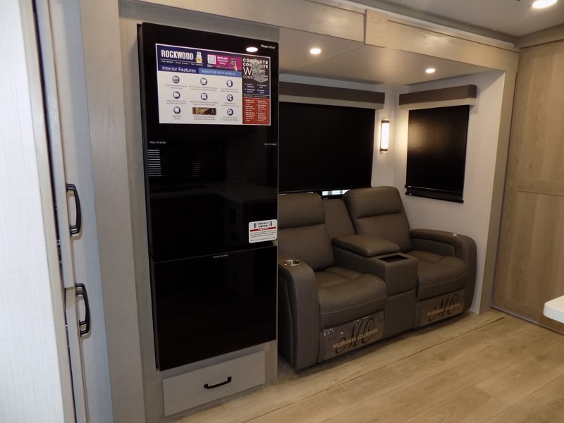 With any Rockwood Signature fifth wheel or travel trailer by Forest River RV, you will enjoy superior construction that includes laminated white fiberglass sidewalls, a radius roof with vaulted interior ceilings, plus radiant foil insulation and an enclosed underbelly for use in all types of weather. Some convenient exterior features include Keyed Alike locks, a rear ladder, a 200W solar panel, and a tire pressure monitor system with a monitor for added safety. The interior offers a One Touch OneControl panel with WeRV app control, for lights, awning, slides, water heater and more, and the Air 360+ omnidirectional antenna with WiFi prep lets you work while away from home if needed. You will also appreciate the interior vaulted ceilings, residential soft close doors and drawers, solid surface kitchen countertops, and designer kitchen backsplash!