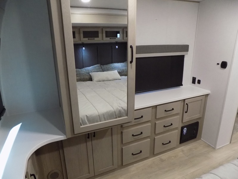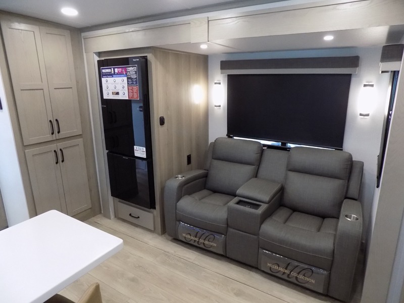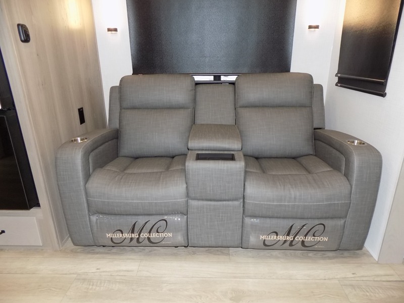 This couple's trailer is ready for adventure when you are! Once you arrive at your destination, prepare a quick lunch inside or outside with the outdoor kitchen and griddle, all while enjoying a bit of shade provided by the 22' power awning. You can eat outside, or inside at the counter with stools. The 67" theatre seat will make this travel trailer feel more like home, and the double slides provide more space to stretch out. Within the master bedroom you'll find a king bed slide, a wardrobe and a closet, plus countertop along the front wall with storage beneath, and a spot for an optional TV. Don't overlook the rear bath with linen storage, a vanity, and a shower with a seat! Now, that's what I call comfort!