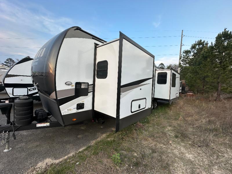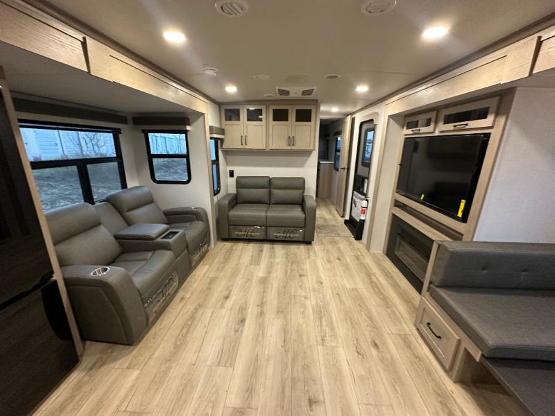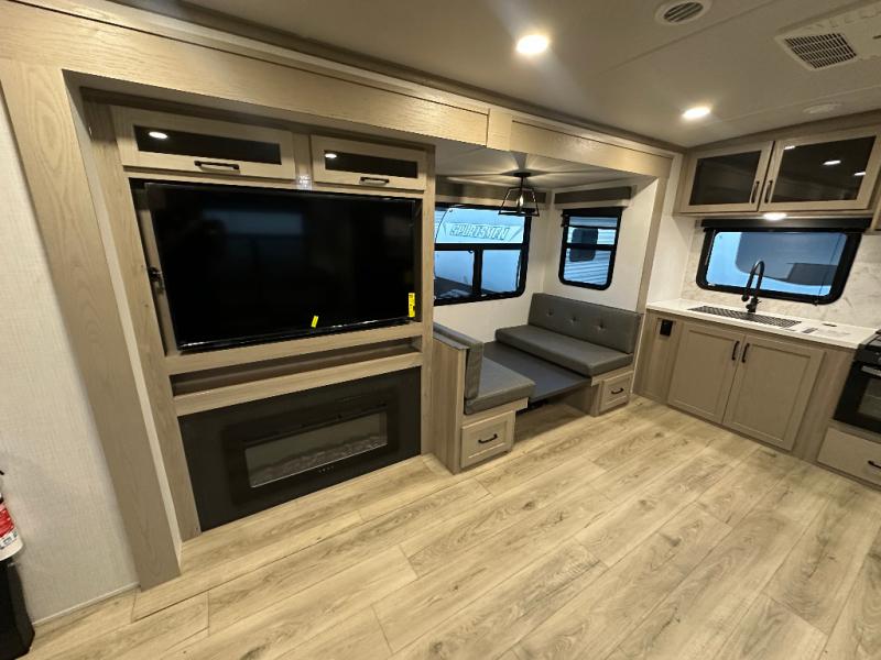 One step inside this rear kitchen travel trailer and you'll be sold! The dual opposing slides create an open floorplan you are sure to love, and you'll find plenty of seating spaces on the theater seat, the hide-a-bed sofa, and at the booth dinette. There is an entertainment center here with a Smart TV, plus a fireplace for those cooler nights. The full bath includes a shower with a seat, and the front private bedroom includes a queen bed slide out for more floor space. You can easily store your items in the large front wardrobe, plus there is a dresser and additional storage with washer and dryer prep. And check out the exterior with two power awnings, an outside kitchen, plus exterior storage for all your gear!