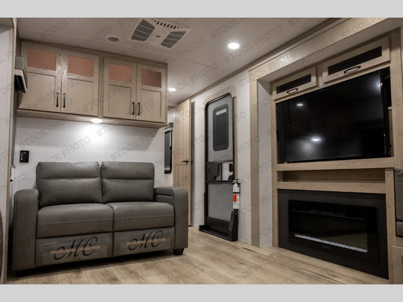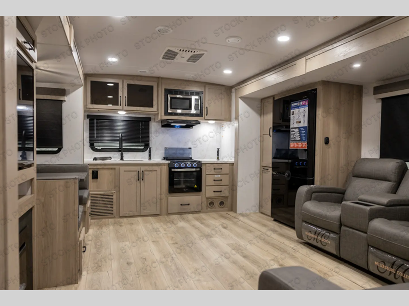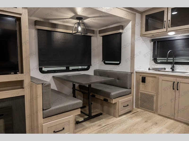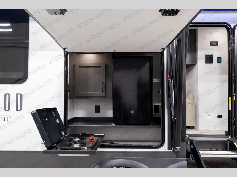 One step inside this rear kitchen travel trailer and you'll be sold! The dual opposing slides create an open floorplan you are sure to love, and you'll find plenty of seating spaces on the theater seat, the hide-a-bed sofa, and at the booth dinette. There is an entertainment center here with a Smart TV, plus a fireplace for those cooler nights. The full bath includes a shower with a seat, and the front private bedroom includes a queen bed slide out for more floor space. You can easily store your items in the large front wardrobe, plus there is a dresser and additional storage with washer and dryer prep. And check out the exterior with two power awnings, an outside kitchen, plus exterior storage for all your gear!