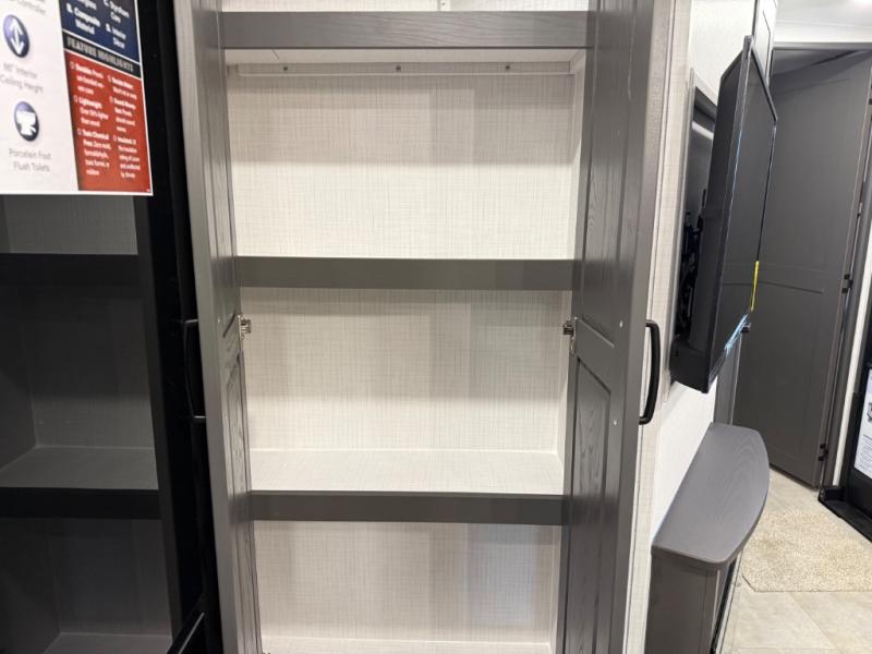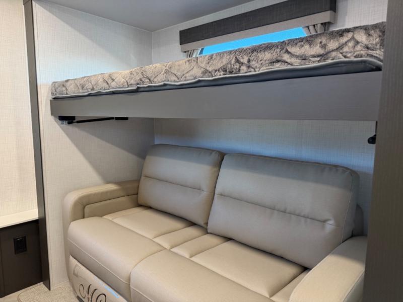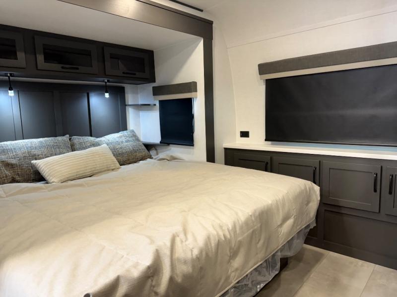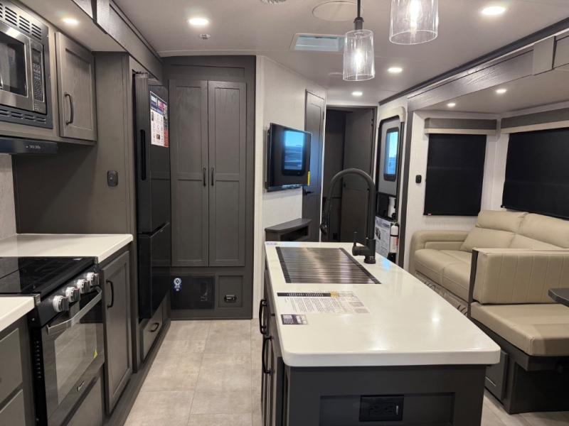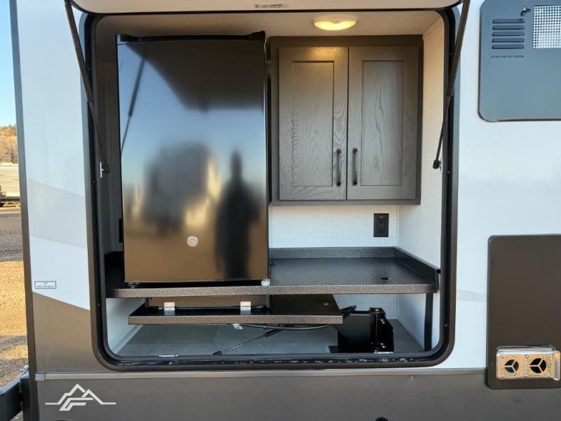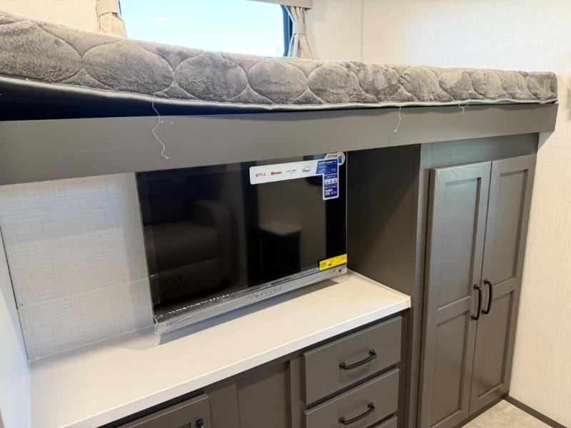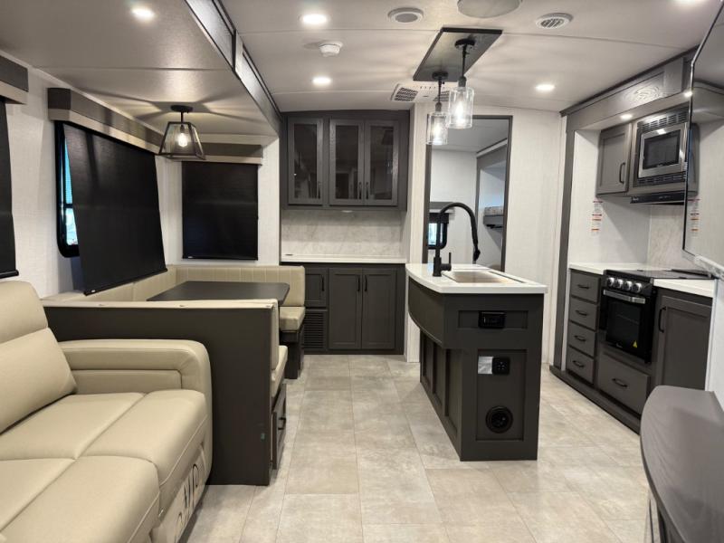 Family vacations and weekend excursions with friends just got sweeter with this travel trailer in tow. The rear private bunkhouse includes a slide out for more space, two bunks, a pull-out sofa, and a wardrobe for clothes. Head to the main living area to relax on the hide-a-bed sofa by the fireplace, or prepare lunch at the kitchen island. If the weather is nice, you may just want to go outdoors to cook on the outside kitchen. There are two power awnings here, and Solid Step entry steps for a sturdy entrance into the trailer. When it's time to call it a night, head to the front master bedroom to enjoy your queen bed slide out, large wardrobe, plus a large front counter with cabinets for more storage. There is even a second wardrobe with washer and dryer prep if you choose to add those appliances!