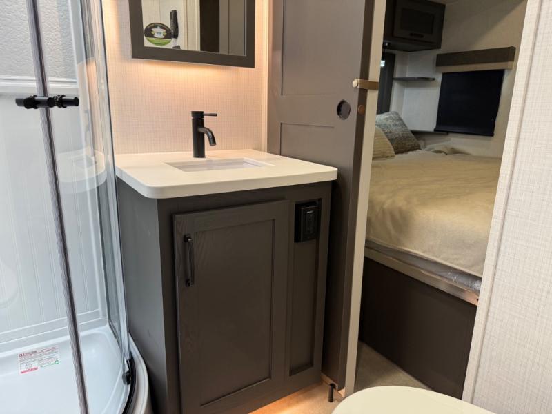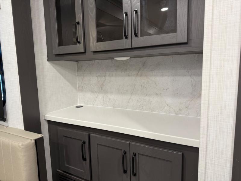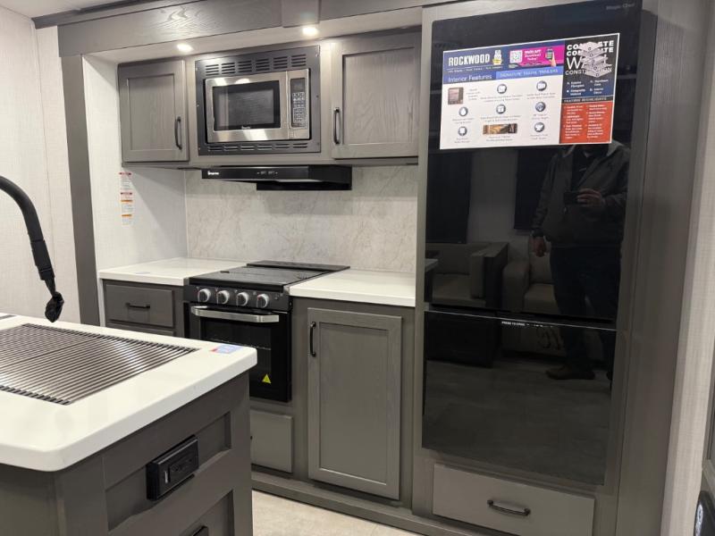 With any Rockwood Signature fifth wheel or travel trailer by Forest River RV, you will enjoy superior construction that includes laminated white fiberglass sidewalls, a radius roof with vaulted interior ceilings, plus radiant foil insulation and an enclosed underbelly for use in all types of weather. Some convenient exterior features include Keyed Alike locks, a rear ladder, a 200W solar panel, and a tire pressure monitor system with a monitor for added safety. The interior offers a One Touch OneControl panel with WeRV app control, for lights, awning, slides, water heater and more, and the Air 360+ omnidirectional antenna with WiFi prep lets you work while away from home if needed. You will also appreciate the interior vaulted ceilings, residential soft close doors and drawers, solid surface kitchen countertops, and designer kitchen backsplash!