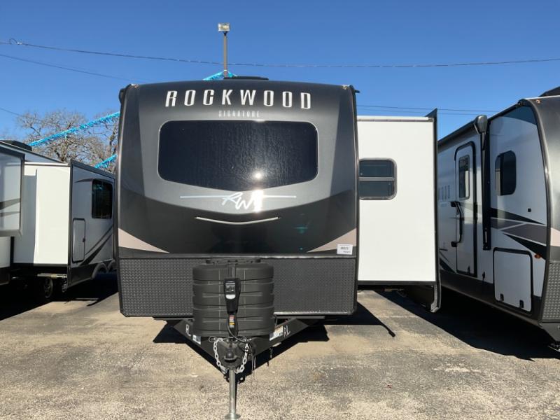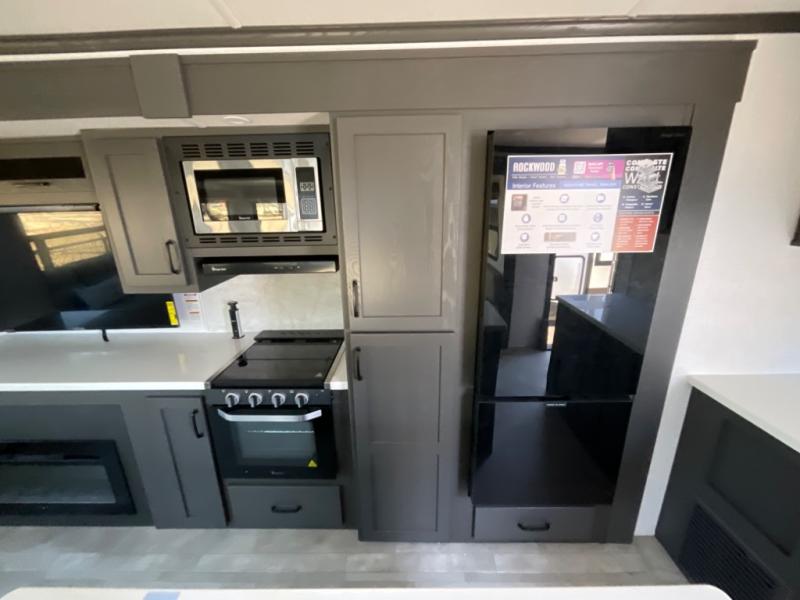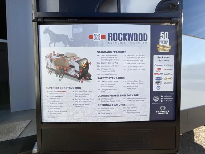 With any Rockwood Signature fifth wheel or travel trailer by Forest River RV, you will enjoy superior construction that includes laminated white fiberglass sidewalls, a radius roof with vaulted interior ceilings, plus radiant foil insulation and an enclosed underbelly for use in all types of weather. Some convenient exterior features include Keyed Alike locks, a rear ladder, a 200W solar panel, and a tire pressure monitor system with a monitor for added safety. The interior offers a One Touch OneControl panel with WeRV app control, for lights, awning, slides, water heater and more, and the Air 360+ omnidirectional antenna with WiFi prep lets you work while away from home if needed. You will also appreciate the interior vaulted ceilings, residential soft close doors and drawers, solid surface kitchen countertops, and designer kitchen backsplash!