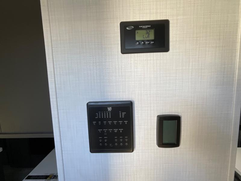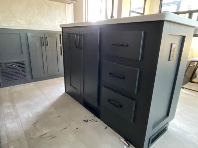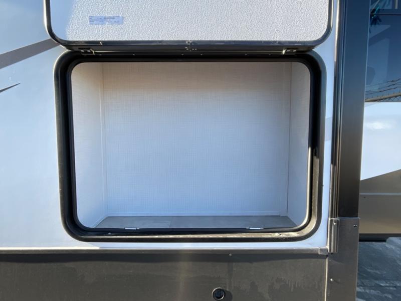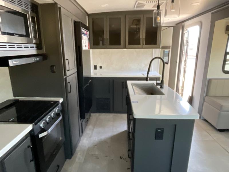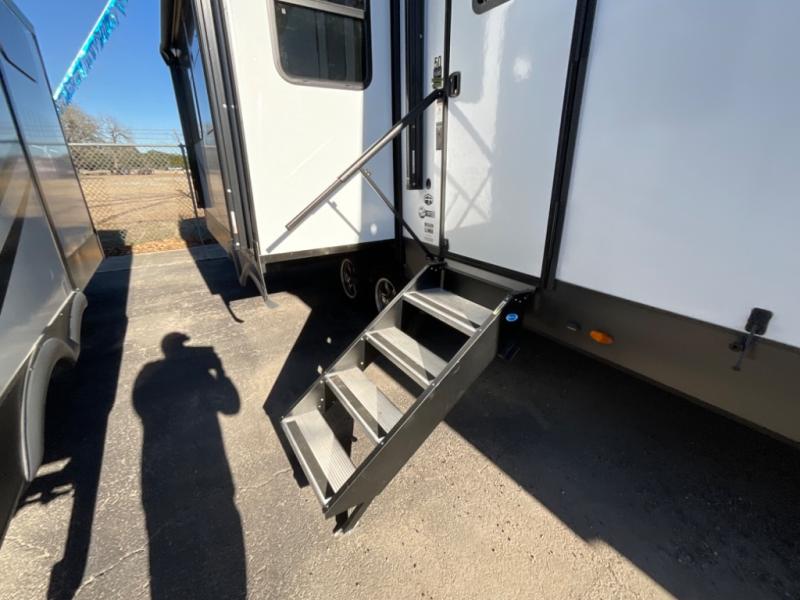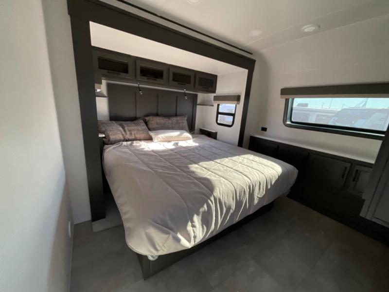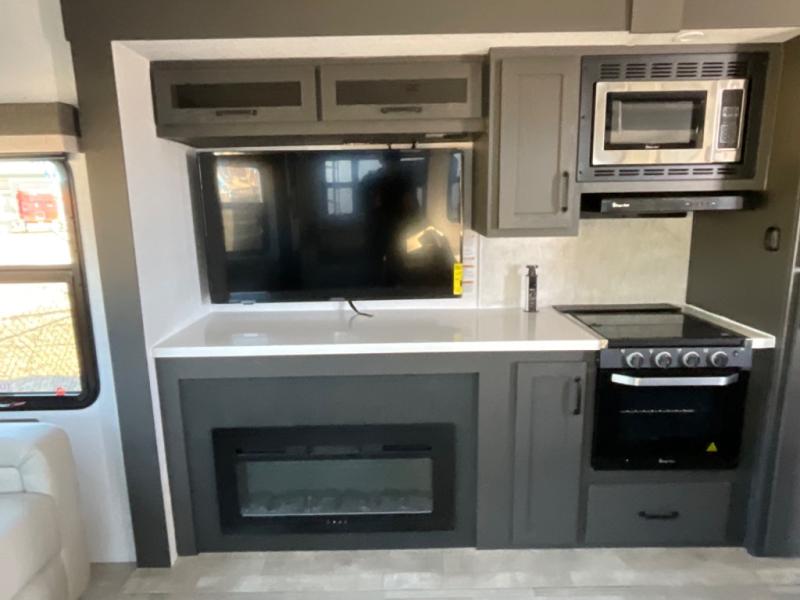 You're going to love the amount of natural light in this model with large windows in the back and the door side. The chef of the group will love the kitchen island, and there is tons of storage space for dishes, food, and knickknacks. The entertainment center with a Smart TV will allow you to watch movies at night, or you may just find yourselves outside under the two power awnings with LED lights. There is also an outside griddle here to cook pancakes in the morning. The king bed is sure to bring comfort, and you'll appreciate the large wardrobe to keep your clothes tidy. There is even washer and dryer prep if you choose to go full-time!