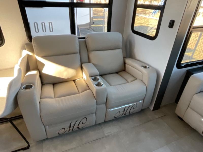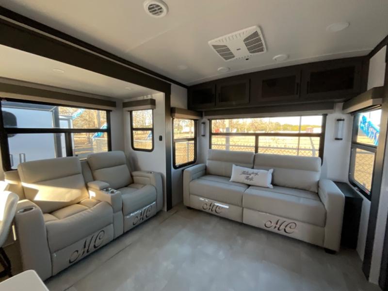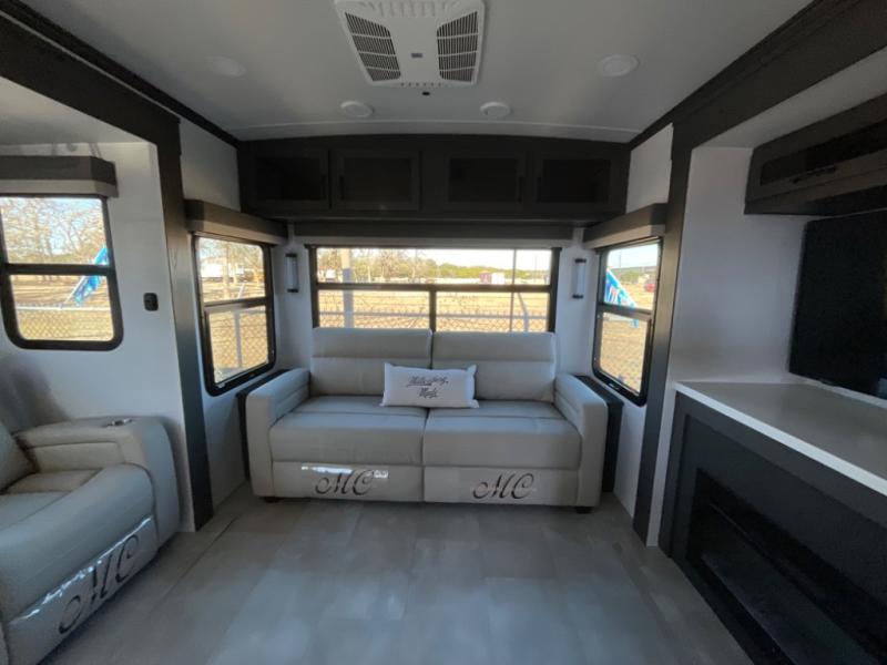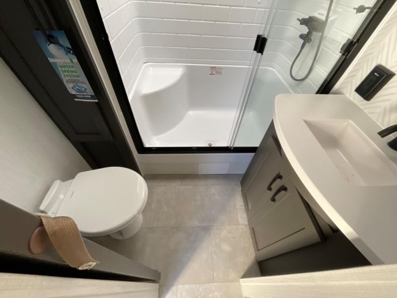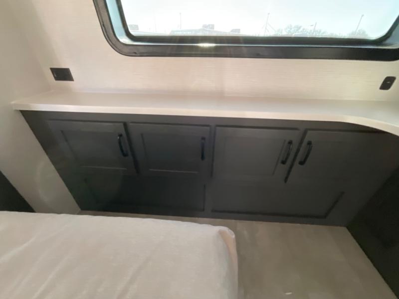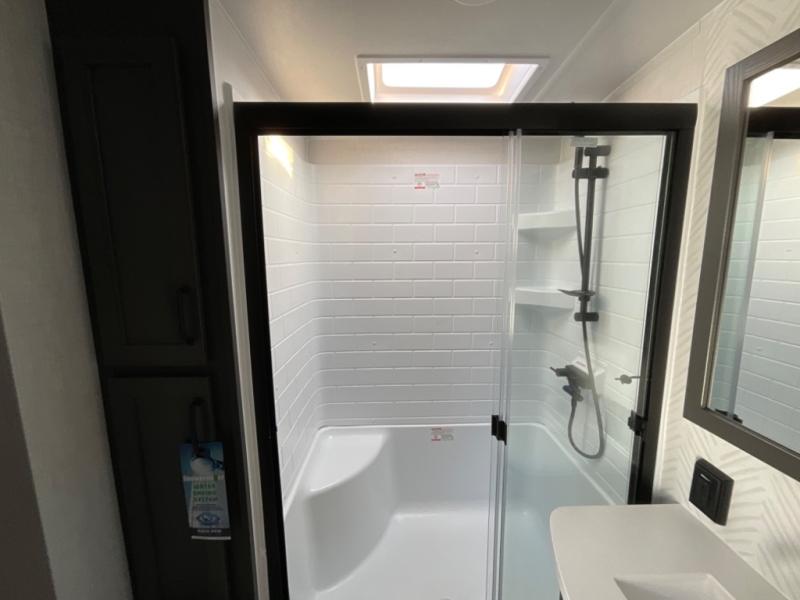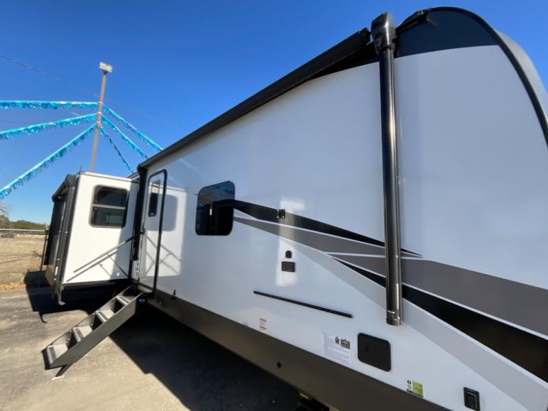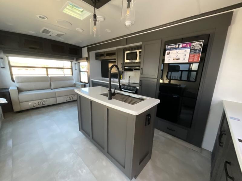 You're going to love the amount of natural light in this model with large windows in the back and the door side. The chef of the group will love the kitchen island, and there is tons of storage space for dishes, food, and knickknacks. The entertainment center with a Smart TV will allow you to watch movies at night, or you may just find yourselves outside under the two power awnings with LED lights. There is also an outside griddle here to cook pancakes in the morning. The king bed is sure to bring comfort, and you'll appreciate the large wardrobe to keep your clothes tidy. There is even washer and dryer prep if you choose to go full-time!