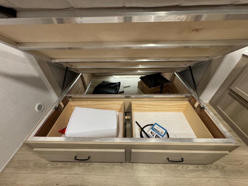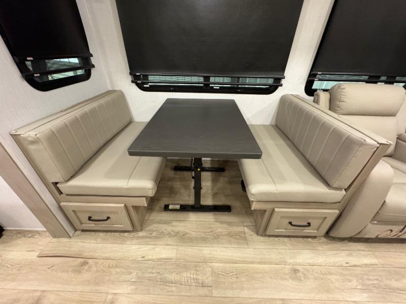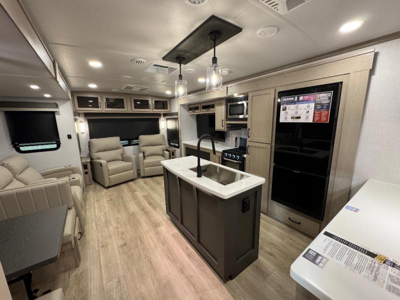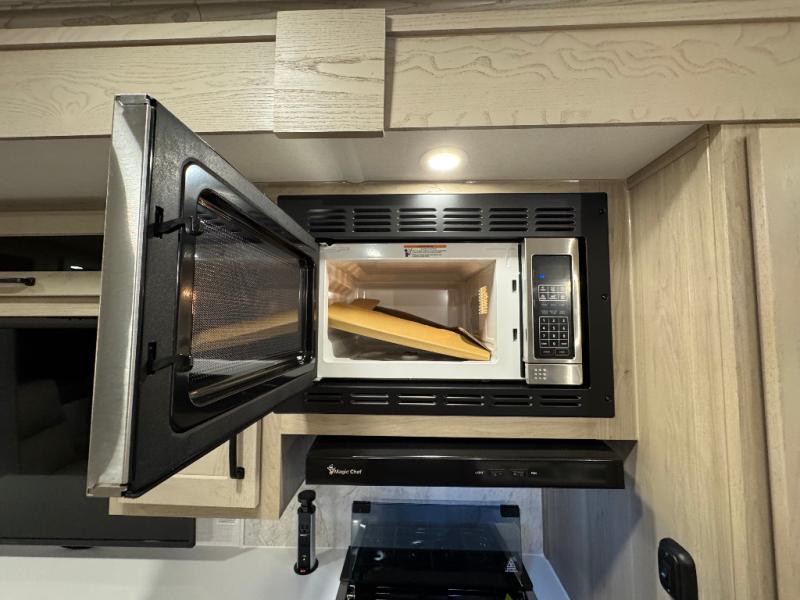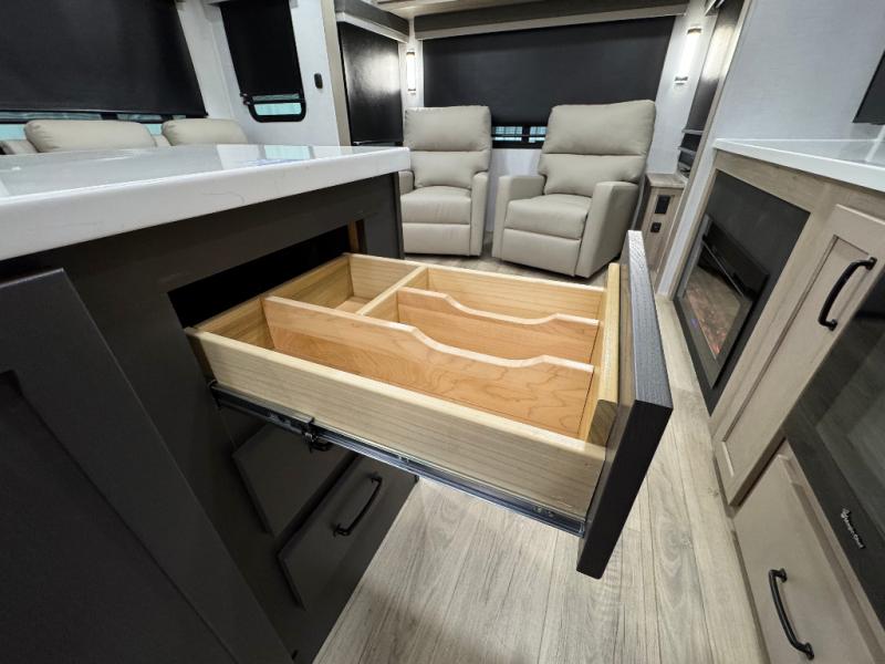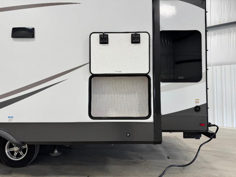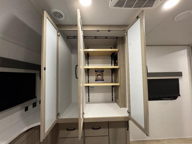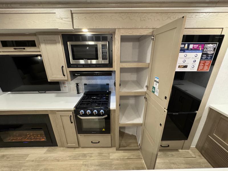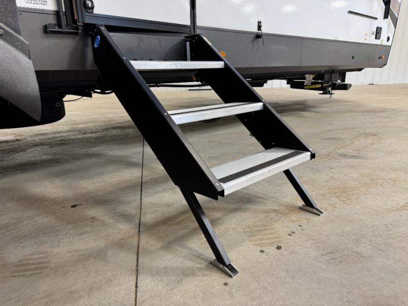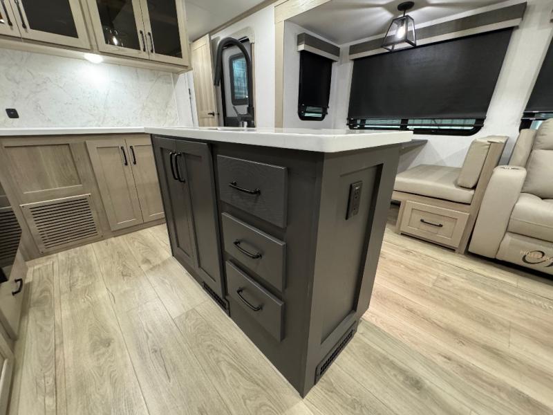You're going to love the amount of natural light in this model with large windows in the back and the door side. The chef of the group will love the kitchen island, and there is tons of storage space for dishes, food, and knickknacks. The entertainment center with a Smart TV will allow you to watch movies at night, or you may just find yourselves outside under the two power awnings with LED lights. There is also an outside griddle here to cook pancakes in the morning. The king bed is sure to bring comfort, and you'll appreciate the large wardrobe to keep your clothes tidy. There is even washer and dryer prep if you choose to go full-time!
