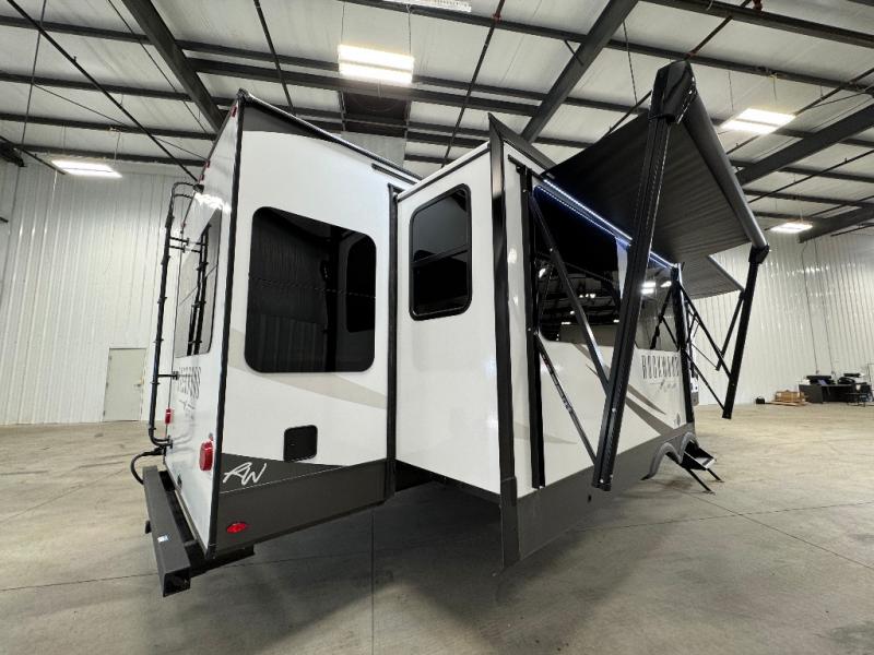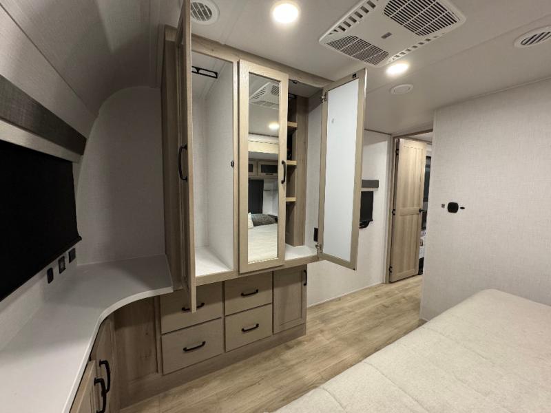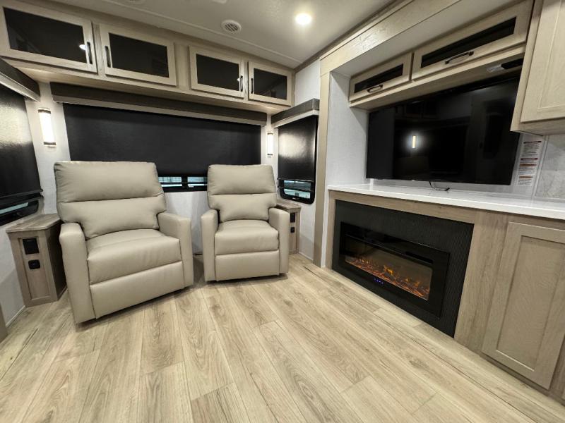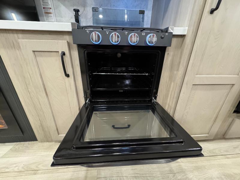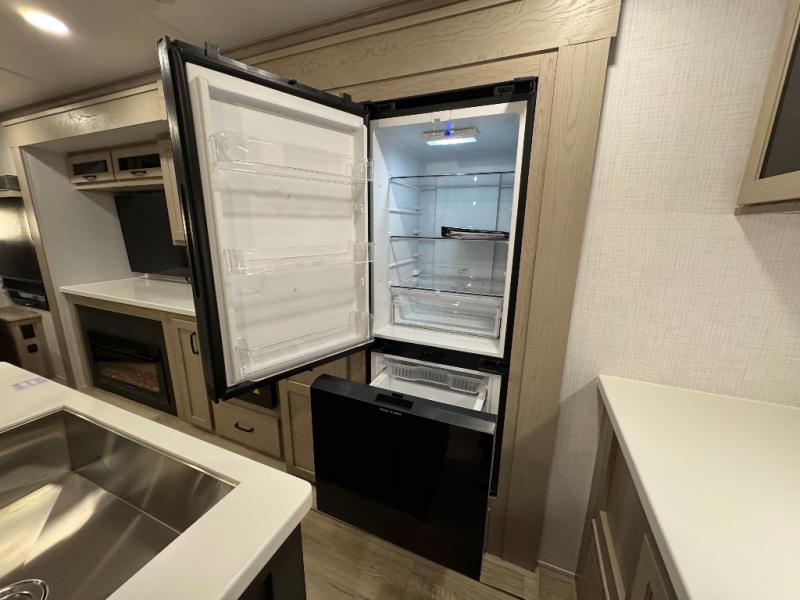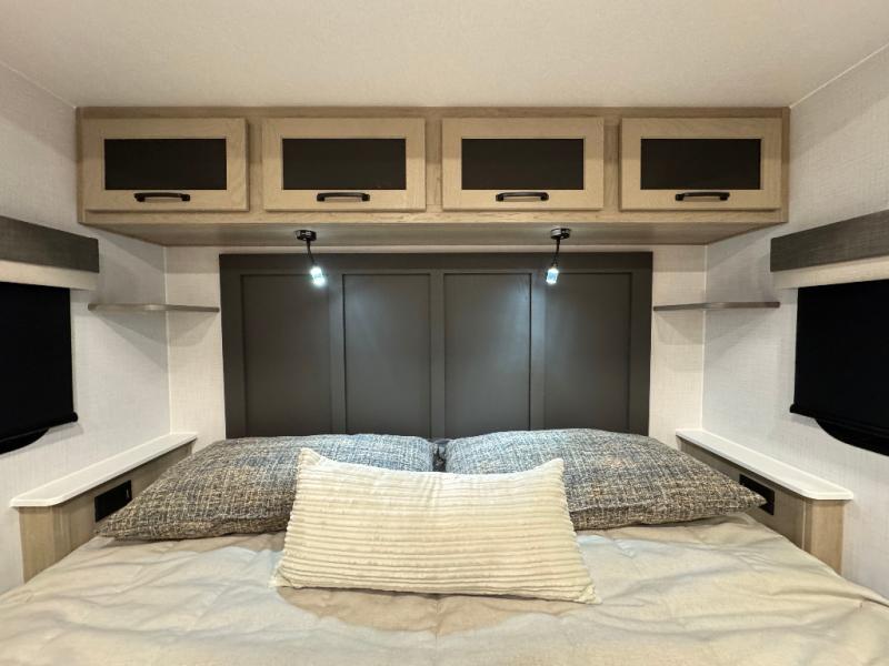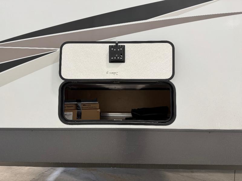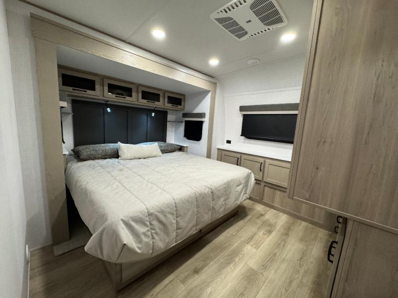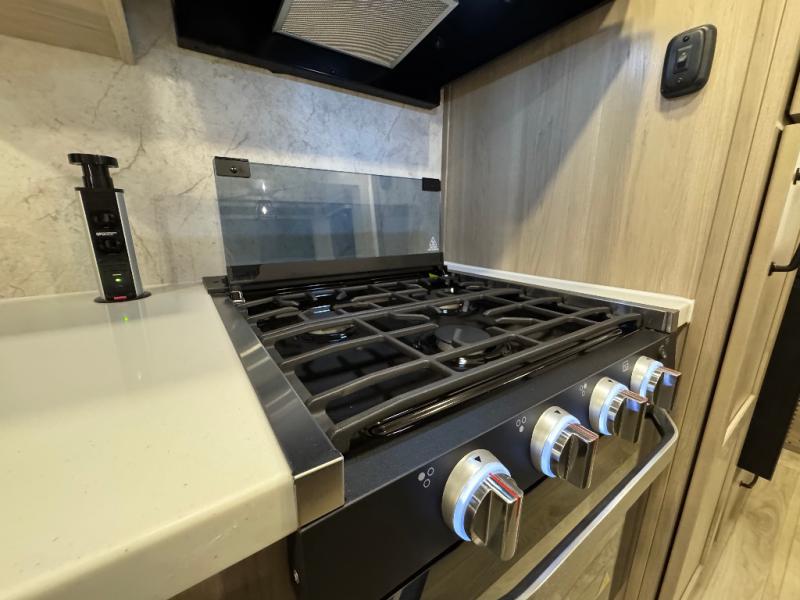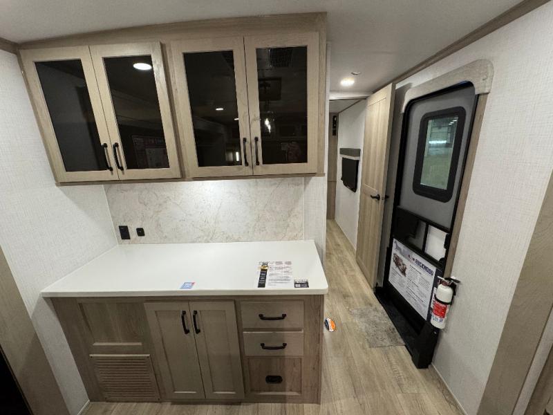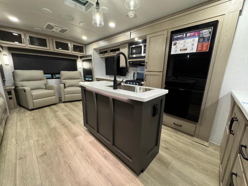 You're going to love the amount of natural light in this model with large windows in the back and the door side. The chef of the group will love the kitchen island, and there is tons of storage space for dishes, food, and knickknacks. The entertainment center with a Smart TV will allow you to watch movies at night, or you may just find yourselves outside under the two power awnings with LED lights. There is also an outside griddle here to cook pancakes in the morning. The king bed is sure to bring comfort, and you'll appreciate the large wardrobe to keep your clothes tidy. There is even washer and dryer prep if you choose to go full-time!