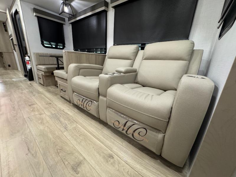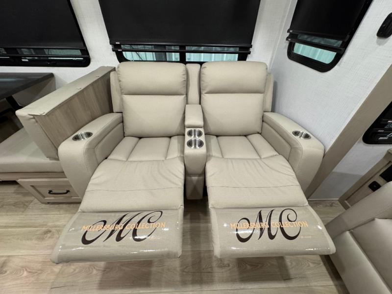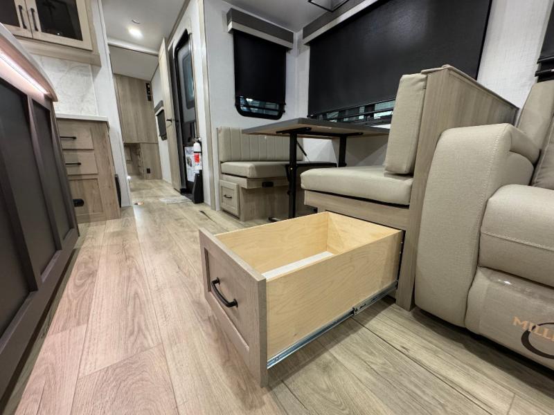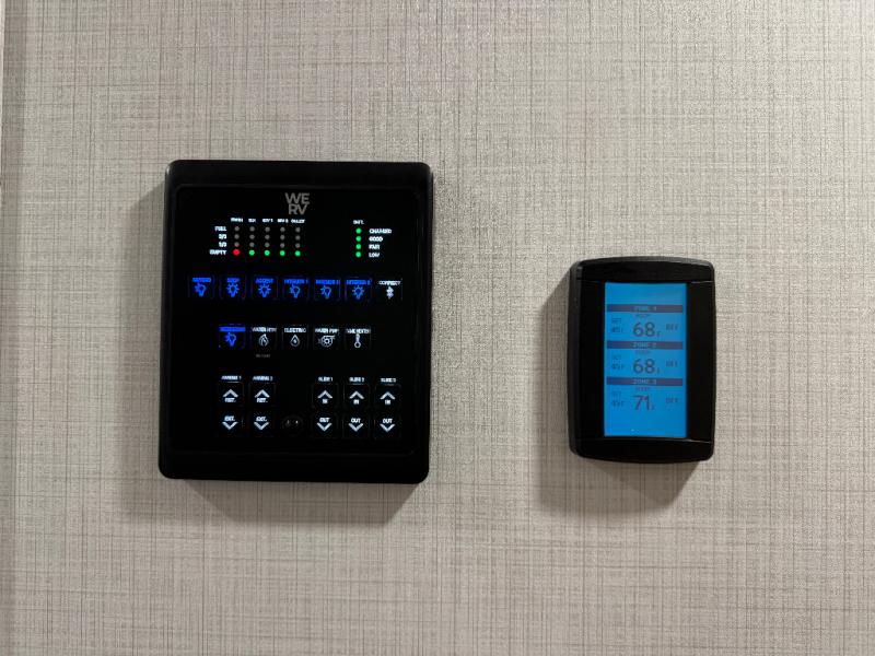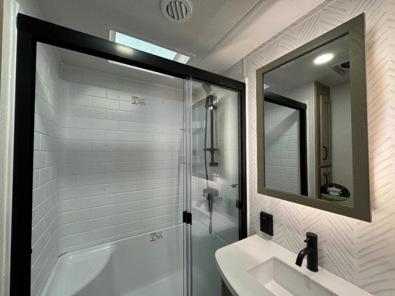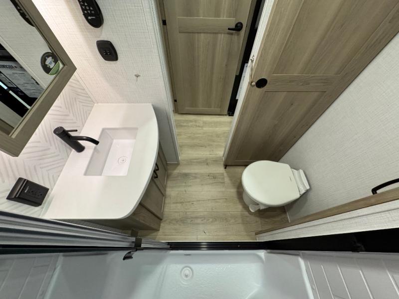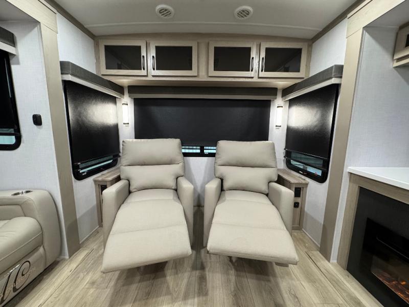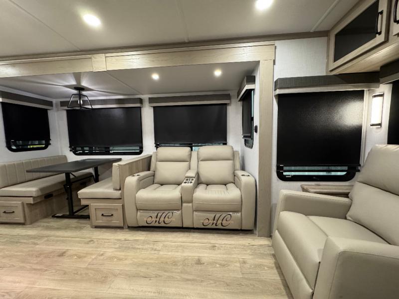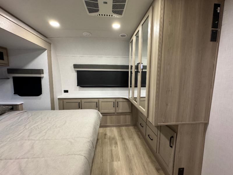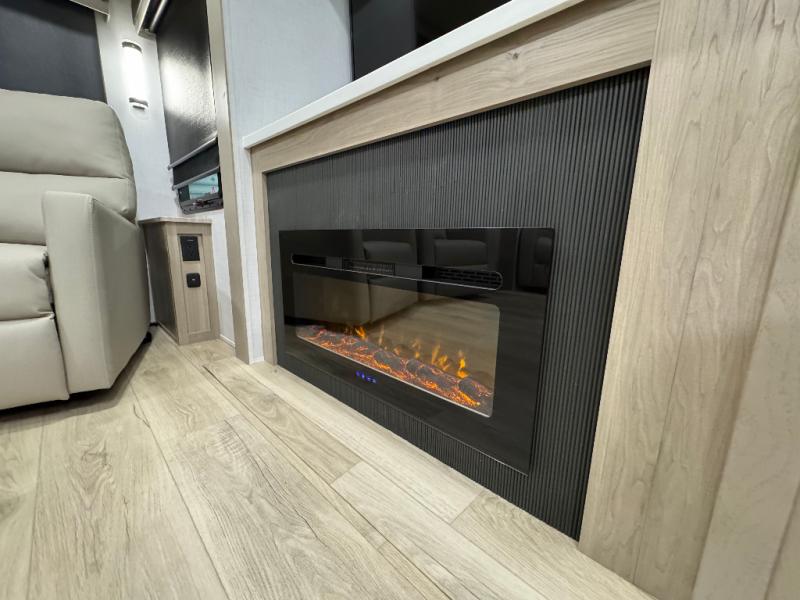 You're going to love the amount of natural light in this model with large windows in the back and the door side. The chef of the group will love the kitchen island, and there is tons of storage space for dishes, food, and knickknacks. The entertainment center with a Smart TV will allow you to watch movies at night, or you may just find yourselves outside under the two power awnings with LED lights. There is also an outside griddle here to cook pancakes in the morning. The king bed is sure to bring comfort, and you'll appreciate the large wardrobe to keep your clothes tidy. There is even washer and dryer prep if you choose to go full-time!