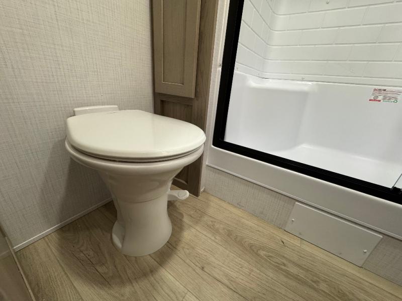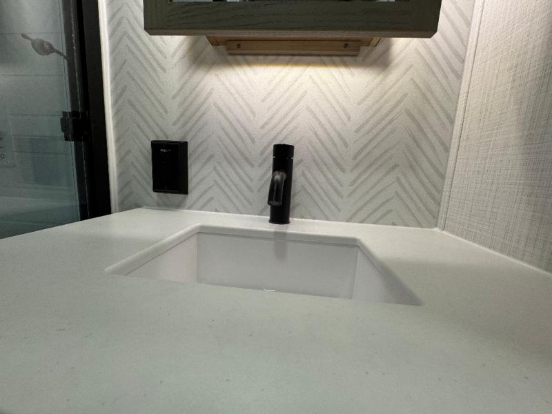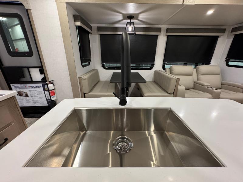 With any Rockwood Signature fifth wheel or travel trailer by Forest River RV, you will enjoy superior construction that includes laminated white fiberglass sidewalls, a radius roof with vaulted interior ceilings, plus radiant foil insulation and an enclosed underbelly for use in all types of weather. Some convenient exterior features include Keyed Alike locks, a rear ladder, a 200W solar panel, and a tire pressure monitor system with a monitor for added safety. The interior offers a One Touch OneControl panel with WeRV app control, for lights, awning, slides, water heater and more, and the Air 360+ omnidirectional antenna with WiFi prep lets you work while away from home if needed. You will also appreciate the interior vaulted ceilings, residential soft close doors and drawers, solid surface kitchen countertops, and designer kitchen backsplash!
