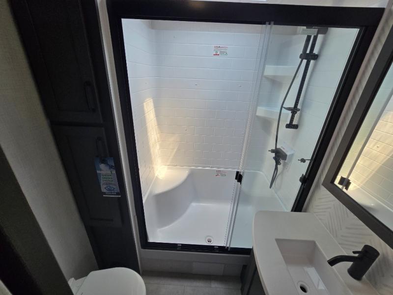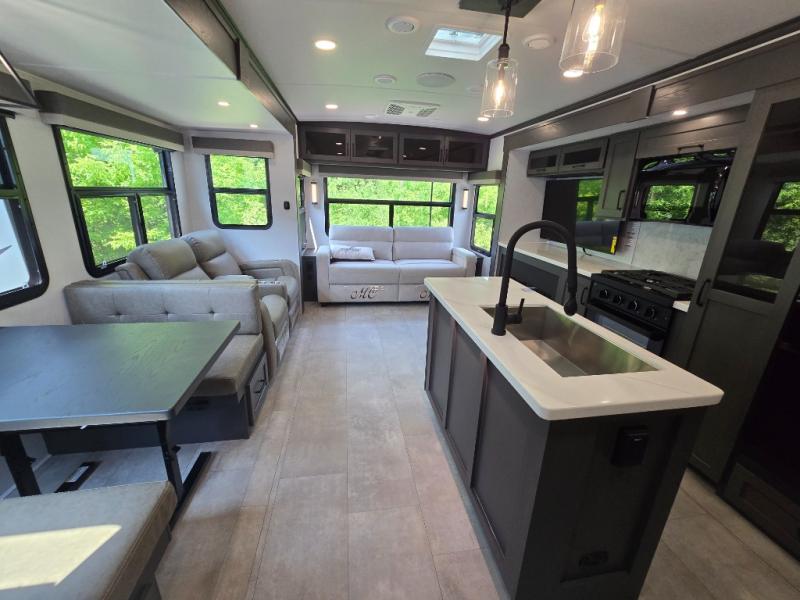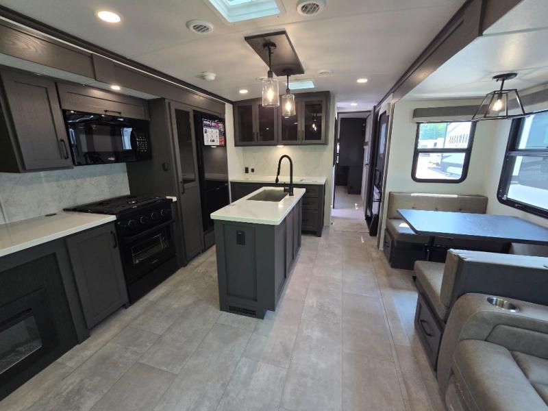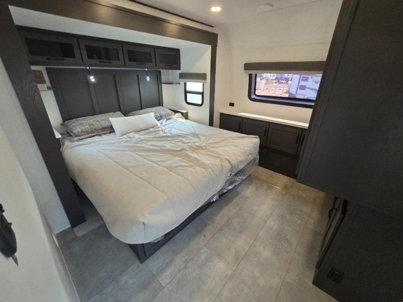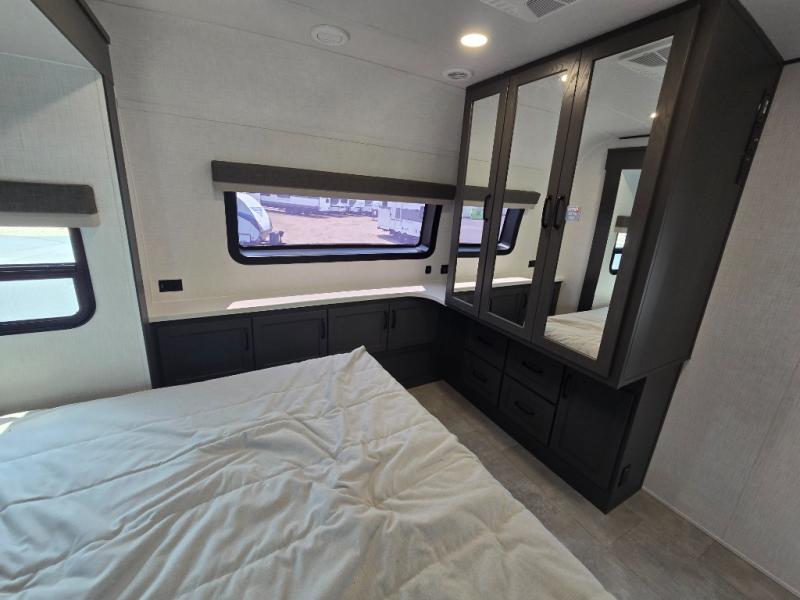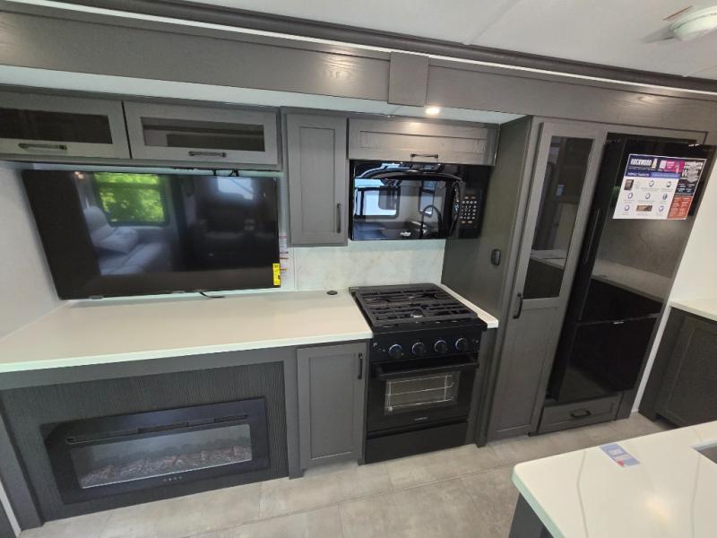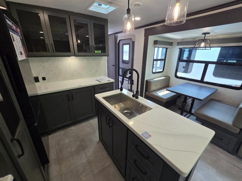 You're going to love the amount of natural light in this model with large windows in the back and the door side. The chef of the group will love the kitchen island, and there is tons of storage space for dishes, food, and knickknacks. The entertainment center with a Smart TV will allow you to watch movies at night, or you may just find yourselves outside under the two power awnings with LED lights. There is also an outside griddle here to cook pancakes in the morning. The king bed is sure to bring comfort, and you'll appreciate the large wardrobe to keep your clothes tidy. There is even washer and dryer prep if you choose to go full-time!