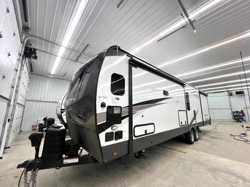 You'll love every minute spent in this front kitchen travel trailer! There is ample counter space to prep meals, plus a spacious kitchen island with a pull-out trash can. After lunch is made, you can dine at the table with chairs and a bench, or take your plate outdoors to eat under the two power awnings. Once you're back inside, you can relax on the theater seat across from the Smart TV and fireplace, and the hide-a-bed sofa here will provide sleeping space for guests. This unit also includes a rear private bedroom with a king bed slide out, a dresser, and a wardrobe with washer and dryer prep if you choose to add those appliances!