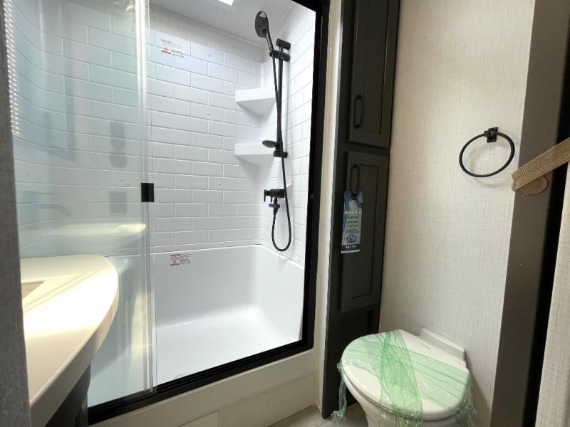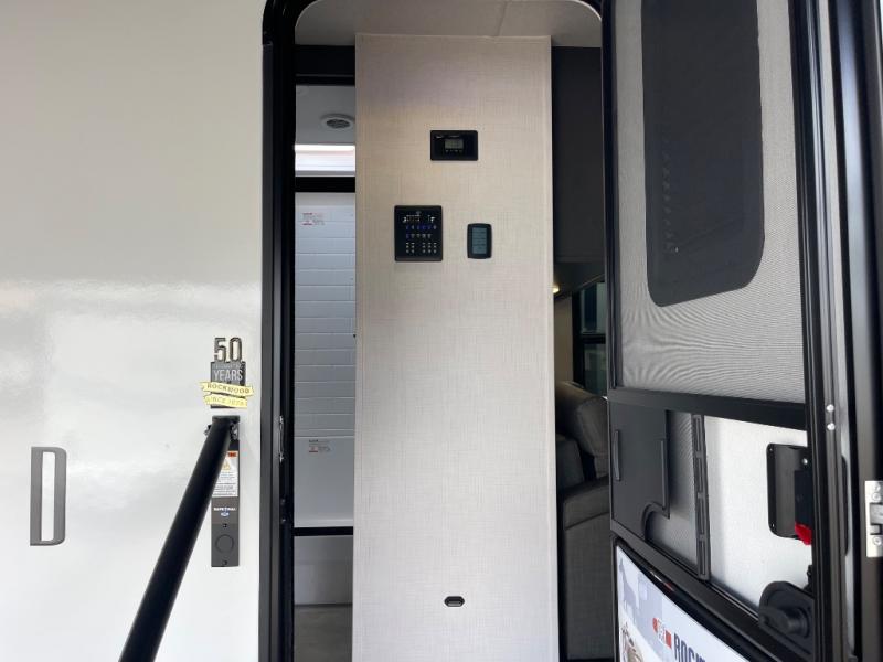 With any Rockwood Signature fifth wheel or travel trailer by Forest River RV, you will enjoy superior construction that includes laminated white fiberglass sidewalls, a radius roof with vaulted interior ceilings, plus radiant foil insulation and an enclosed underbelly for use in all types of weather. Some convenient exterior features include Keyed Alike locks, a rear ladder, a 200W solar panel, and a tire pressure monitor system with a monitor for added safety. The interior offers a One Touch OneControl panel with WeRV app control, for lights, awning, slides, water heater and more, and the Air 360+ omnidirectional antenna with WiFi prep lets you work while away from home if needed. You will also appreciate the interior vaulted ceilings, residential soft close doors and drawers, solid surface kitchen countertops, and designer kitchen backsplash!