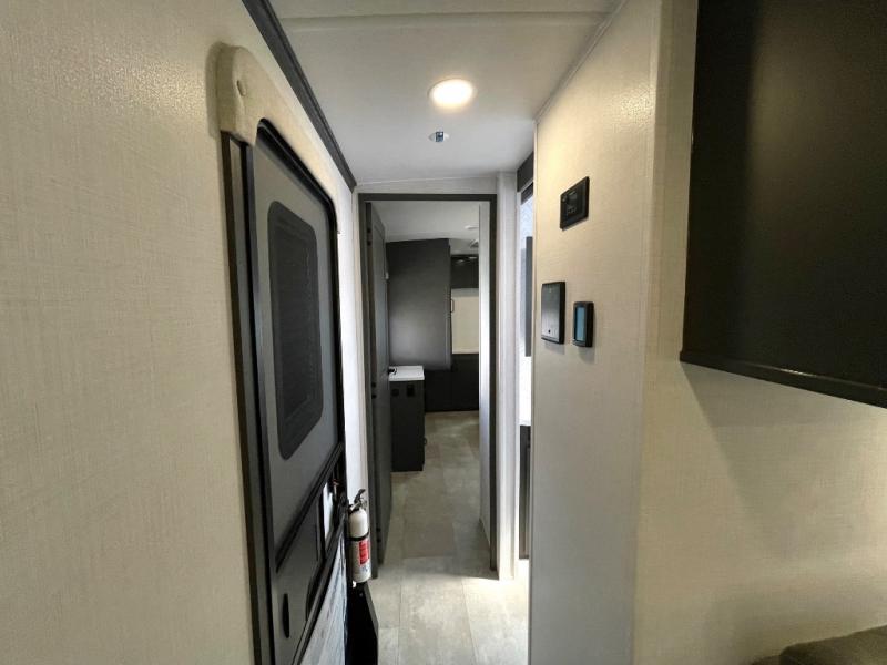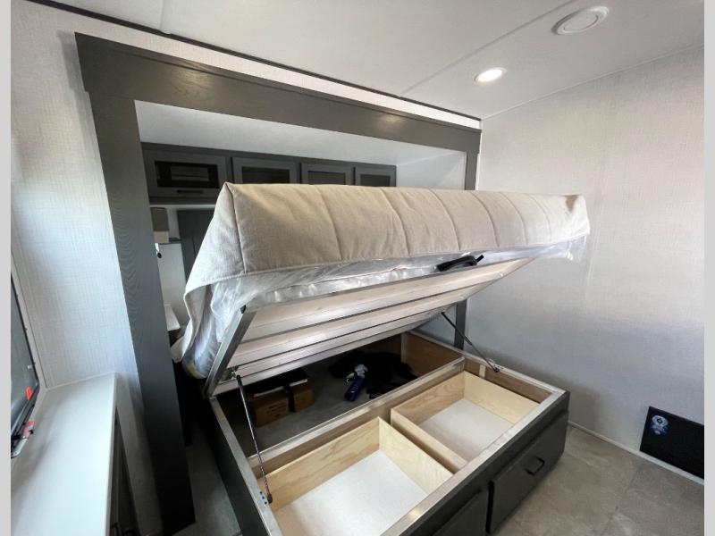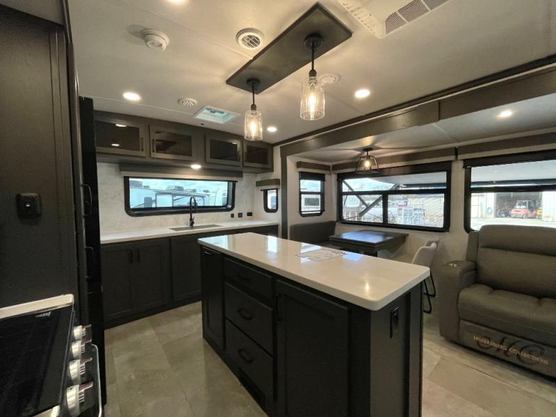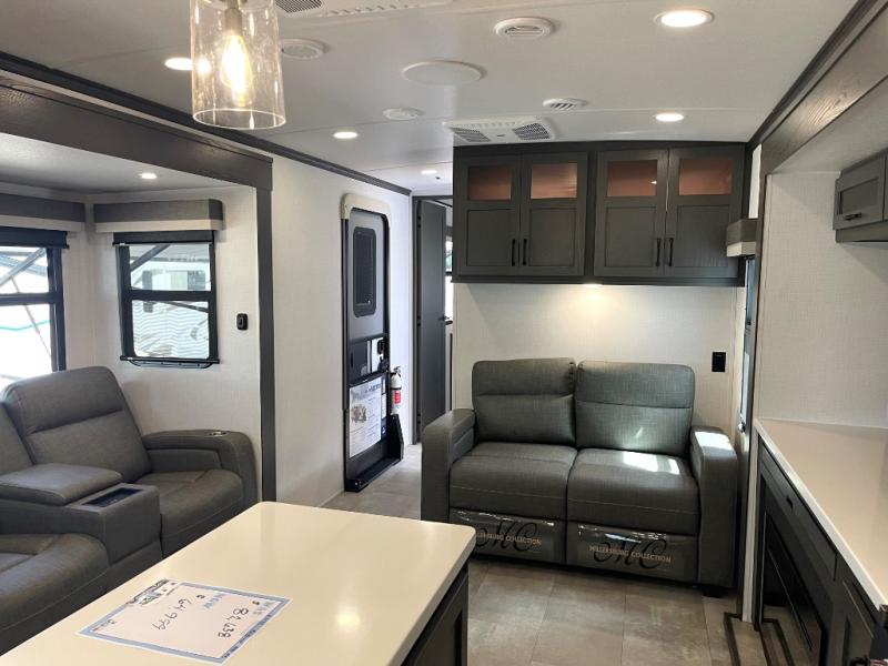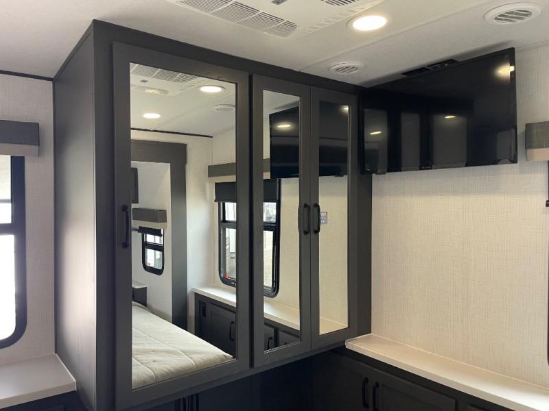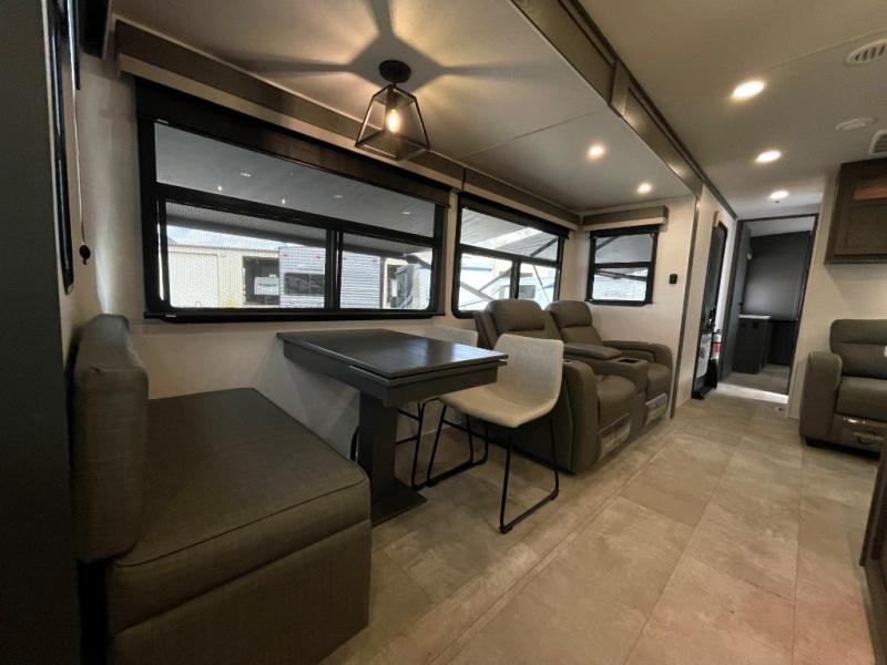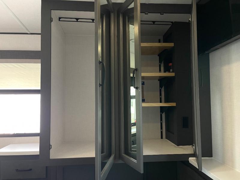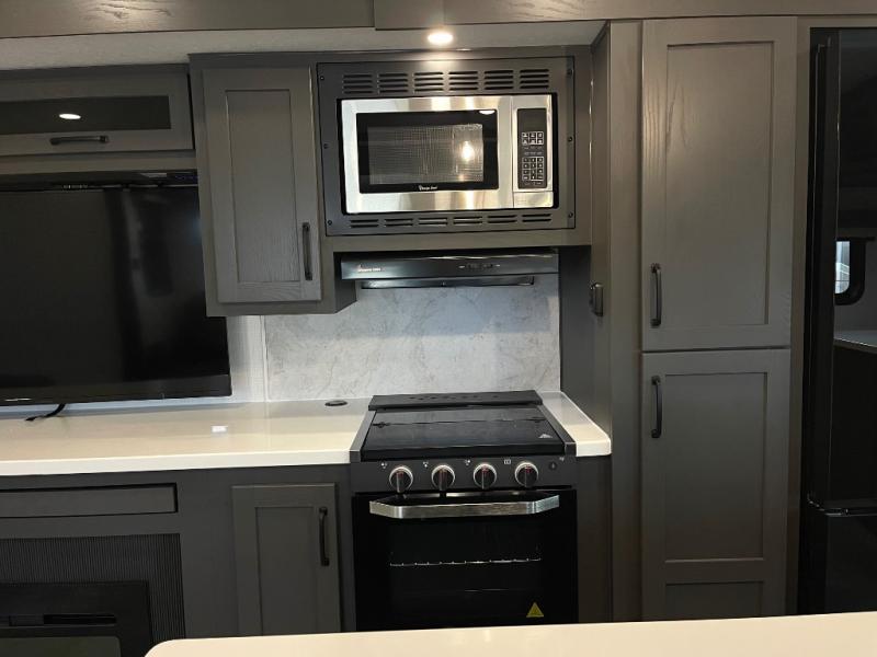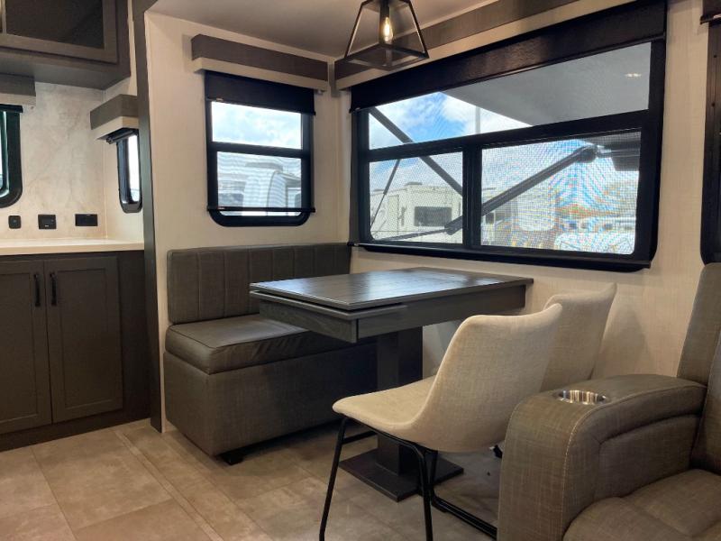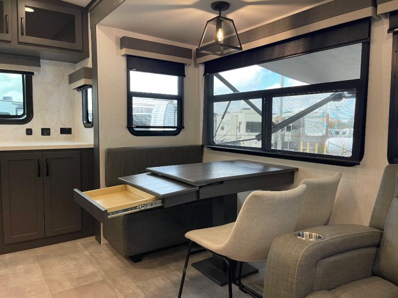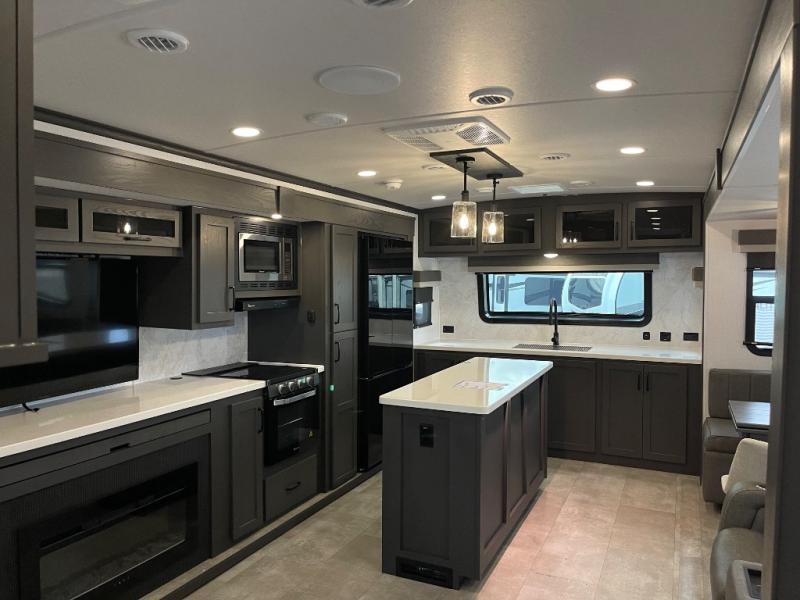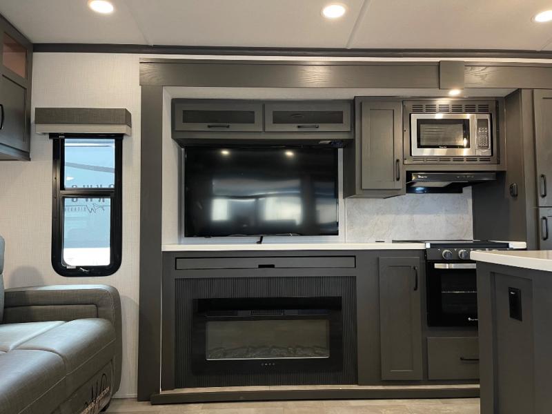 You'll love every minute spent in this front kitchen travel trailer! There is ample counter space to prep meals, plus a spacious kitchen island with a pull-out trash can. After lunch is made, you can dine at the table with chairs and a bench, or take your plate outdoors to eat under the two power awnings. Once you're back inside, you can relax on the theater seat across from the Smart TV and fireplace, and the hide-a-bed sofa here will provide sleeping space for guests. This unit also includes a rear private bedroom with a king bed slide out, a dresser, and a wardrobe with washer and dryer prep if you choose to add those appliances!