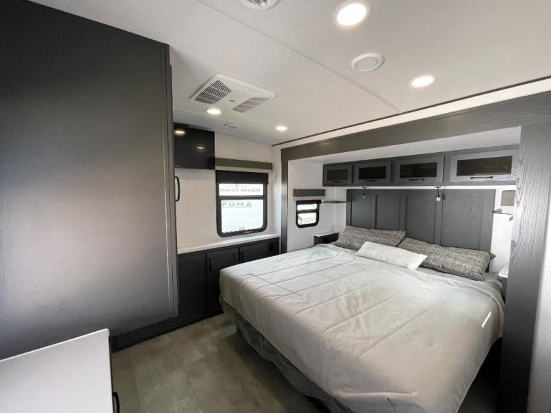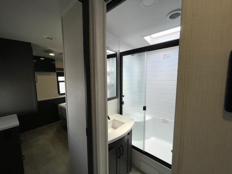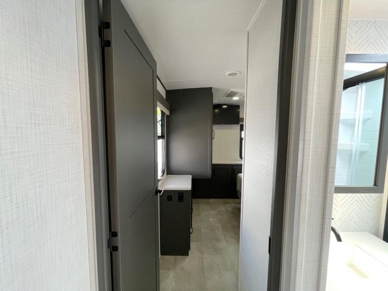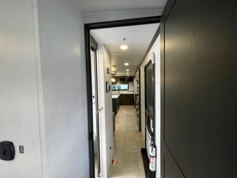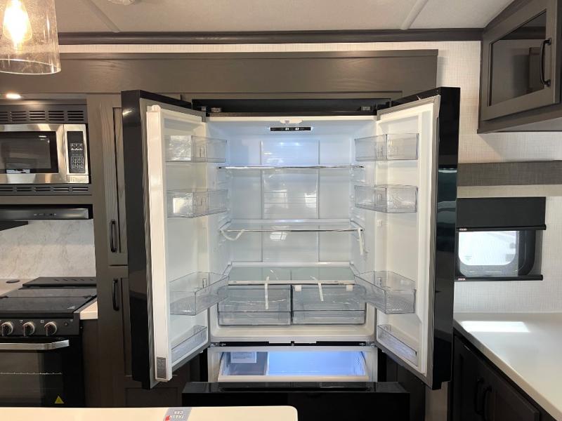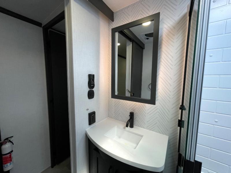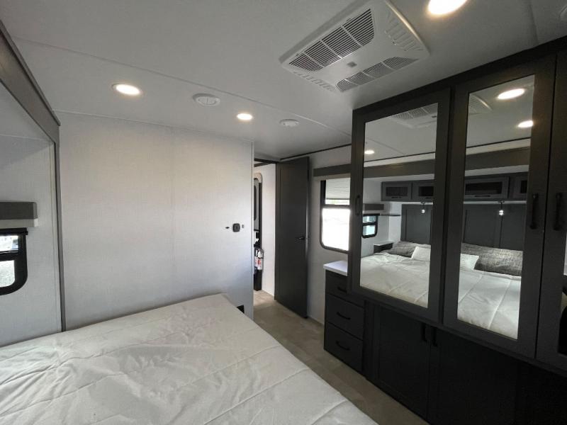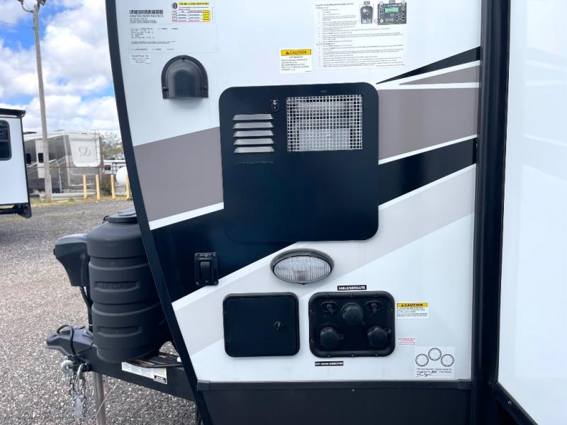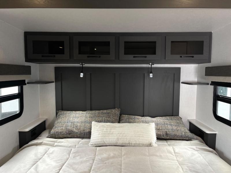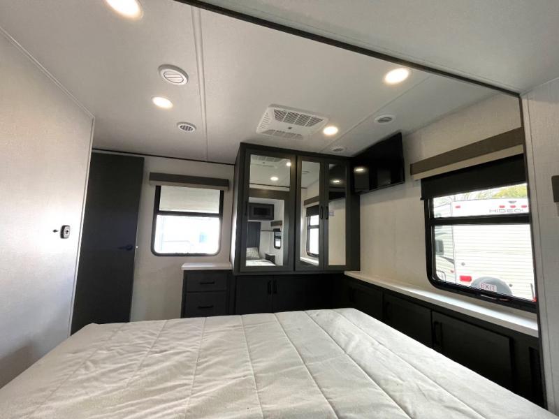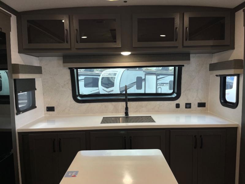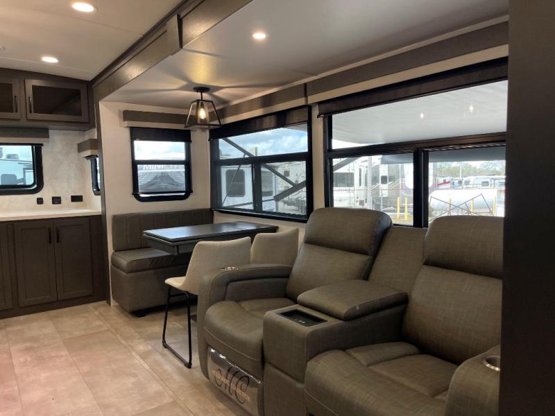 You'll love every minute spent in this front kitchen travel trailer! There is ample counter space to prep meals, plus a spacious kitchen island with a pull-out trash can. After lunch is made, you can dine at the table with chairs and a bench, or take your plate outdoors to eat under the two power awnings. Once you're back inside, you can relax on the theater seat across from the Smart TV and fireplace, and the hide-a-bed sofa here will provide sleeping space for guests. This unit also includes a rear private bedroom with a king bed slide out, a dresser, and a wardrobe with washer and dryer prep if you choose to add those appliances!