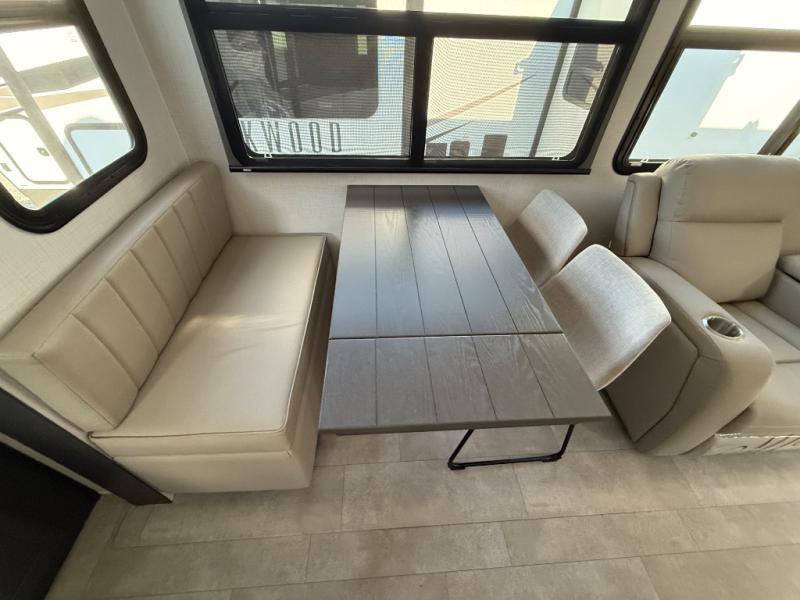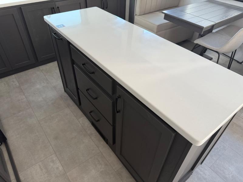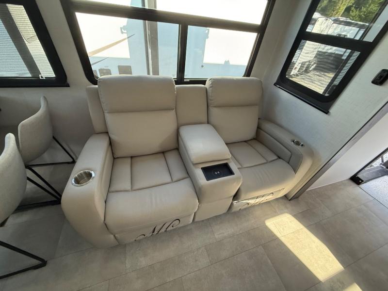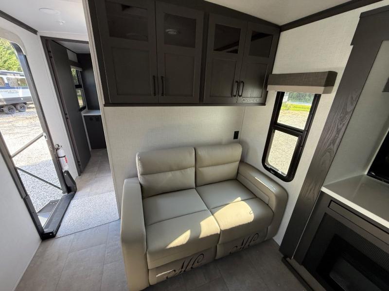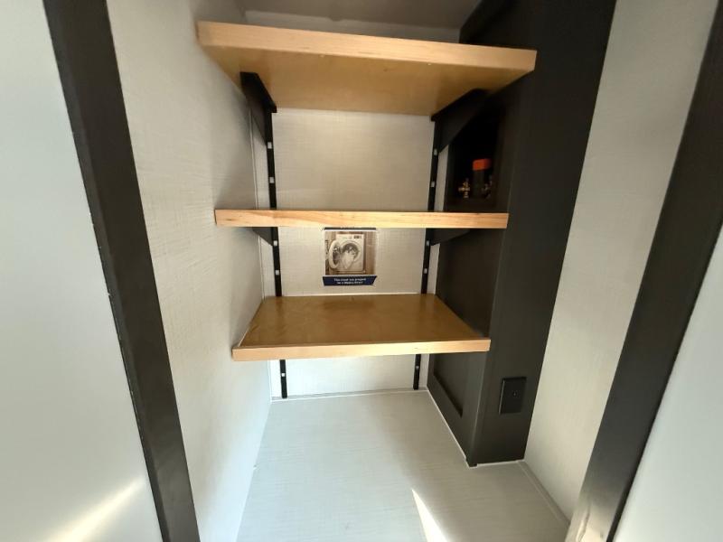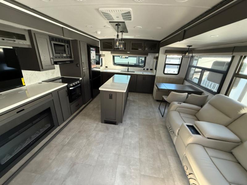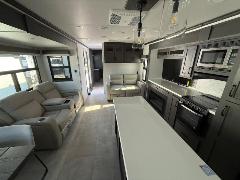 You'll love every minute spent in this front kitchen travel trailer! There is ample counter space to prep meals, plus a spacious kitchen island with a pull-out trash can. After lunch is made, you can dine at the table with chairs and a bench, or take your plate outdoors to eat under the two power awnings. Once you're back inside, you can relax on the theater seat across from the Smart TV and fireplace, and the hide-a-bed sofa here will provide sleeping space for guests. This unit also includes a rear private bedroom with a king bed slide out, a dresser, and a wardrobe with washer and dryer prep if you choose to add those appliances!