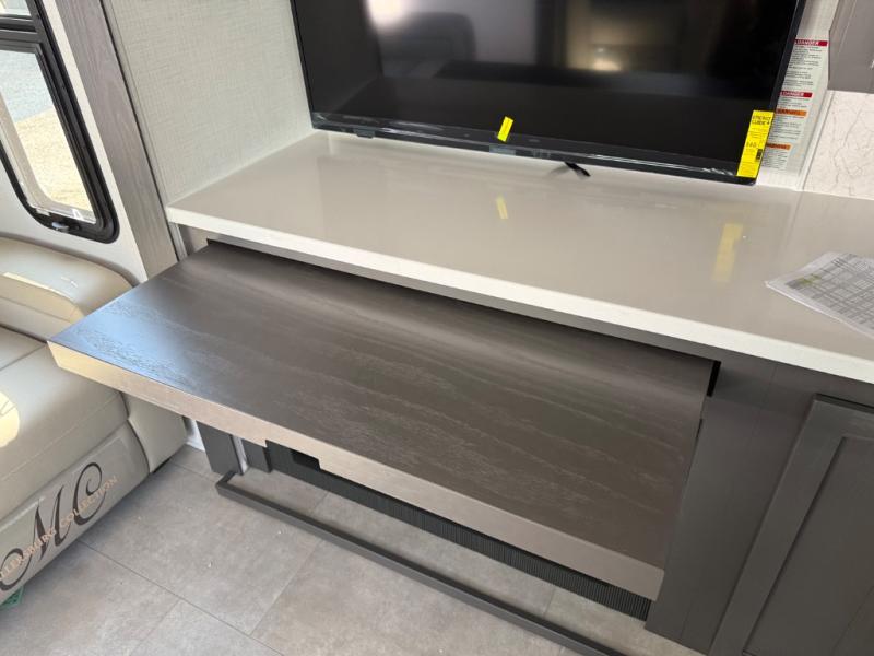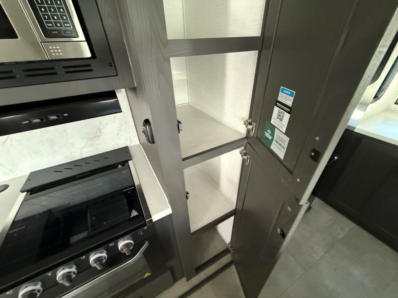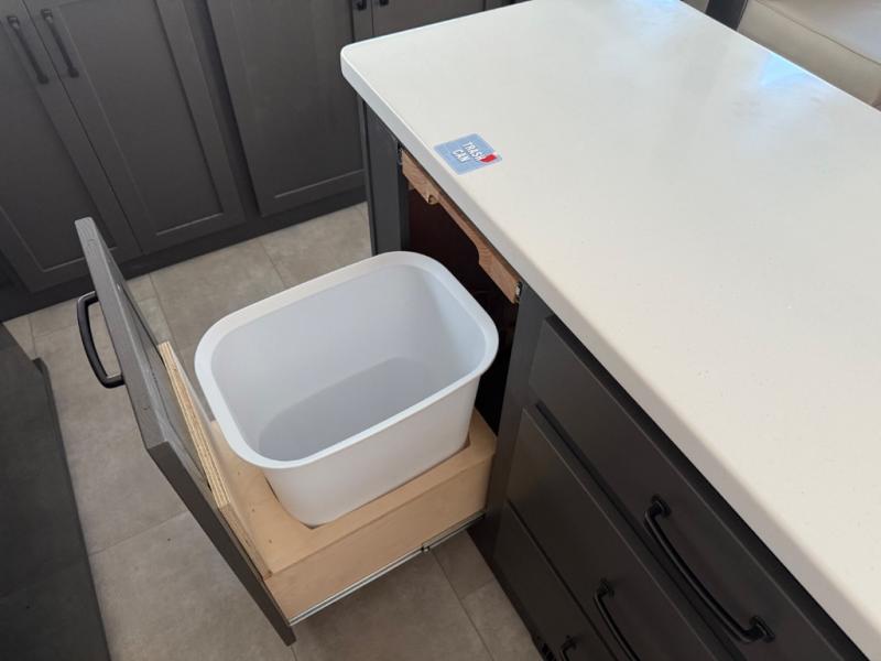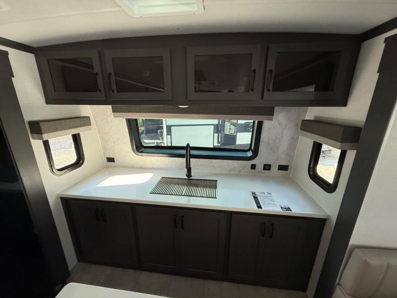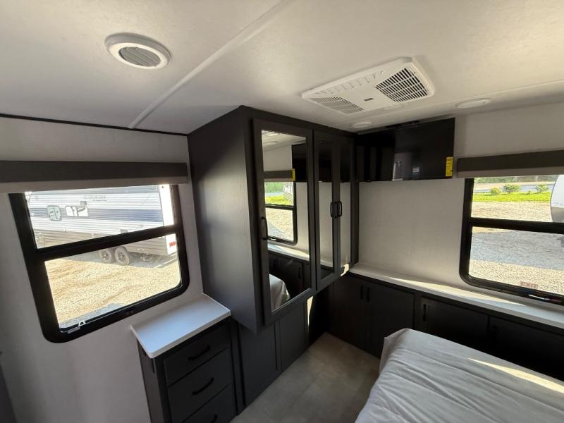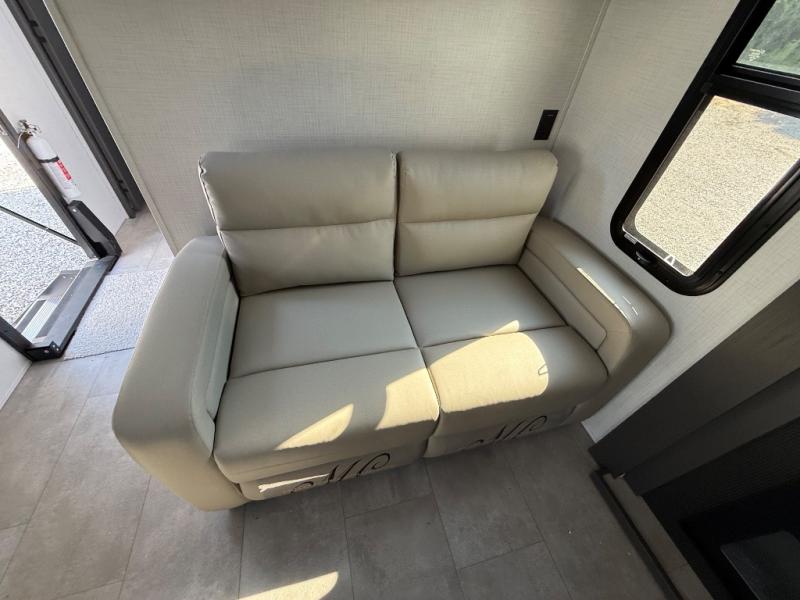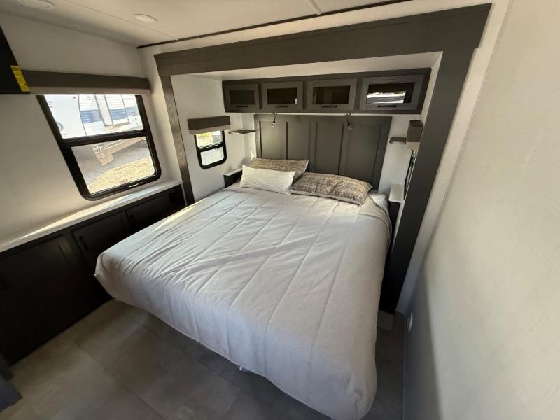 You'll love every minute spent in this front kitchen travel trailer! There is ample counter space to prep meals, plus a spacious kitchen island with a pull-out trash can. After lunch is made, you can dine at the table with chairs and a bench, or take your plate outdoors to eat under the two power awnings. Once you're back inside, you can relax on the theater seat across from the Smart TV and fireplace, and the hide-a-bed sofa here will provide sleeping space for guests. This unit also includes a rear private bedroom with a king bed slide out, a dresser, and a wardrobe with washer and dryer prep if you choose to add those appliances!