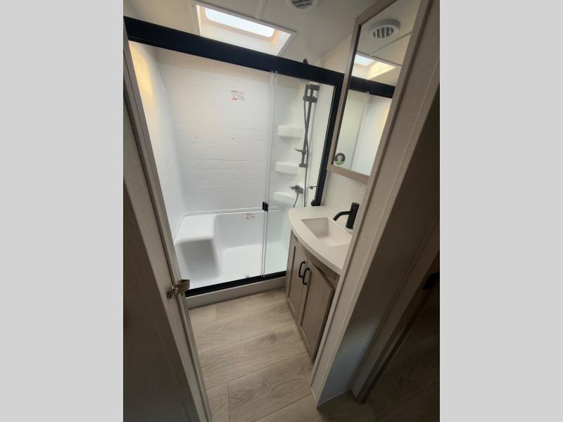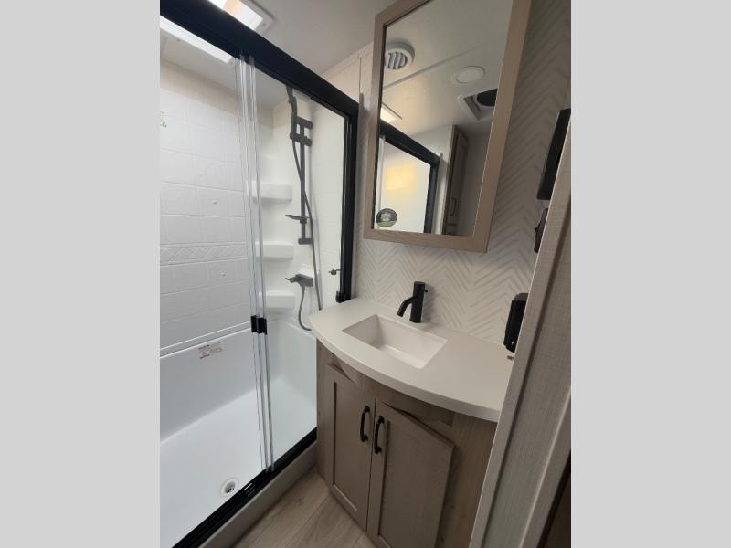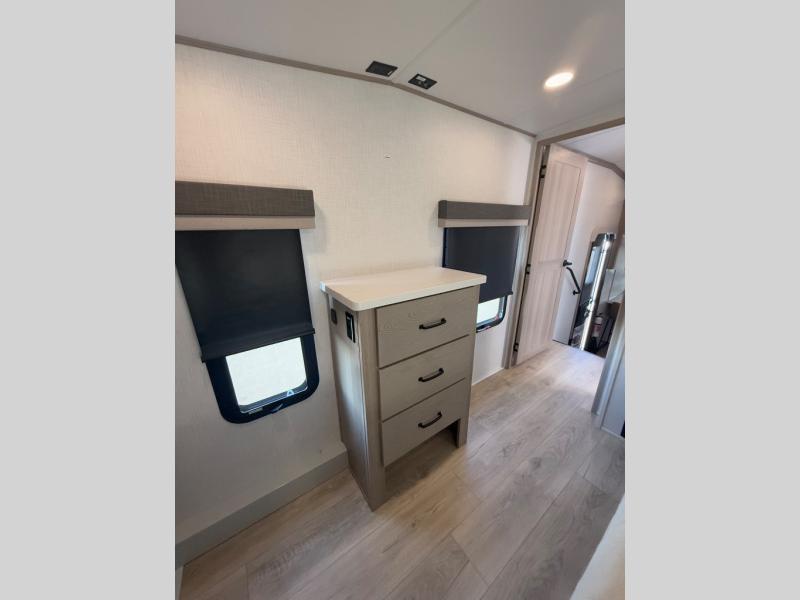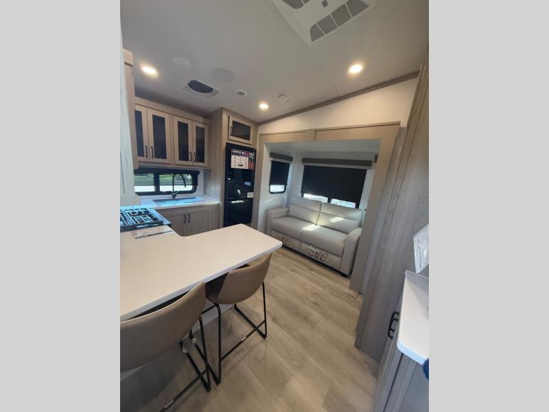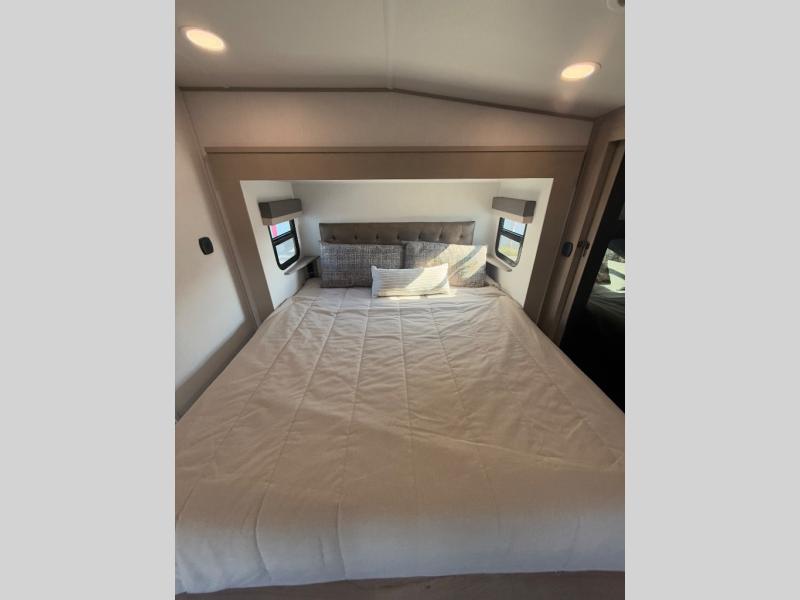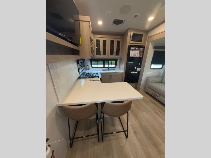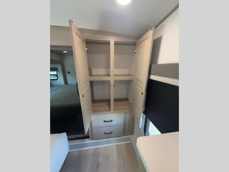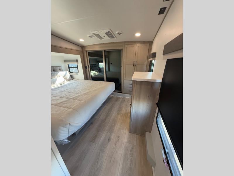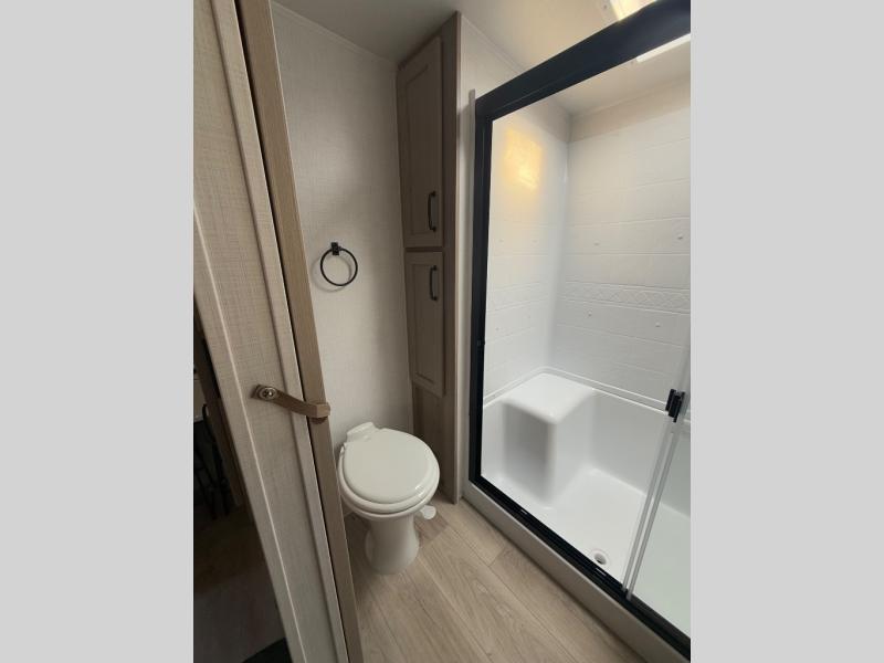 Looking for a spacious bedroom and bathroom for the perfect couple's RV with extra sleeping space for guests? This model provides a queen bed slide out for more interior floor space to get to the front wardrobe with shelves, and the dresser with a window above for great views of your campsite. The bathroom offers a shower with a seat, linen storage, and counter space for your toiletries. The main living and kitchen combined area has a hide-a-bed sofa slide that allows two guests to stay the night or you can choose the optional theater seat. There is also a breakfast bar with stools to dine at, and a U-shaped counter including appliances to make meals and store leftovers. And you will find exterior storage to bring along camping chairs and extra gear.