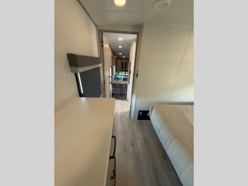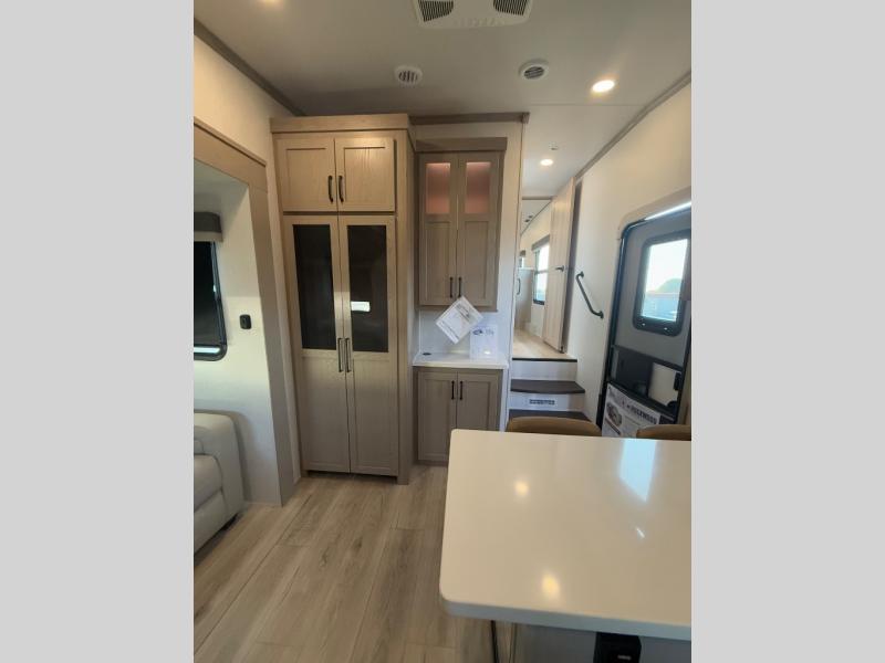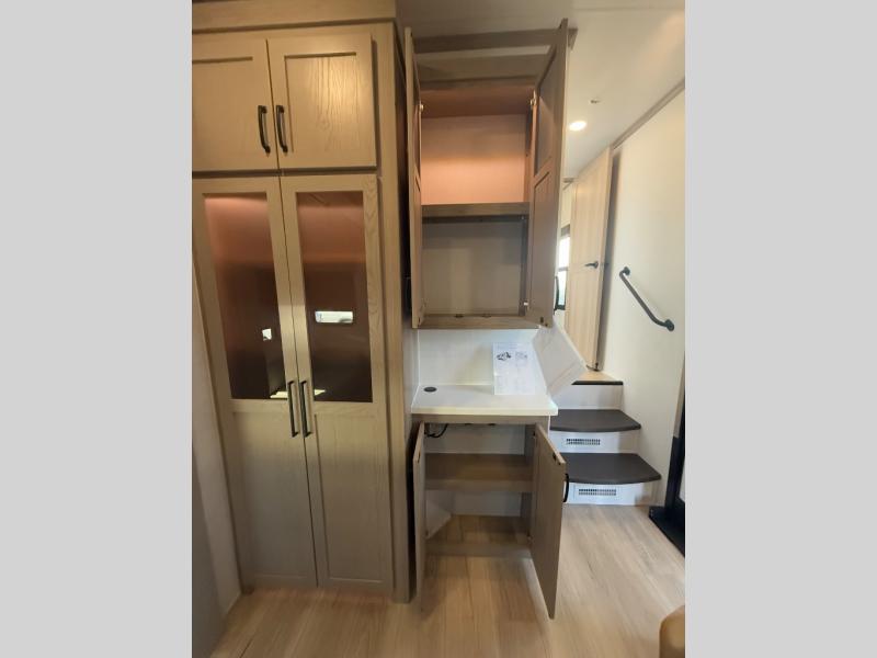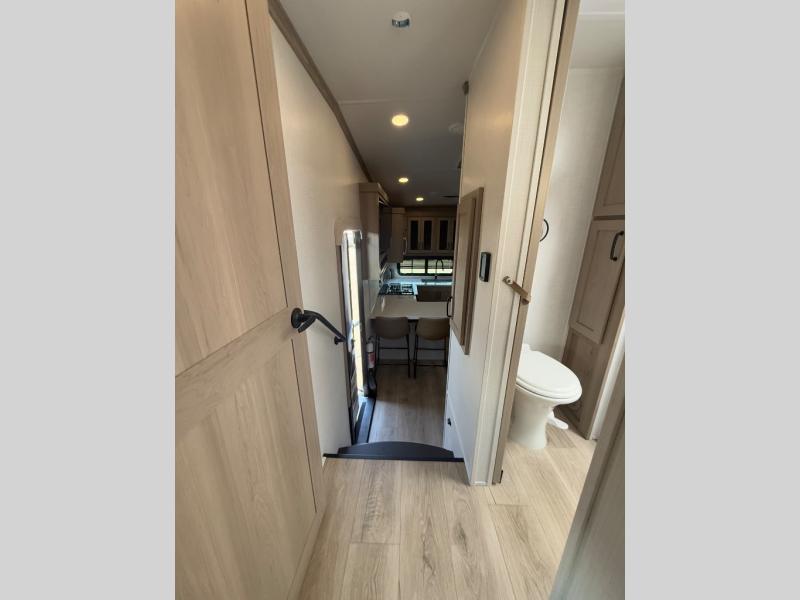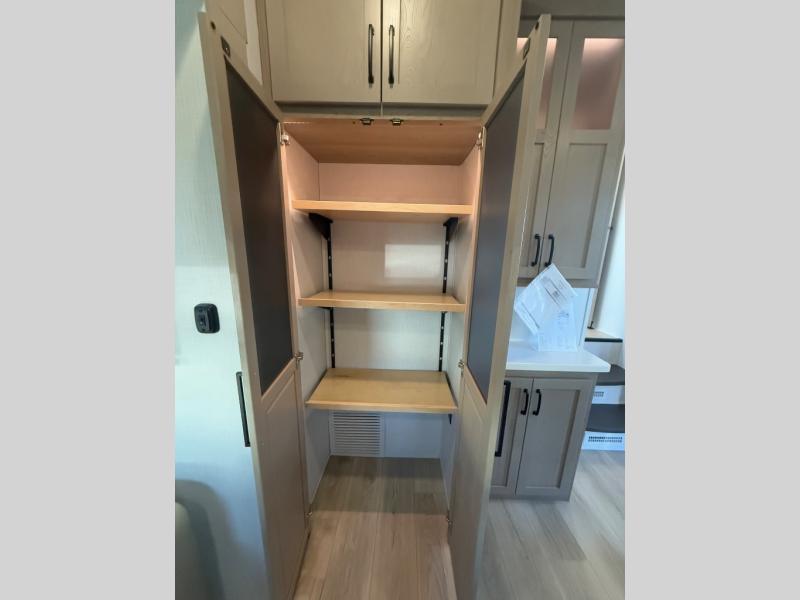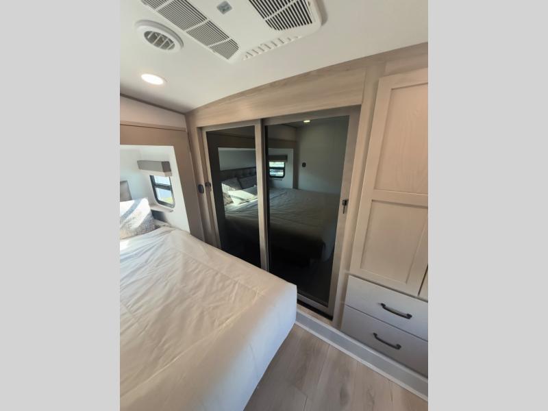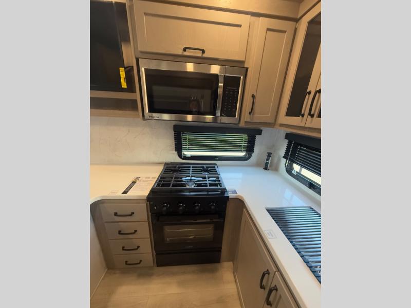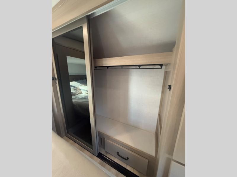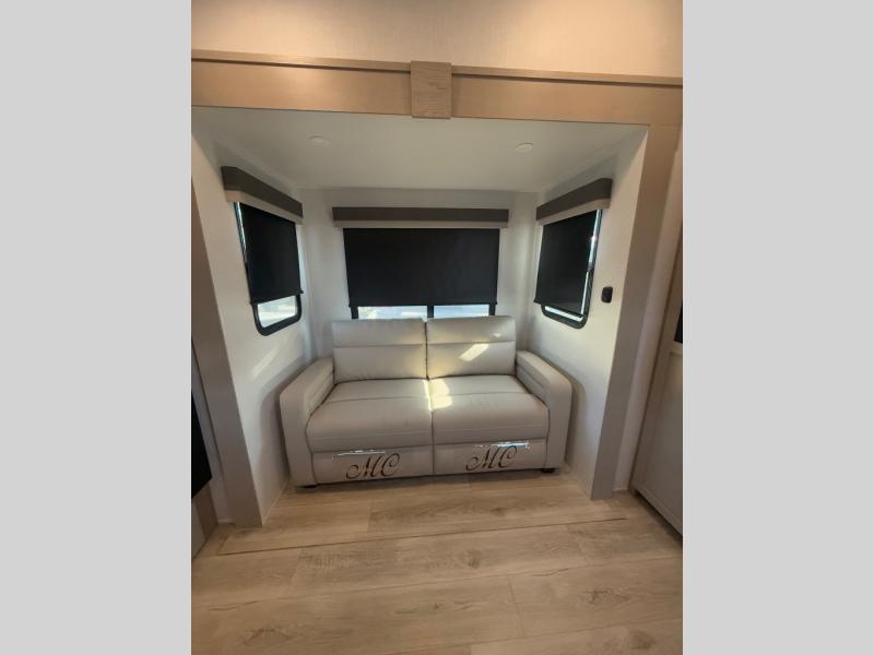 Looking for a spacious bedroom and bathroom for the perfect couple's RV with extra sleeping space for guests? This model provides a queen bed slide out for more interior floor space to get to the front wardrobe with shelves, and the dresser with a window above for great views of your campsite. The bathroom offers a shower with a seat, linen storage, and counter space for your toiletries. The main living and kitchen combined area has a hide-a-bed sofa slide that allows two guests to stay the night or you can choose the optional theater seat. There is also a breakfast bar with stools to dine at, and a U-shaped counter including appliances to make meals and store leftovers. And you will find exterior storage to bring along camping chairs and extra gear.