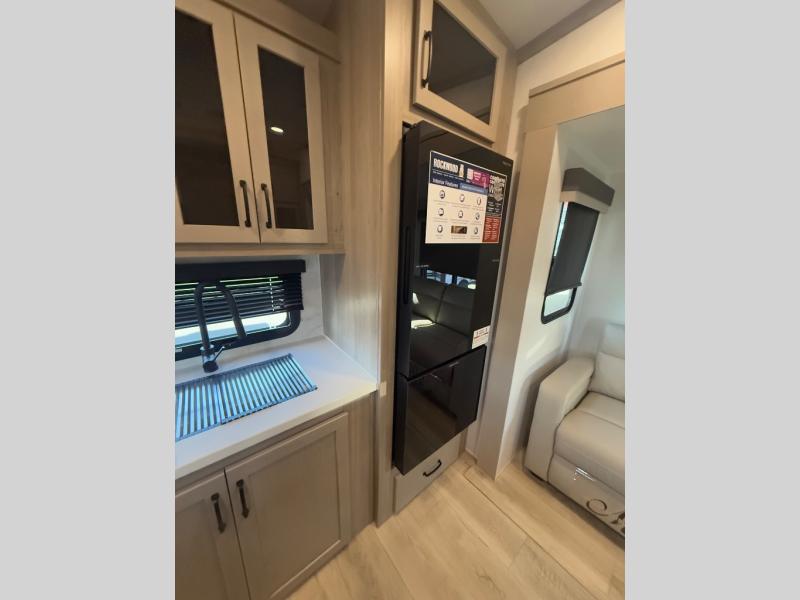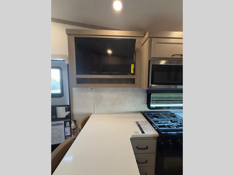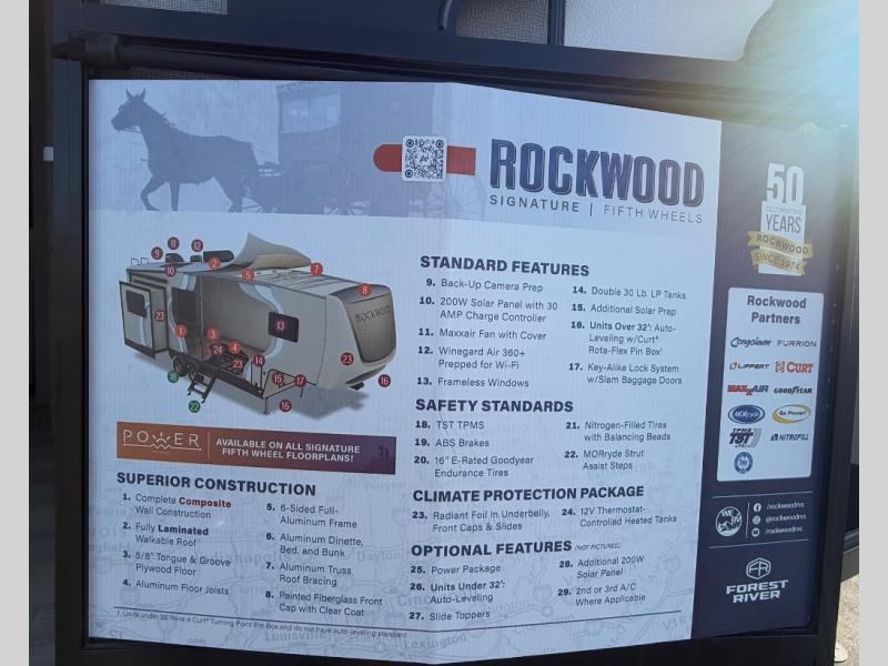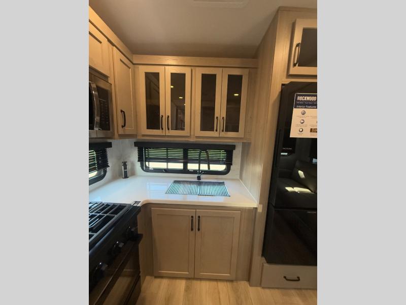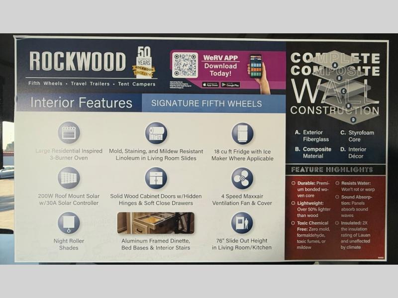 With any Rockwood Signature fifth wheel or travel trailer by Forest River RV, you will enjoy superior construction that includes laminated white fiberglass sidewalls, a radius roof with vaulted interior ceilings, plus radiant foil insulation and an enclosed underbelly for use in all types of weather. Some convenient exterior features include Keyed Alike locks, a rear ladder, a 200W solar panel, and a tire pressure monitor system with a monitor for added safety. The interior offers a One Touch OneControl panel with WeRV app control, for lights, awning, slides, water heater and more, and the Air 360+ omnidirectional antenna with WiFi prep lets you work while away from home if needed. You will also appreciate the interior vaulted ceilings, residential soft close doors and drawers, solid surface kitchen countertops, and designer kitchen backsplash!